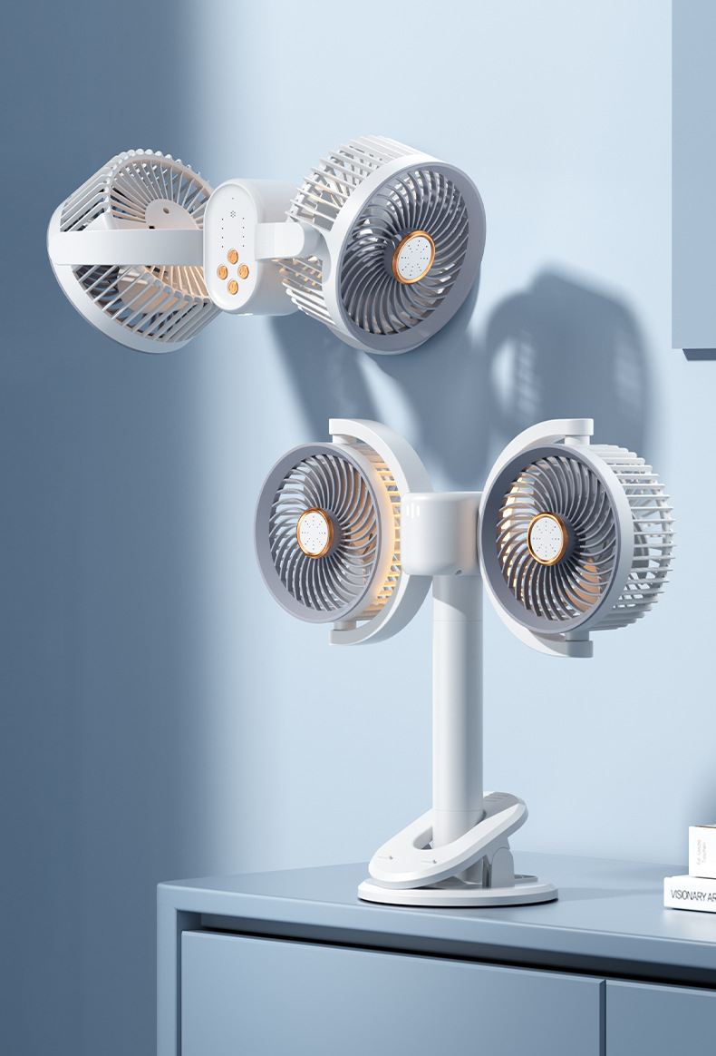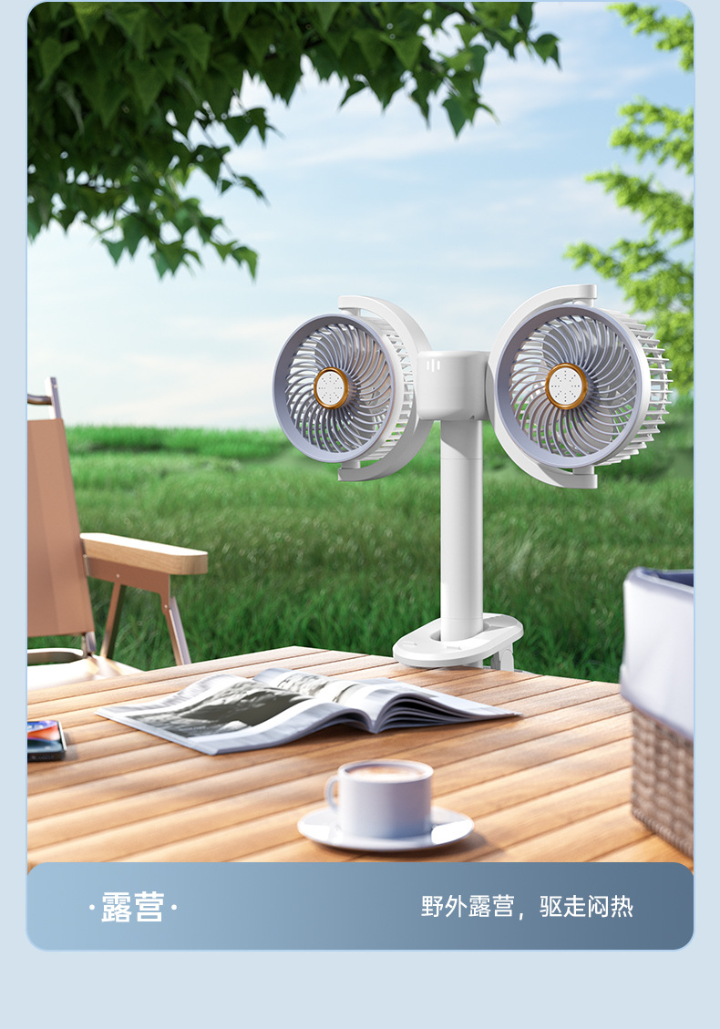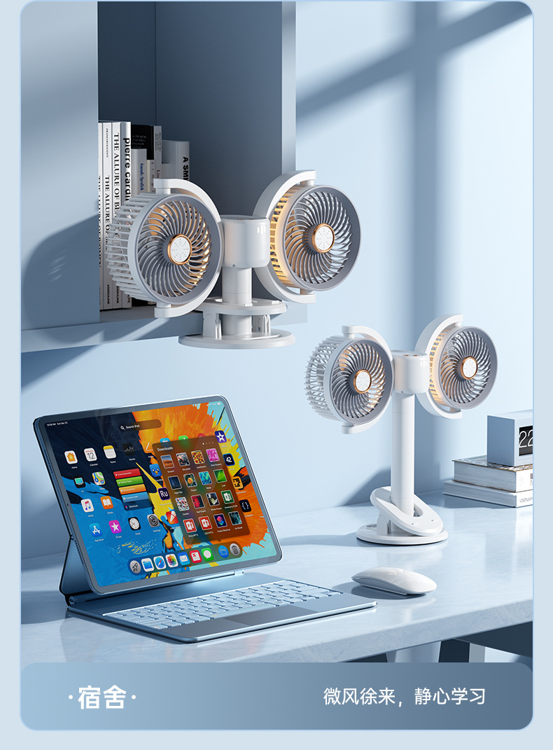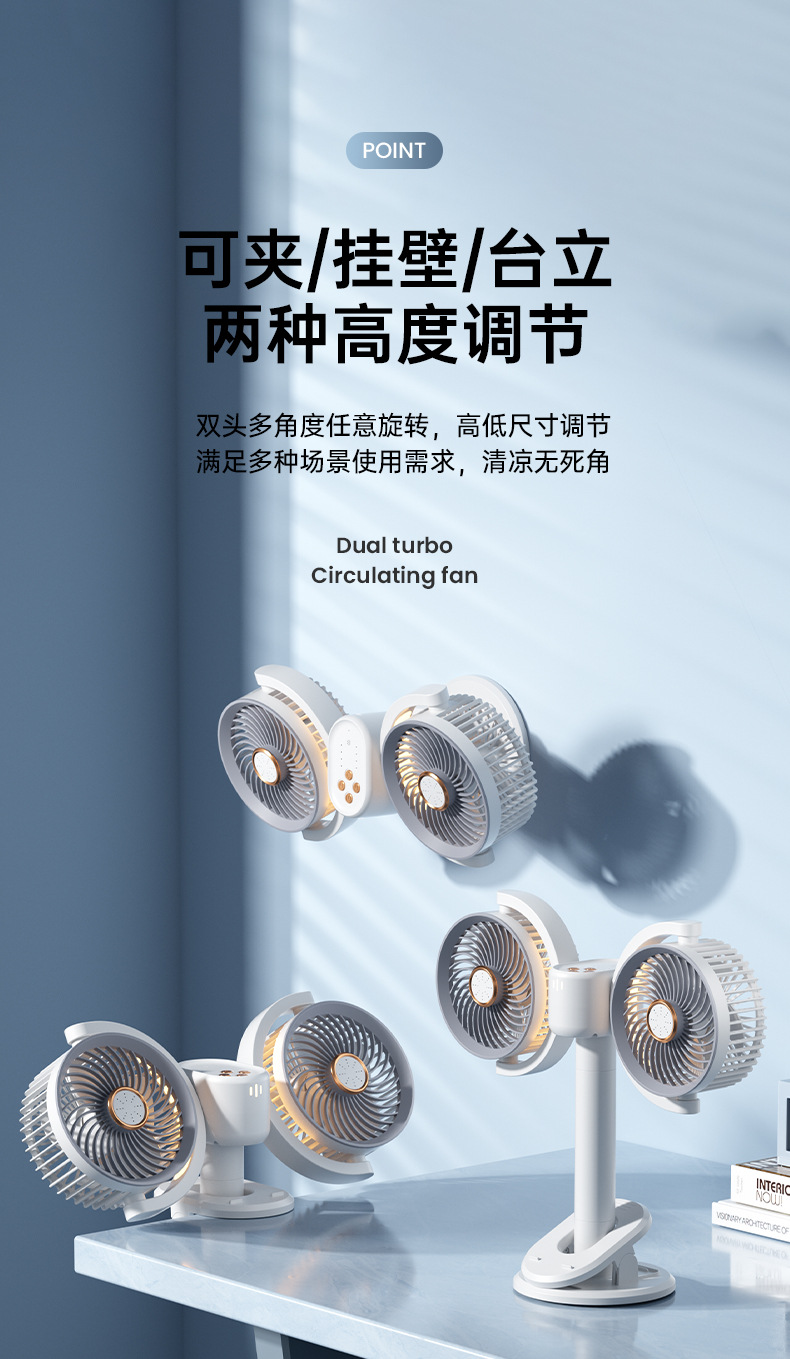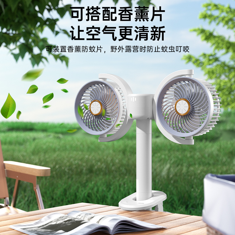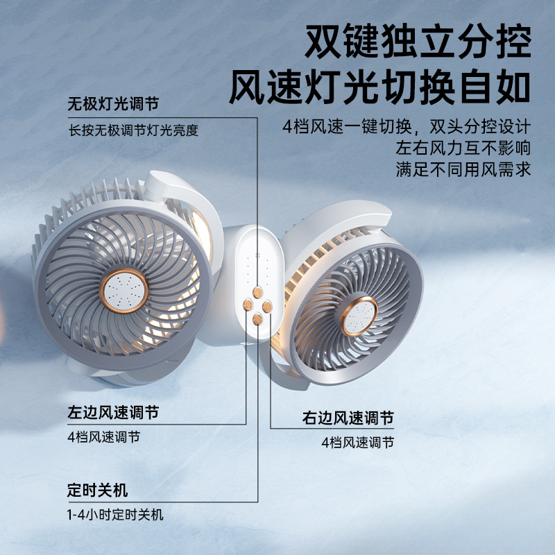 新款双头桌面循环扇多功能USB充电灯光露营风扇家用壁挂夹子风扇