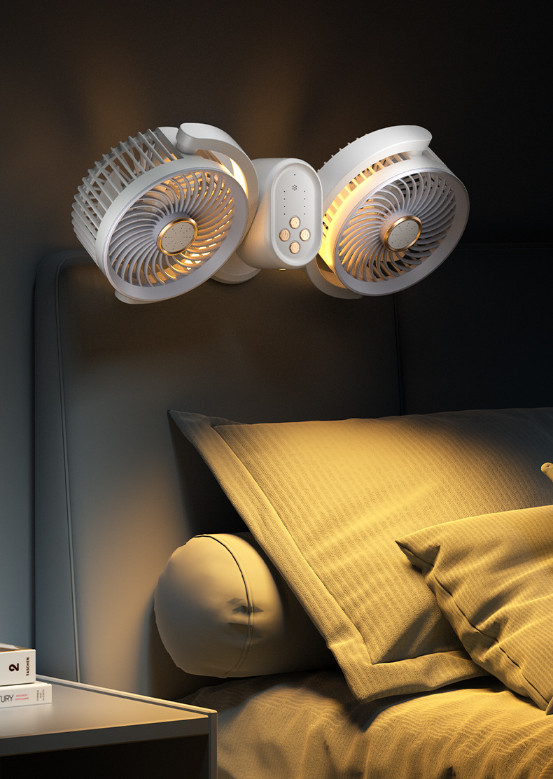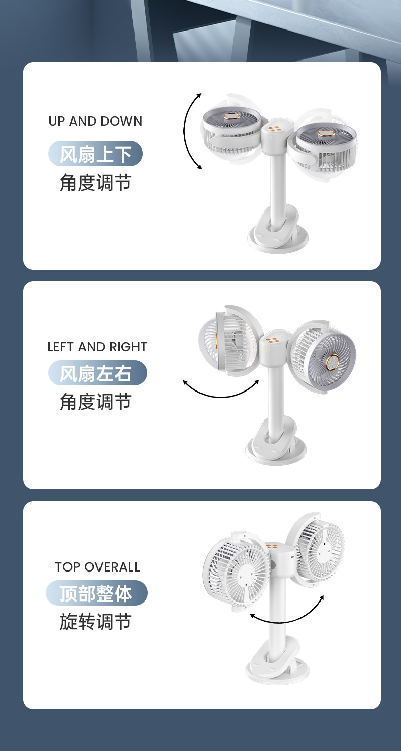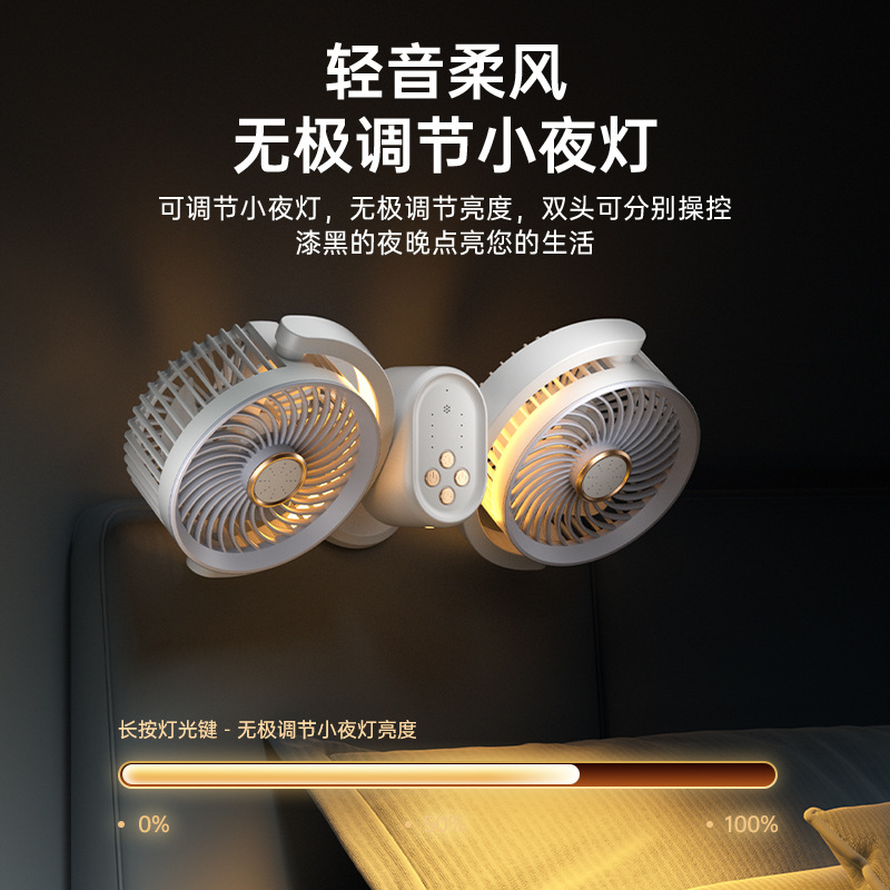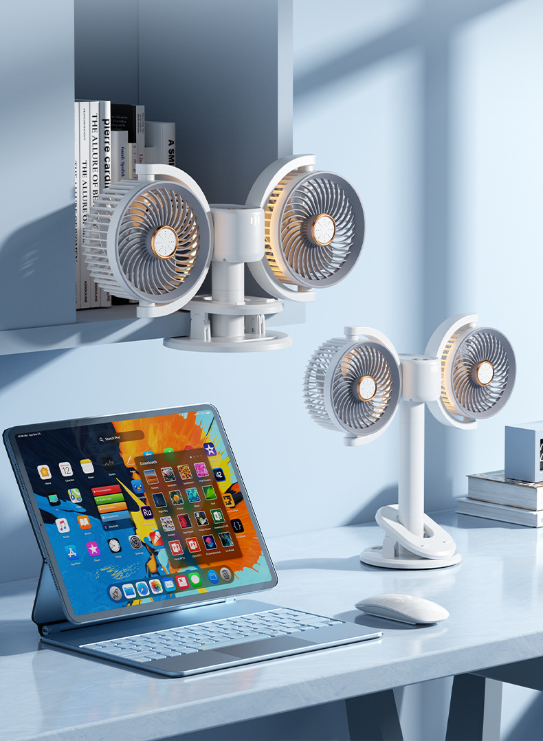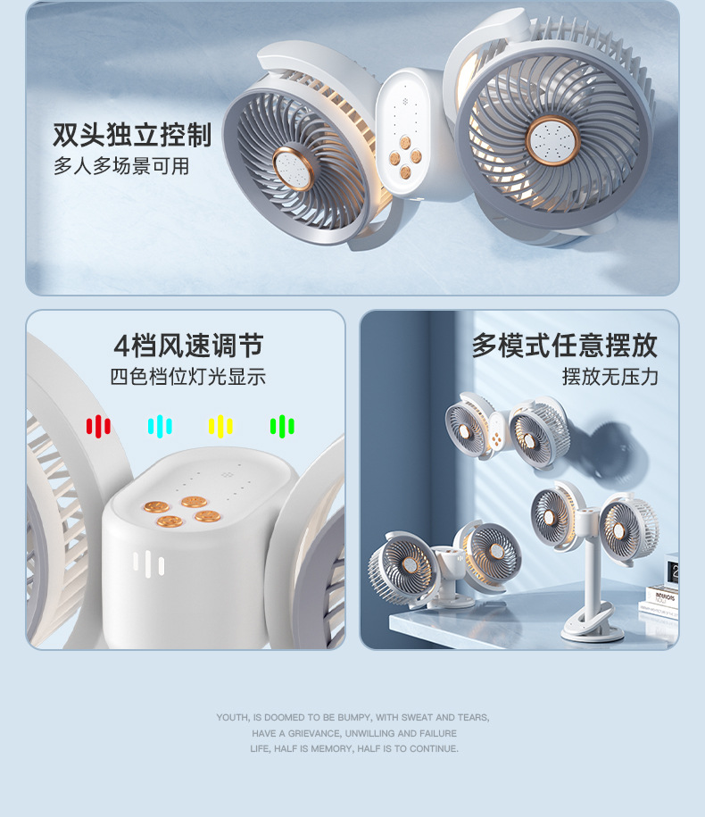 新款双头桌面循环扇多功能USB充电灯光露营风扇家用壁挂夹子风扇