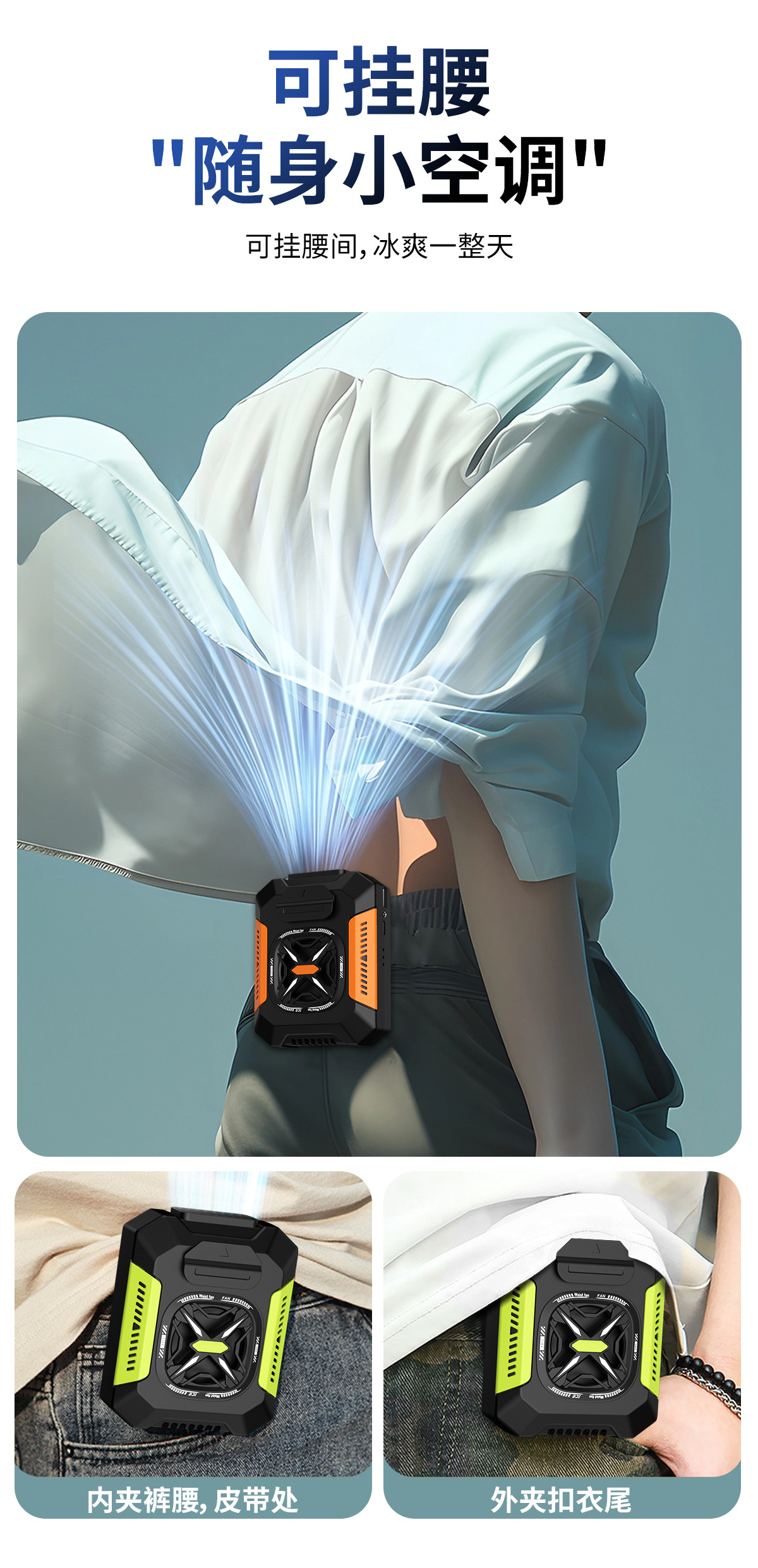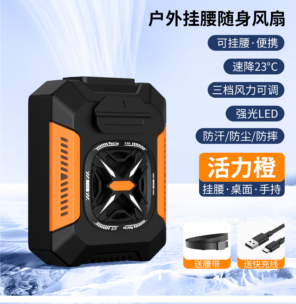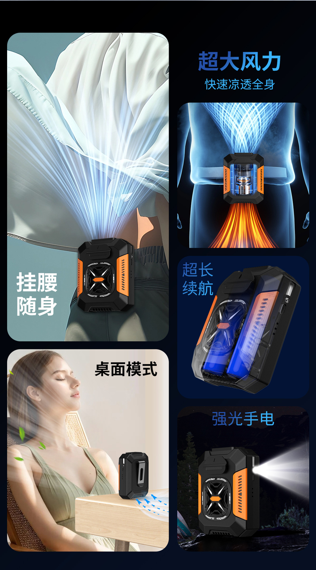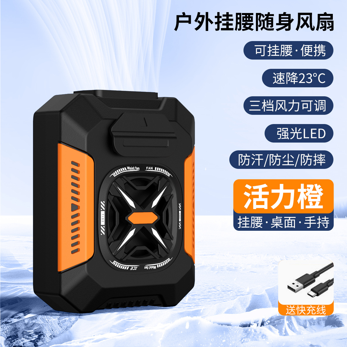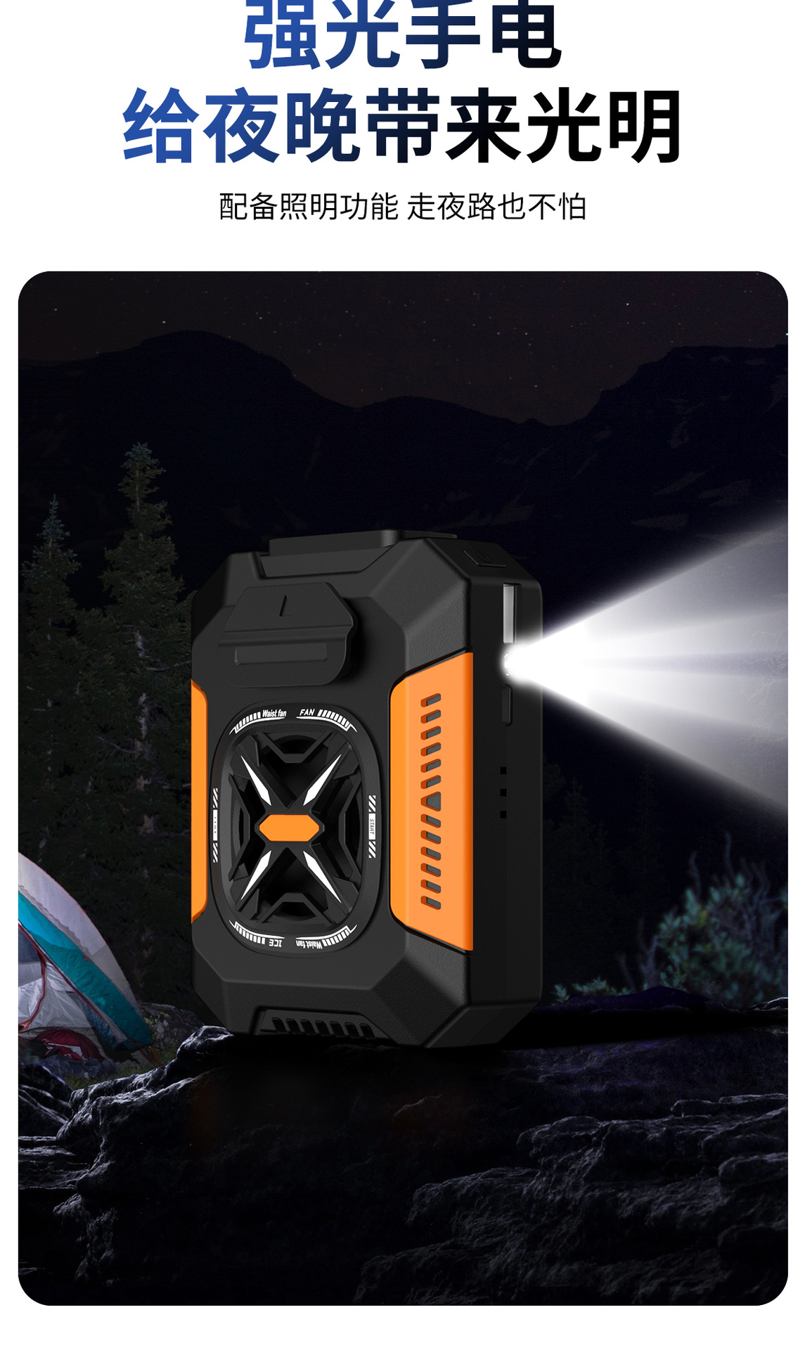 新款迷你家用挂腰风扇静音户外露营风扇腰挂照明灯跨境电扇爆款