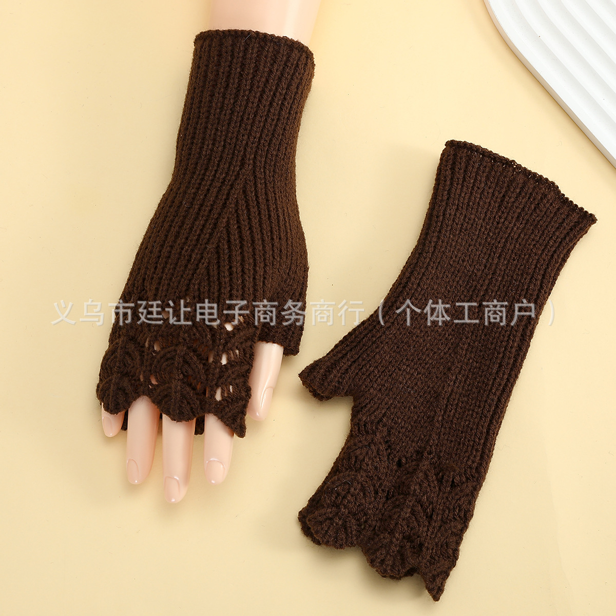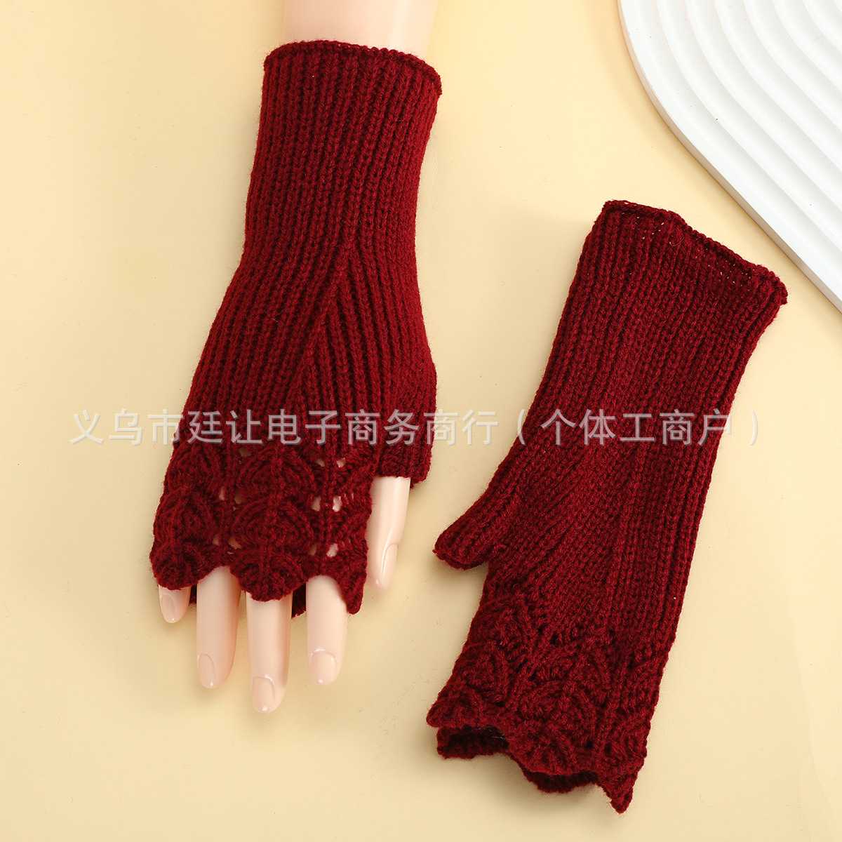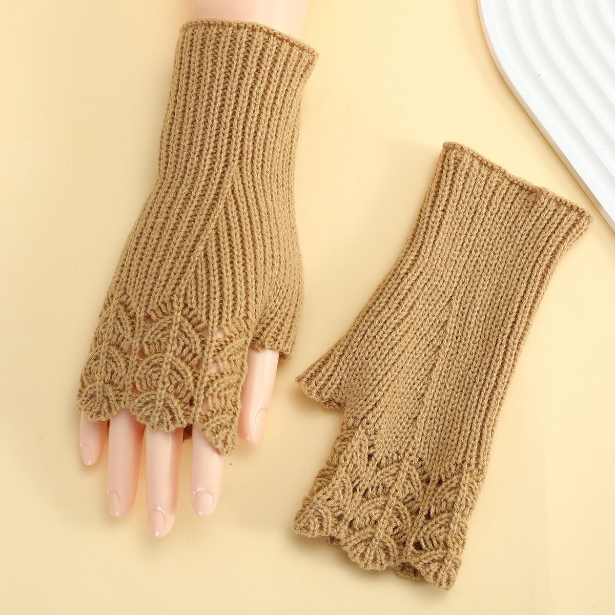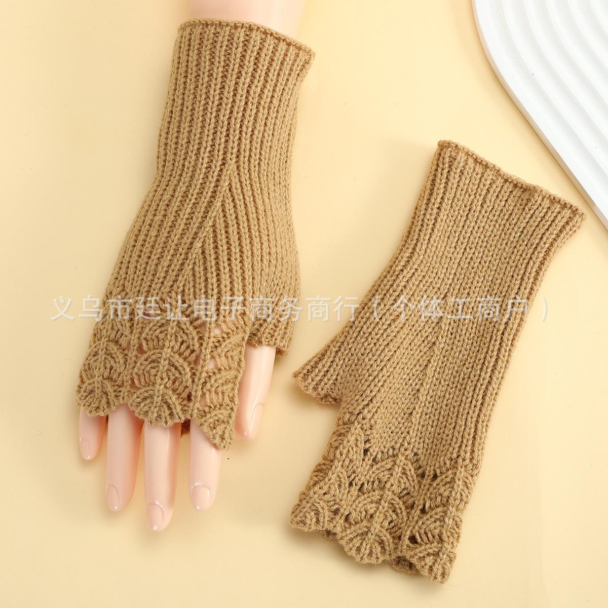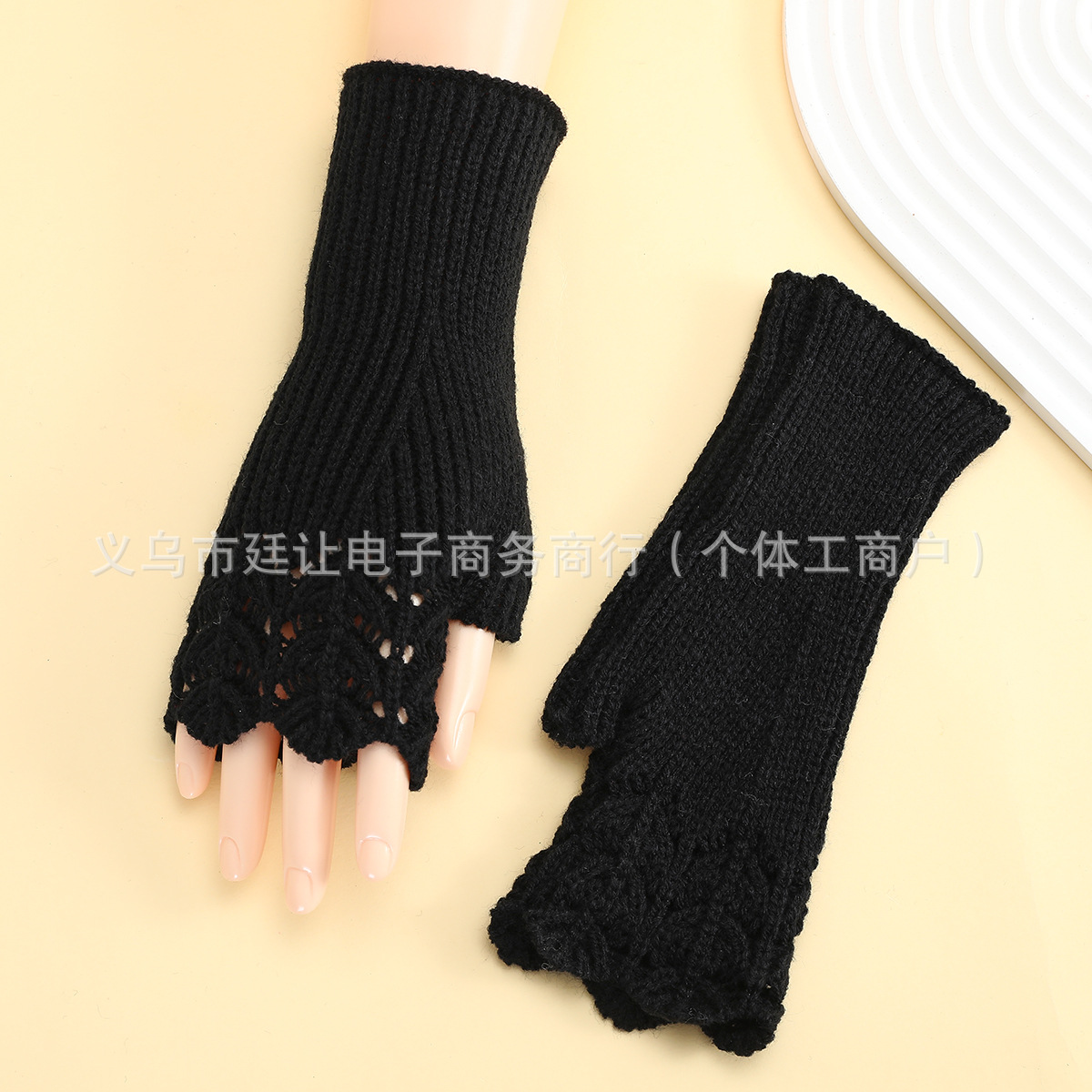 跨境女秋冬短款鱼鳞针织漏指保暖护腕袖套毛线手套镂空短手套腈纶