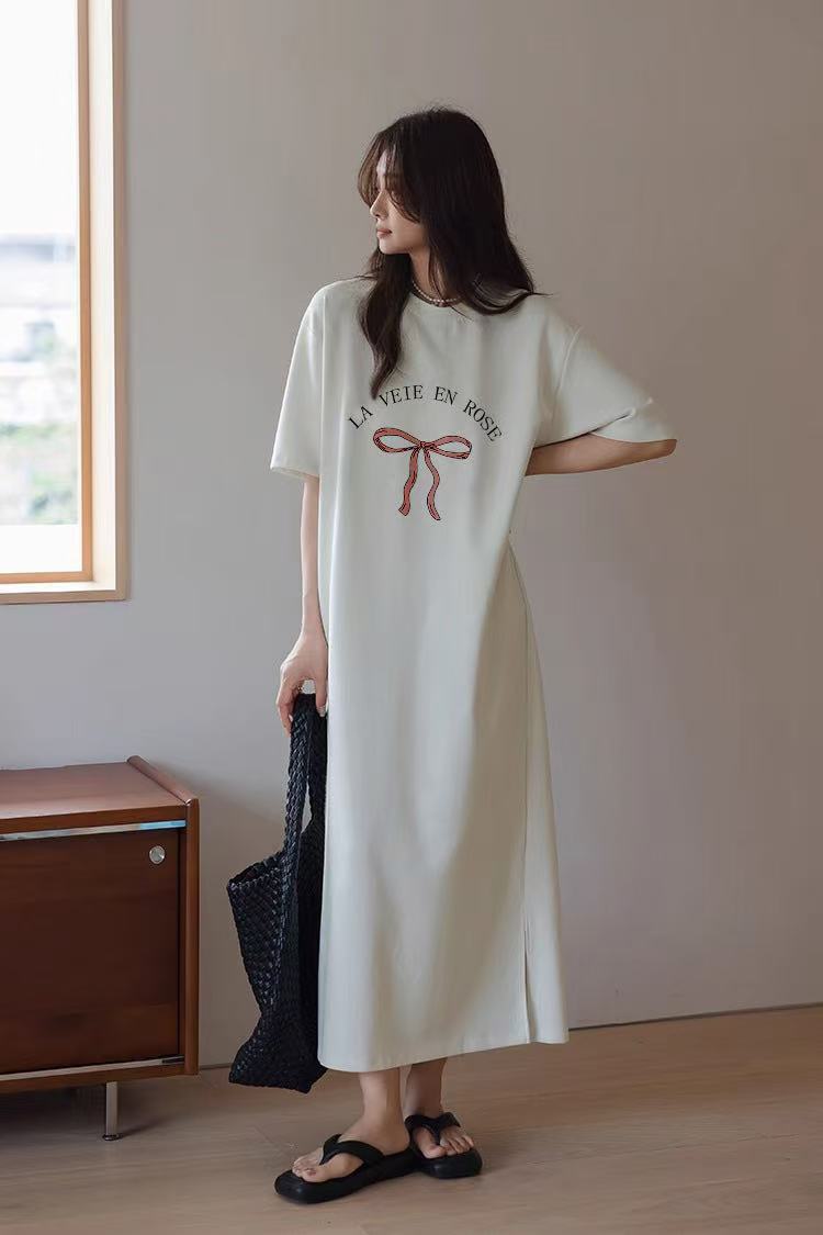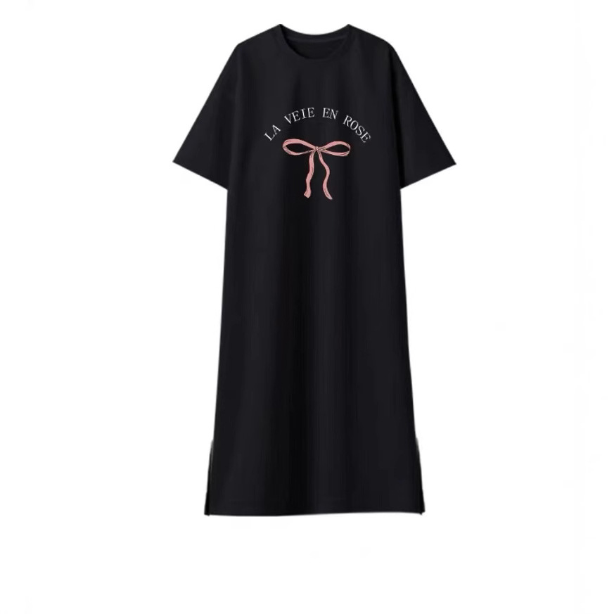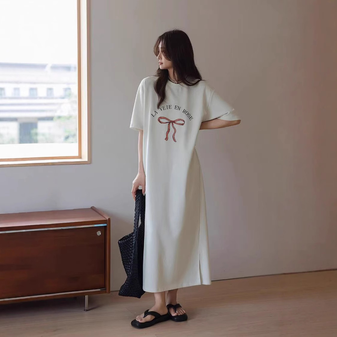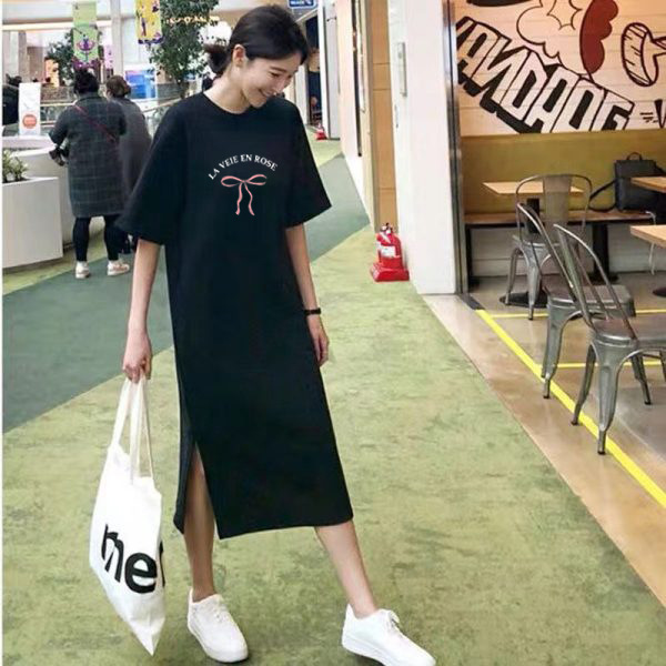 大码女装休闲短袖t恤连衣裙子夏季长款过膝胖mm遮肚显瘦开叉长裙