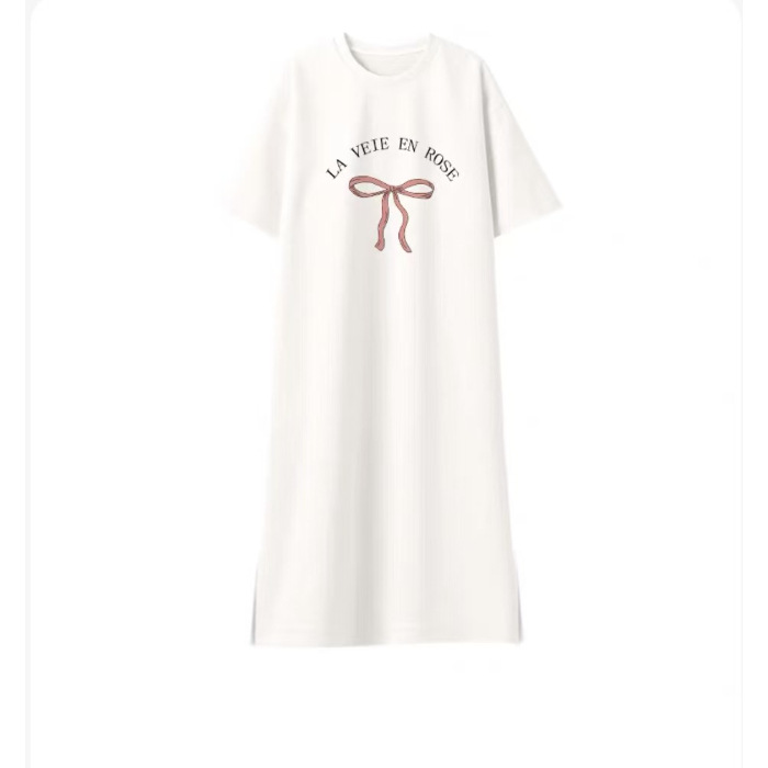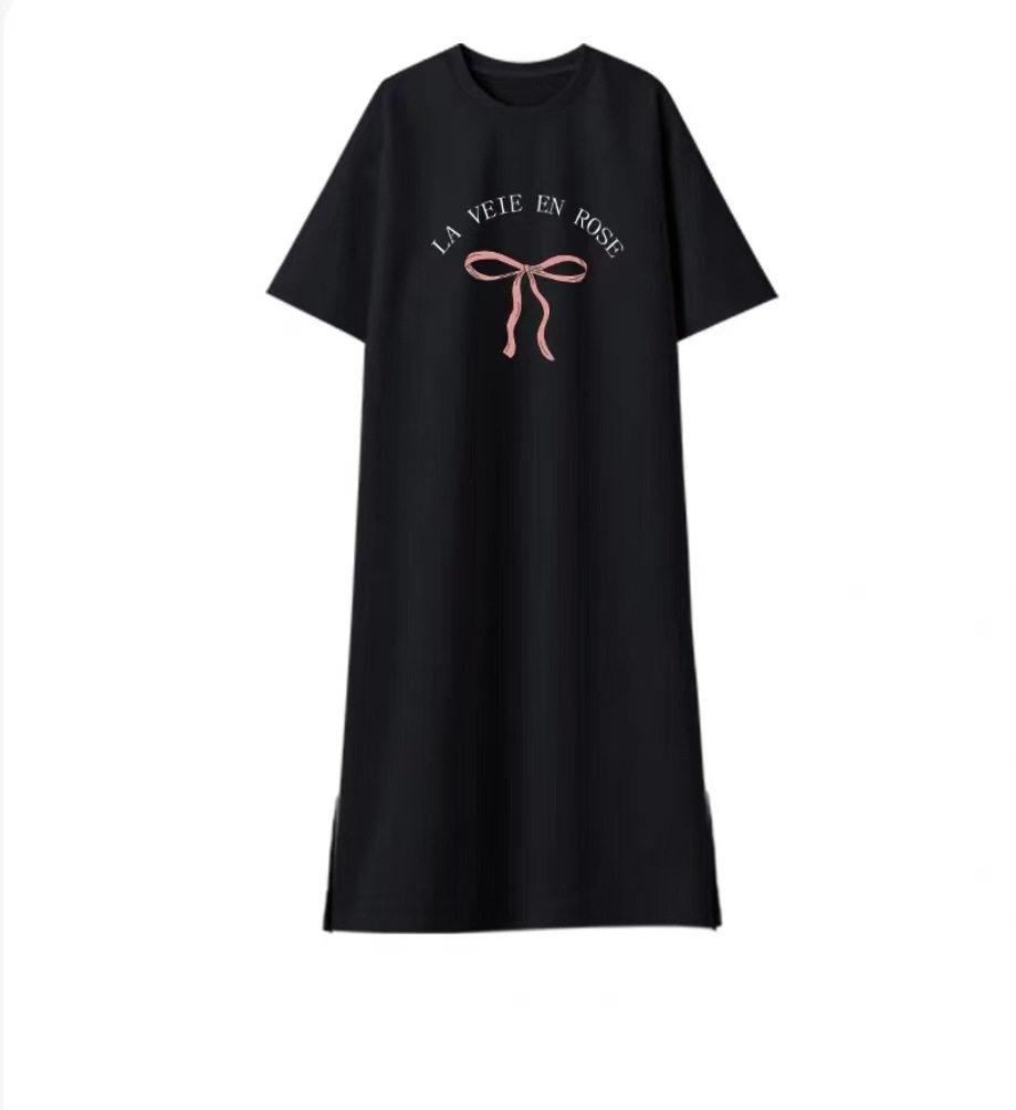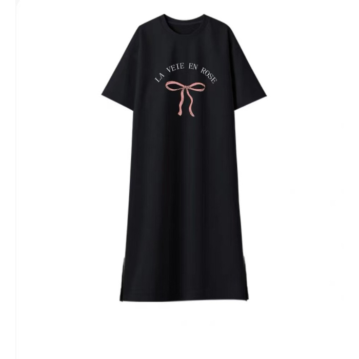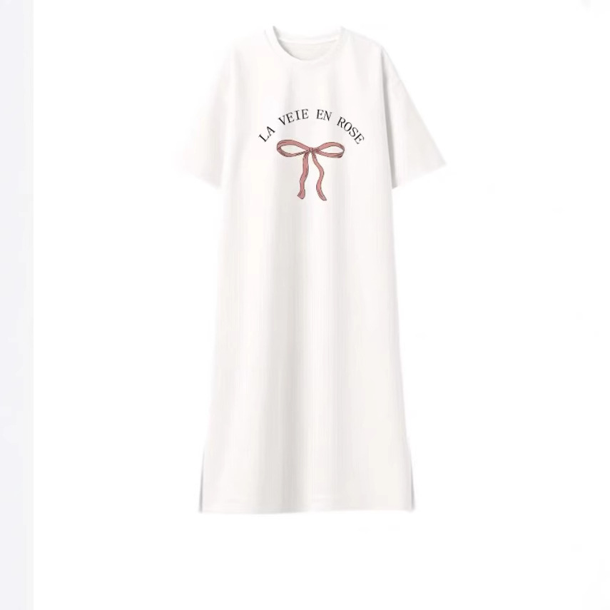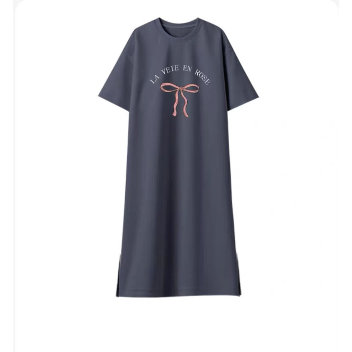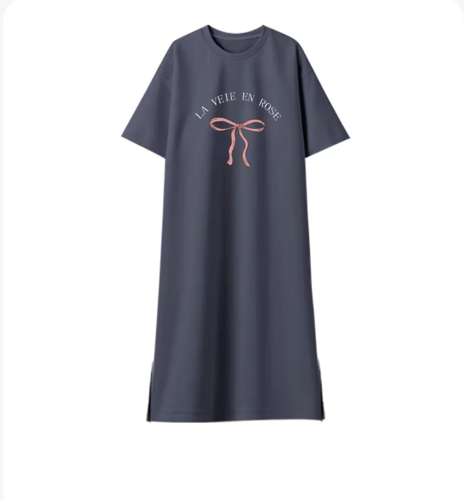 大码女装休闲短袖t恤连衣裙子夏季长款过膝胖mm遮肚显瘦开叉长裙