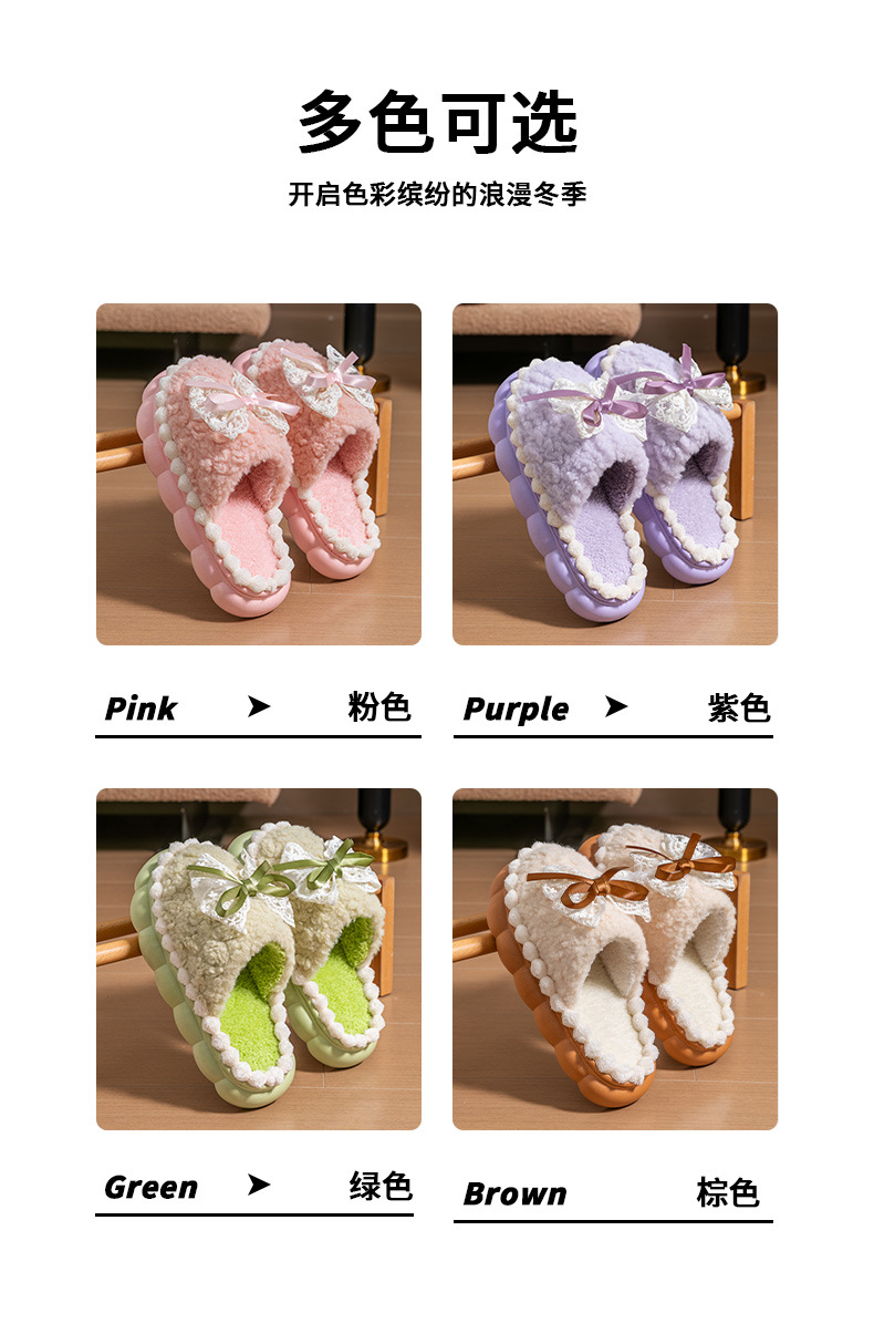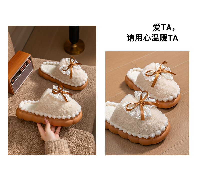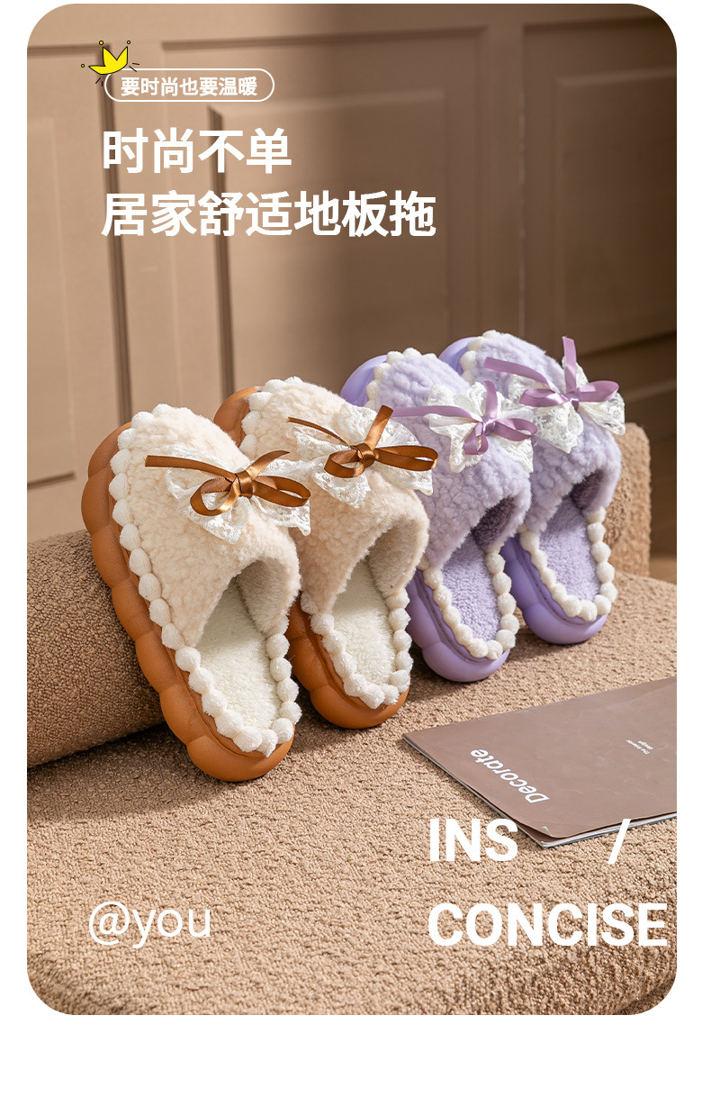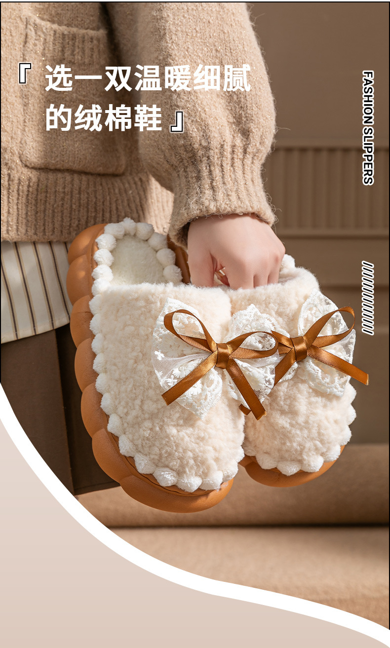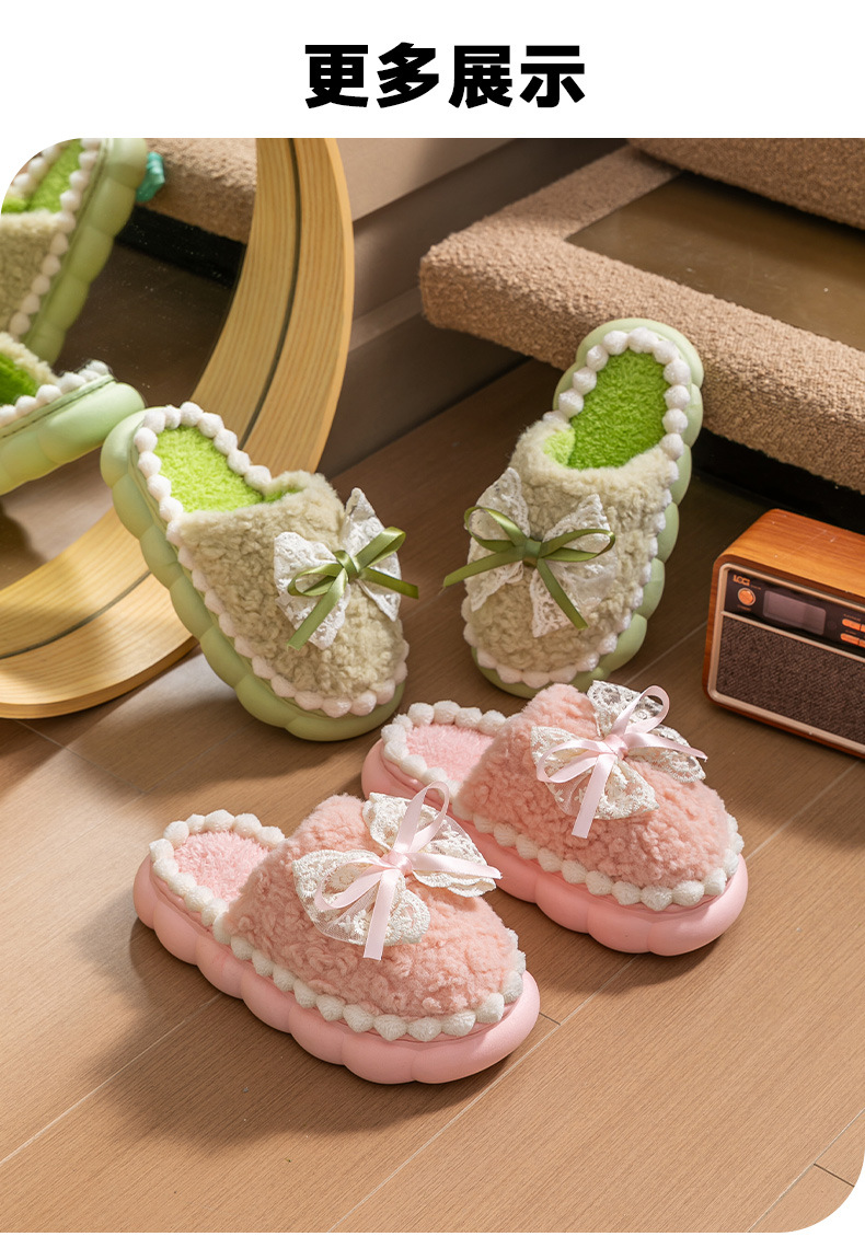 甜美蝴蝶结棉拖鞋女秋冬季室内居家用宿舍加毛绒厚底保暖月子托鞋