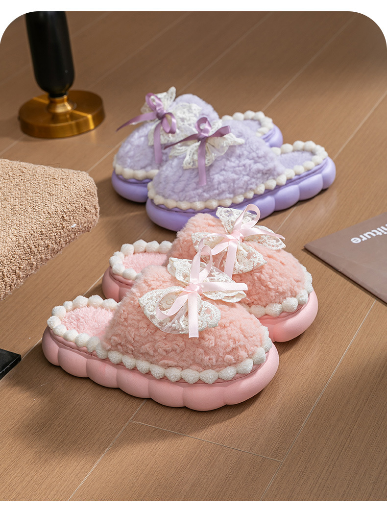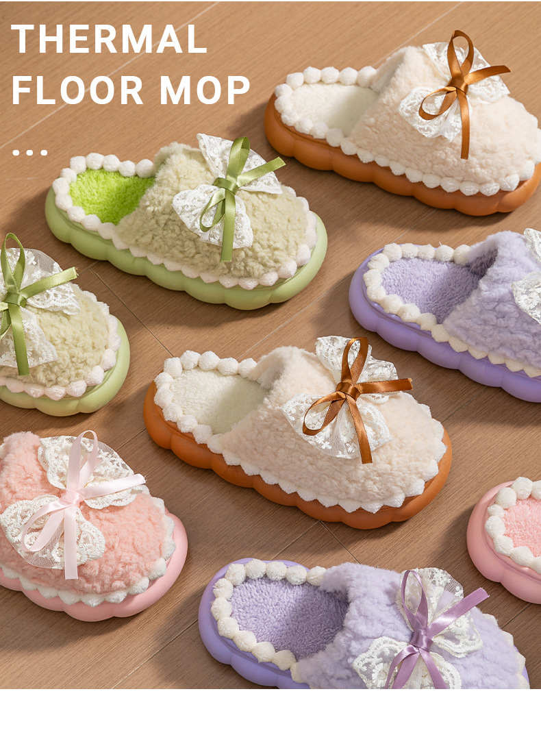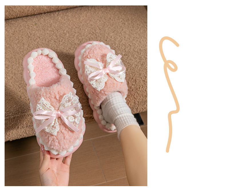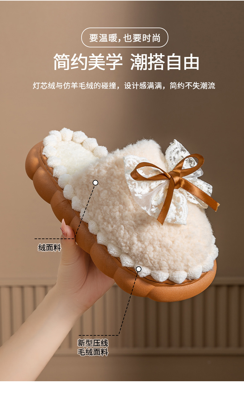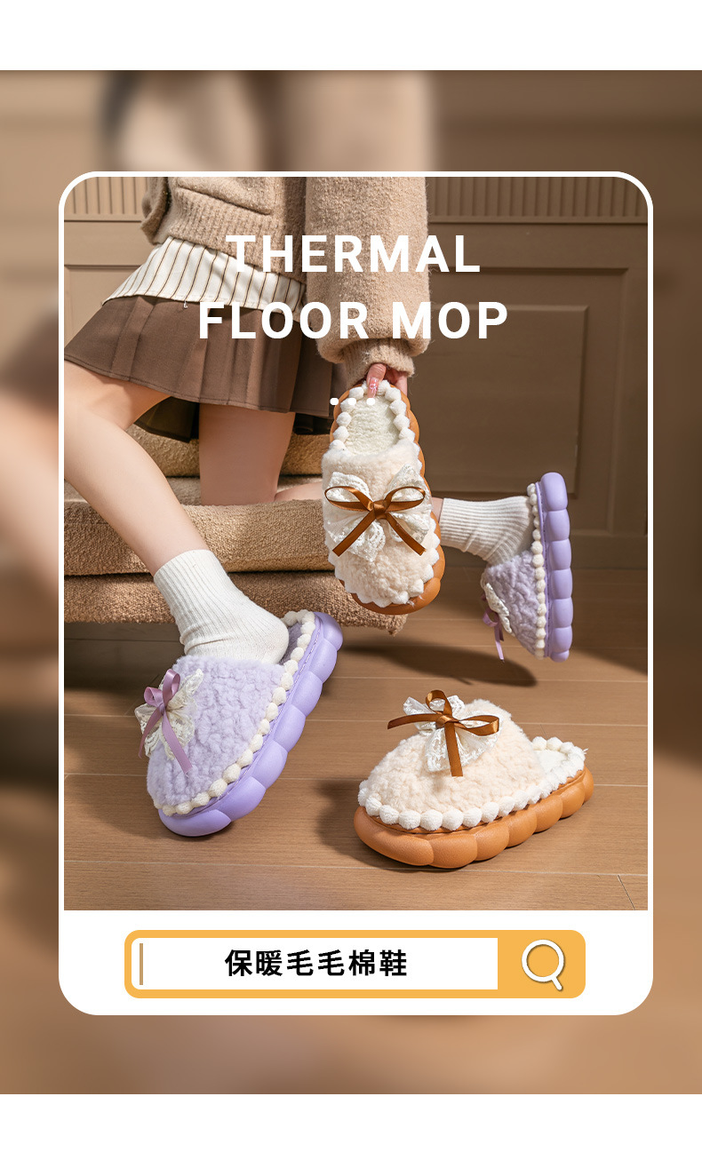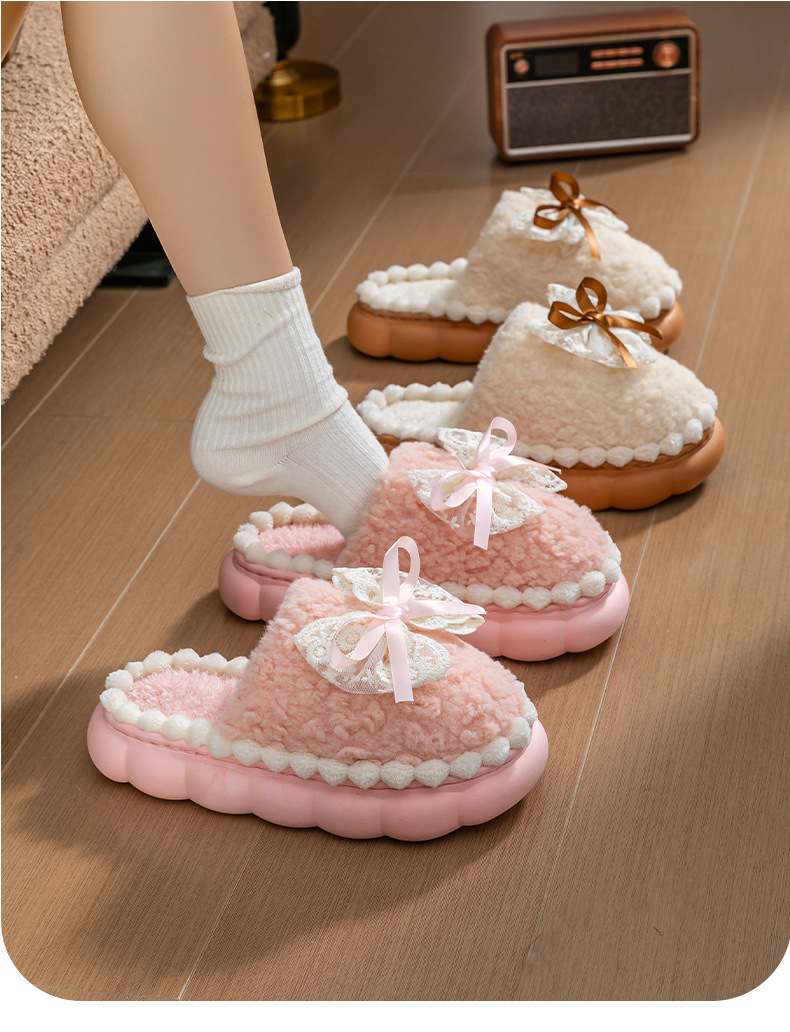甜美蝴蝶结棉拖鞋女秋冬季室内居家用宿舍加毛绒厚底保暖月子托鞋