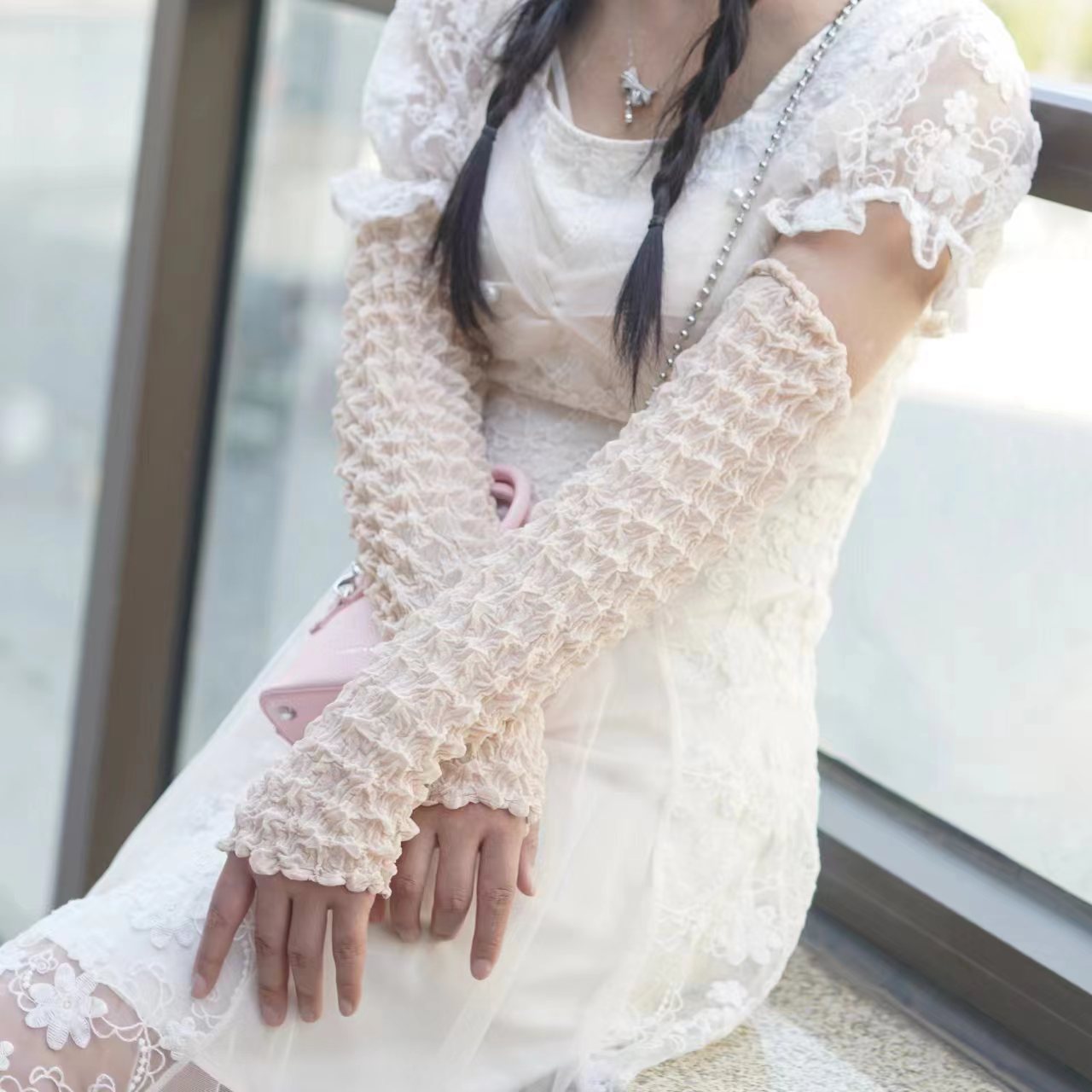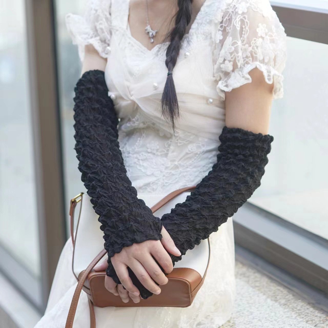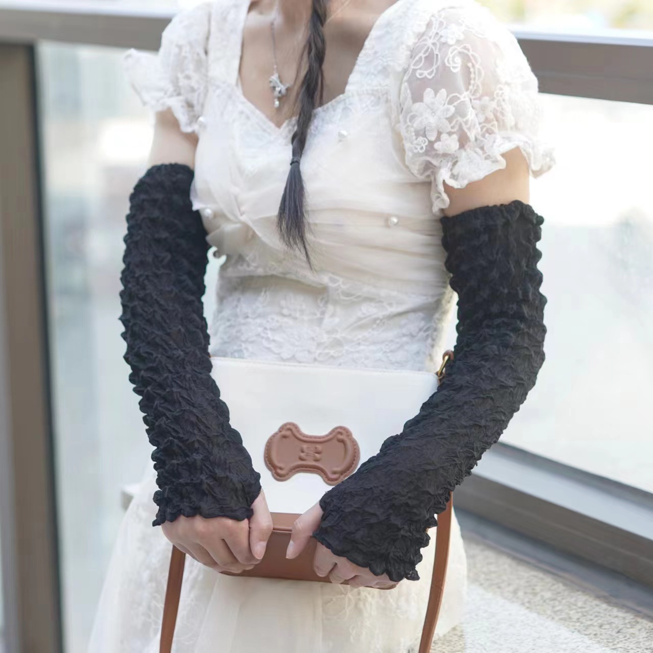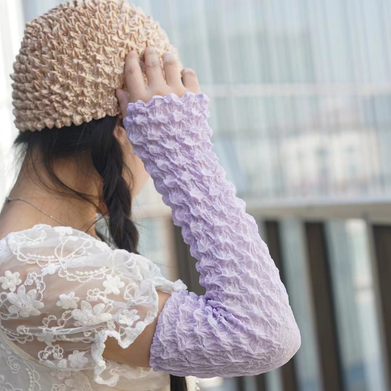 日韩夏季防晒袖套雪纺泡泡褶皱袖套亲爽透气户外骑行防紫外线遮阳