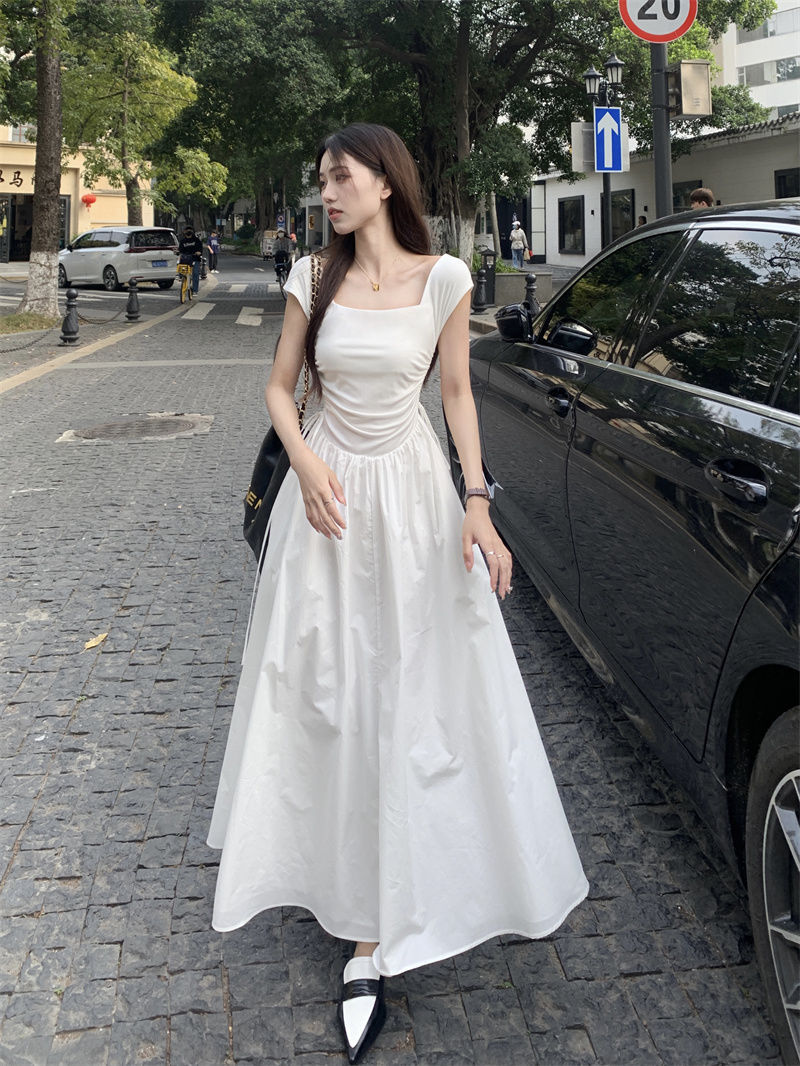 极简风感今年流行漂亮背心连衣裙女夏季鱼骨褶皱收腰中长裙子时装