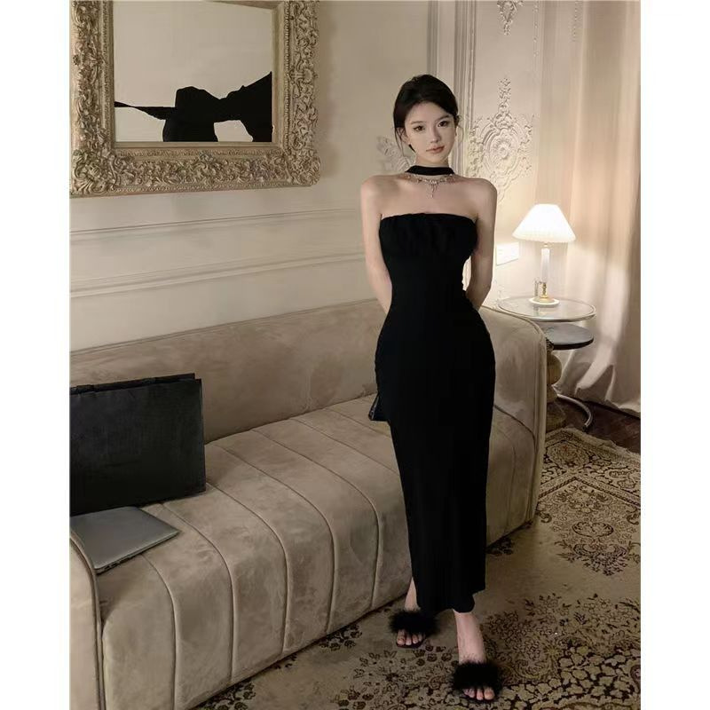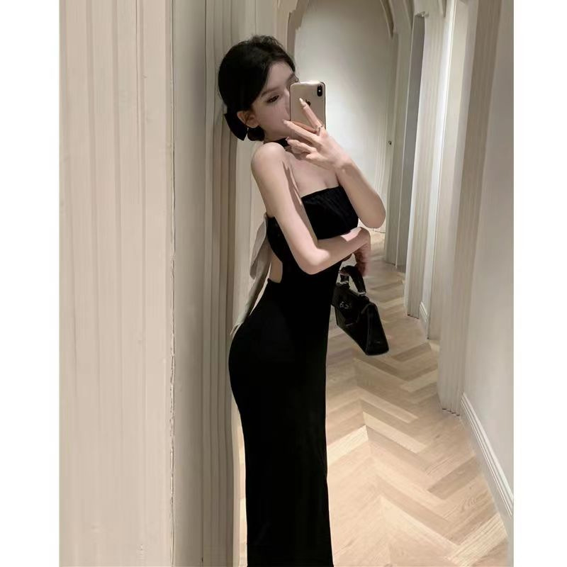 法式绝美黑色蝴蝶结性感包臀一字肩抹胸挂脖连衣裙女夏高级感长裙