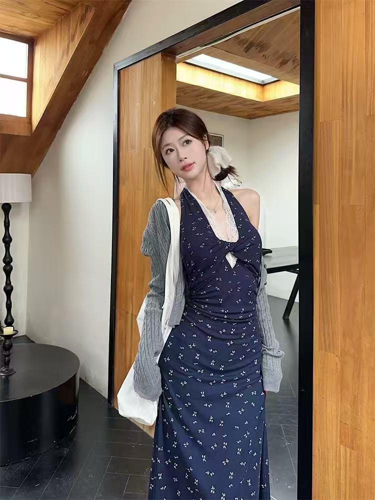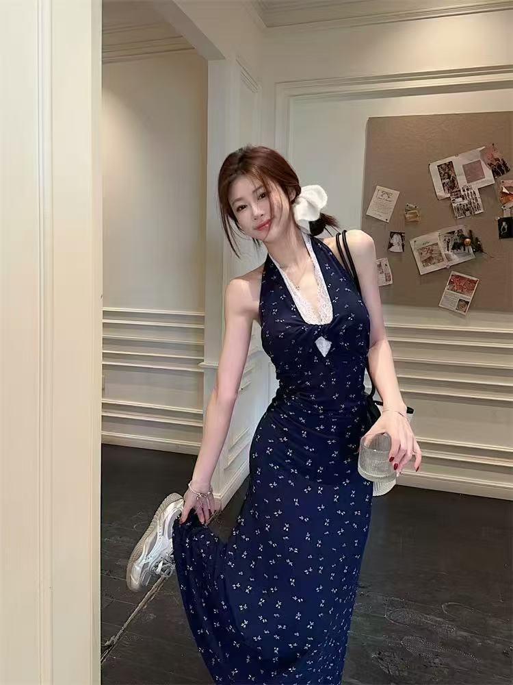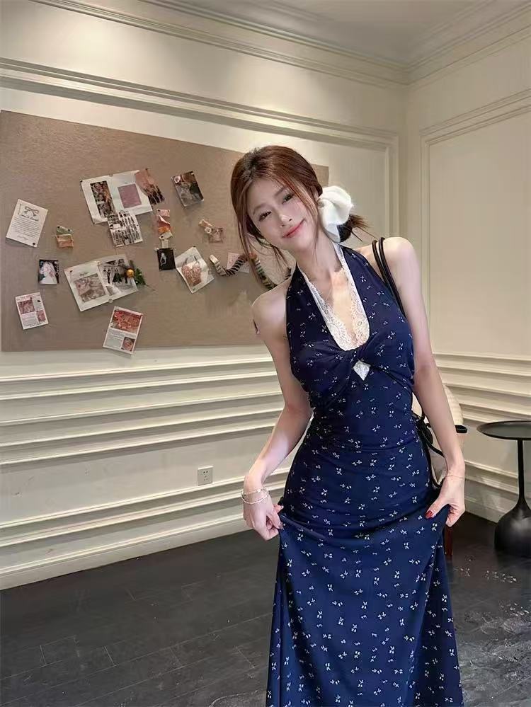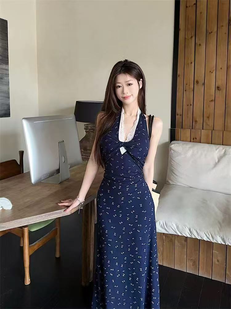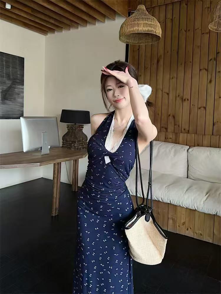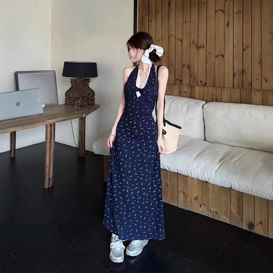 法式气质挂脖碎花裙连衣裙女夏季海边绝美蕾丝拼接收腰A字裙长裙