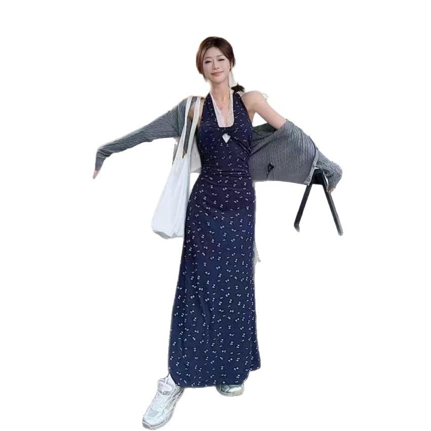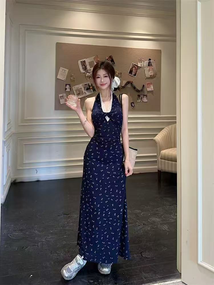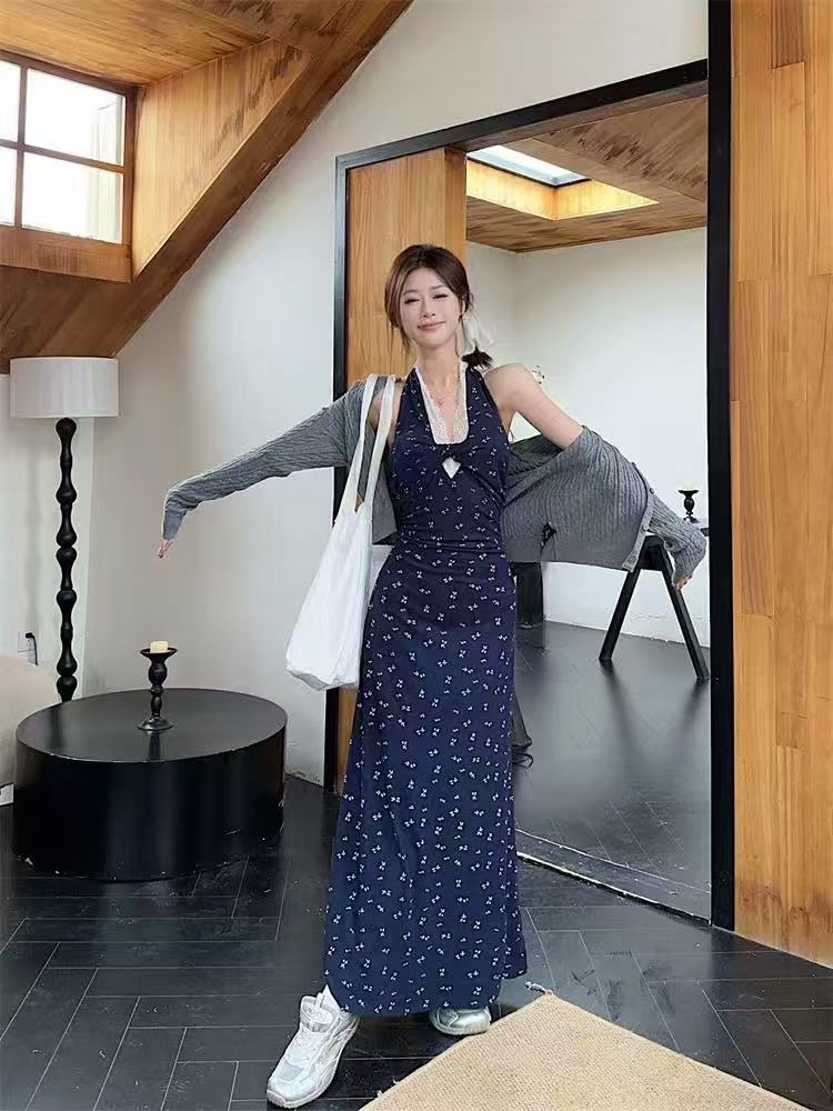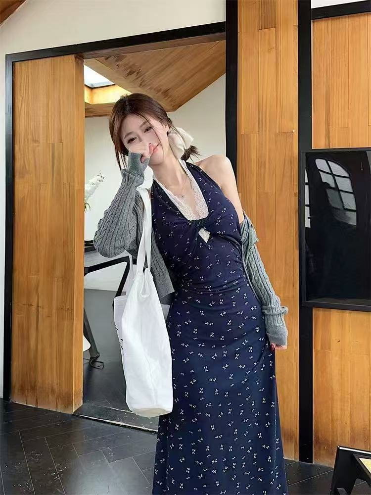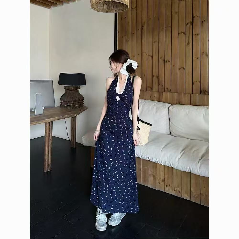 法式气质挂脖碎花裙连衣裙女夏季海边绝美蕾丝拼接收腰A字裙长裙