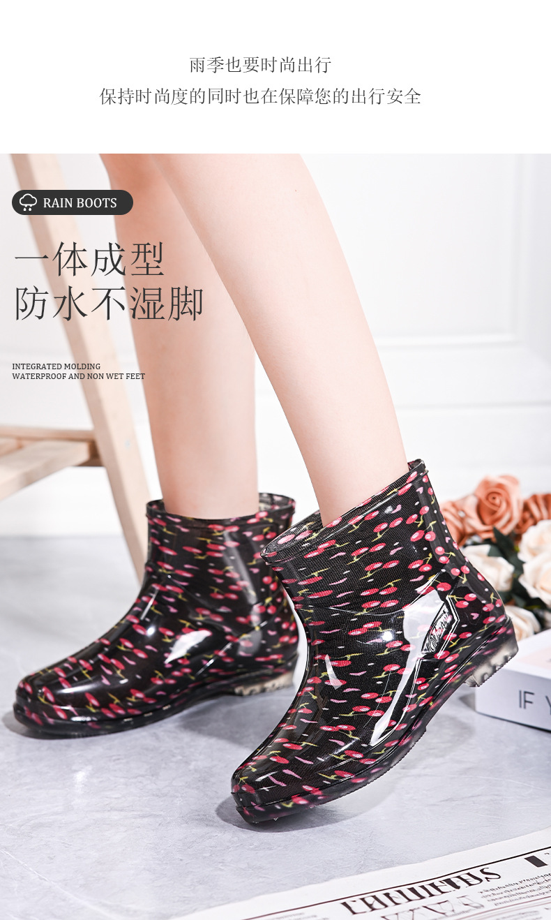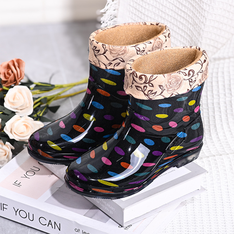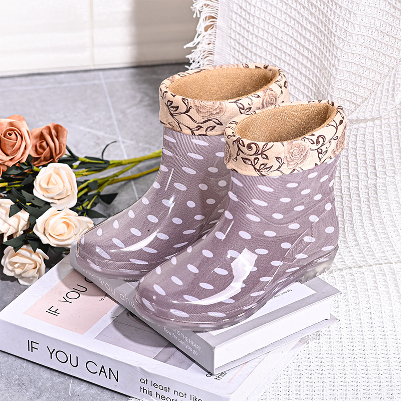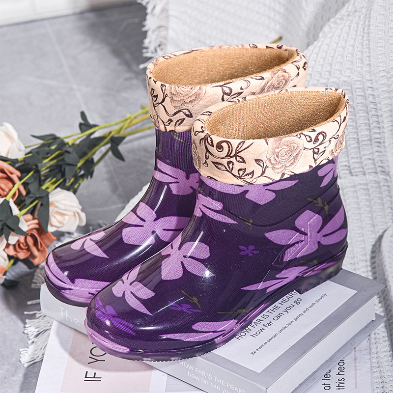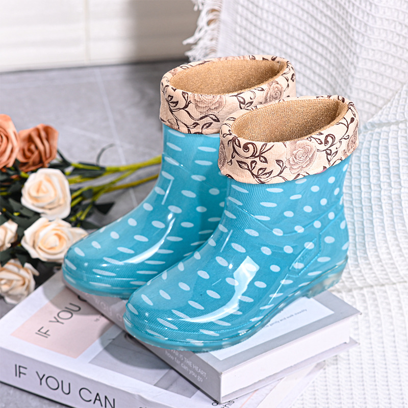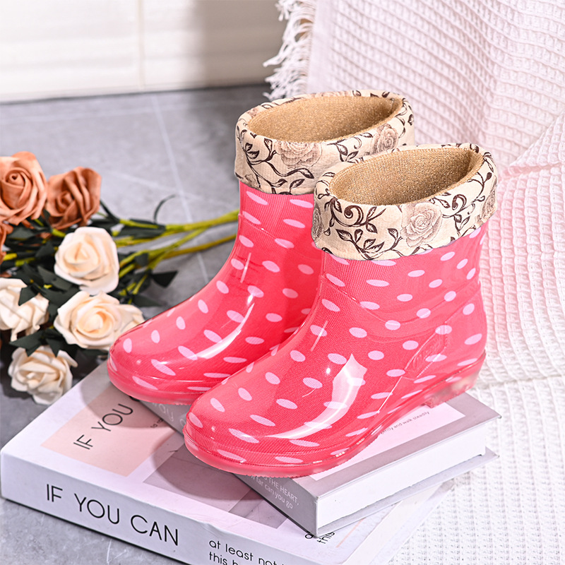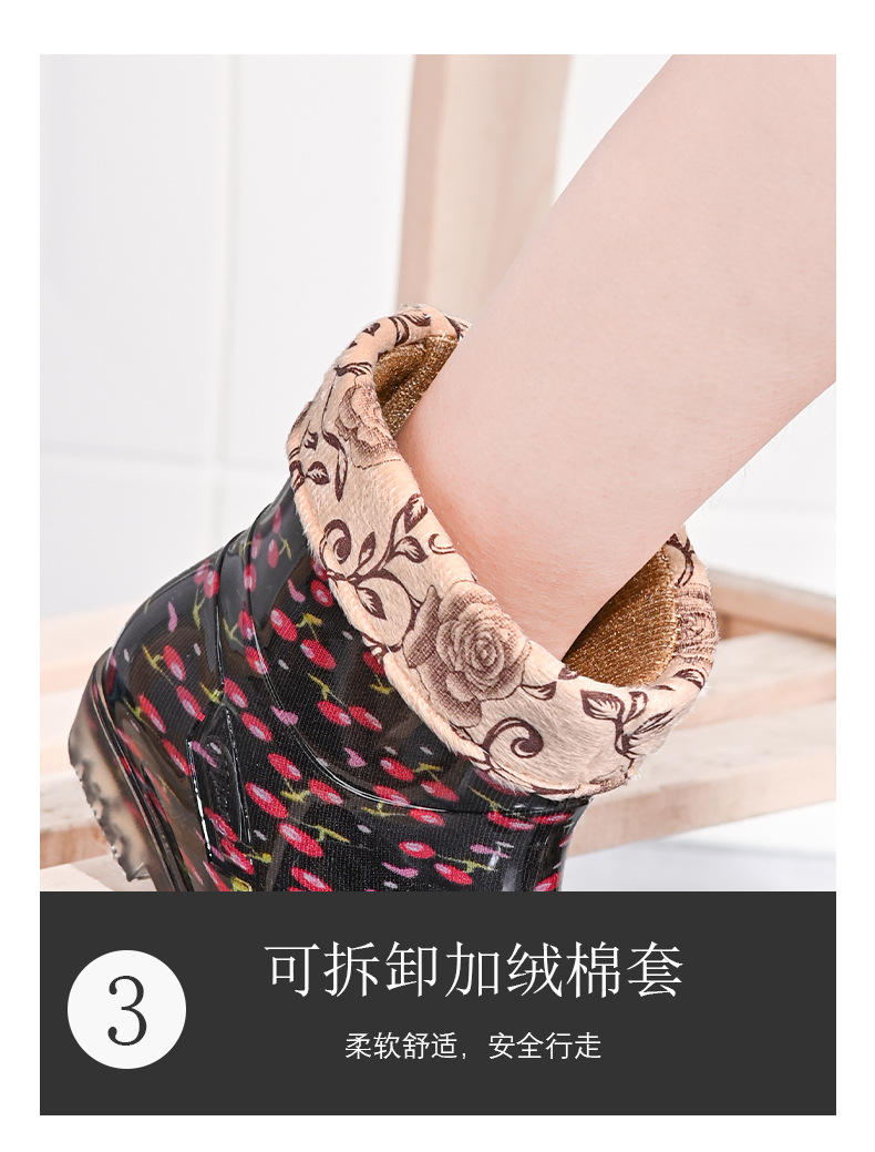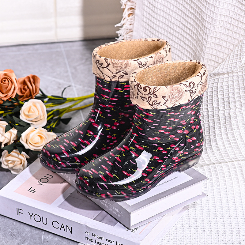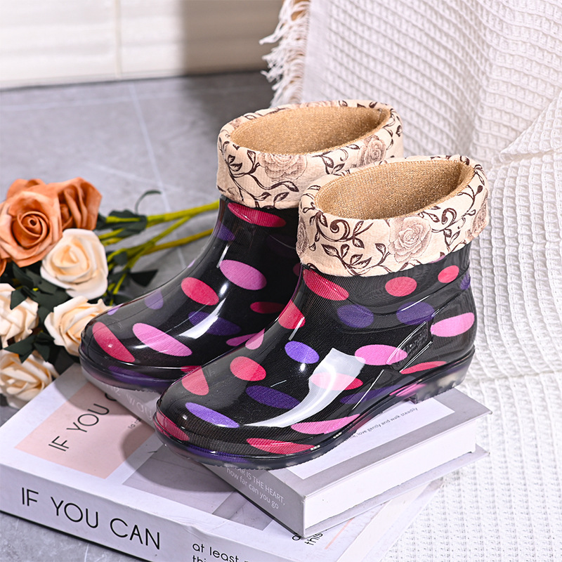 雨鞋短筒水鞋雨靴低筒时尚百搭加棉绒套防水水晶花布厨房工作胶鞋