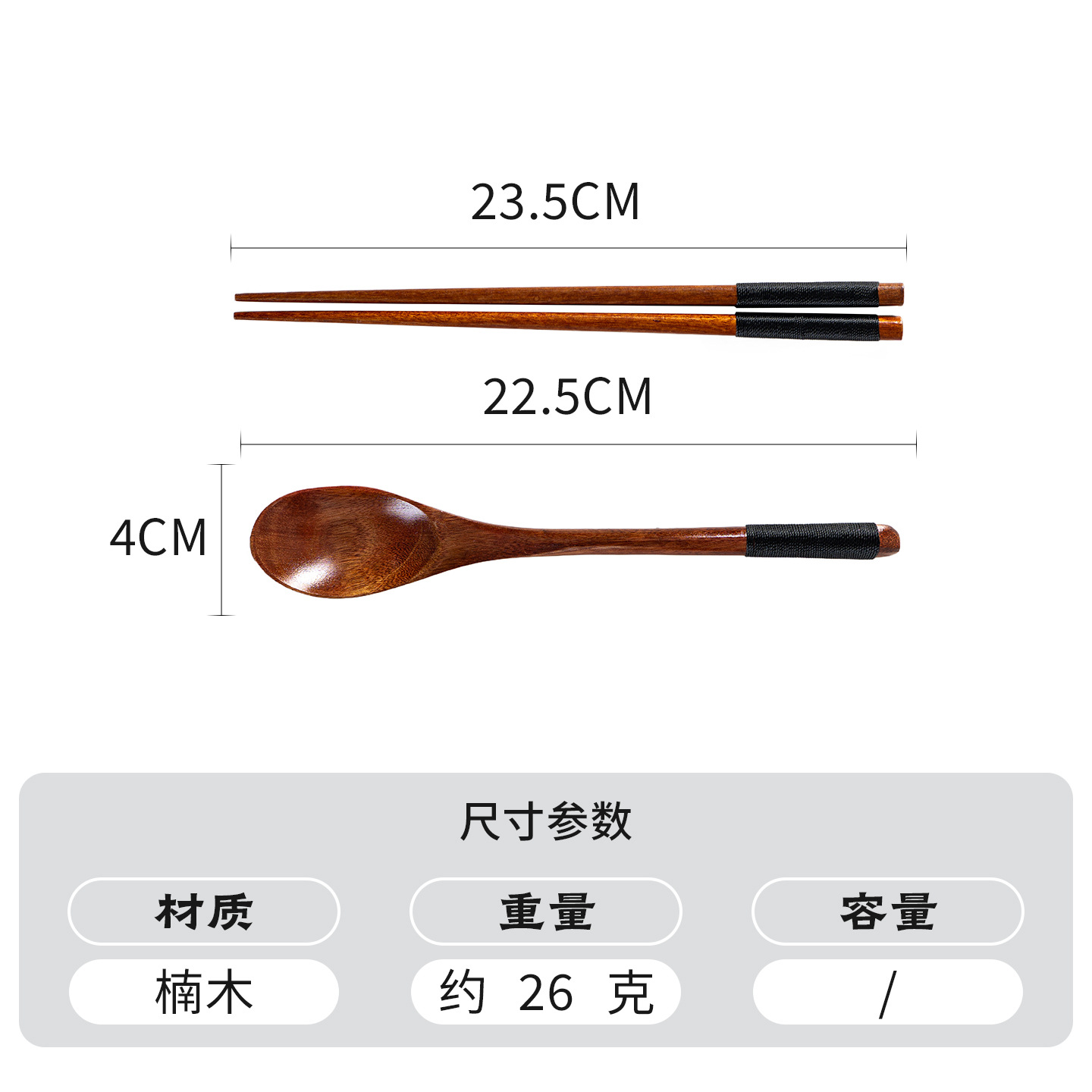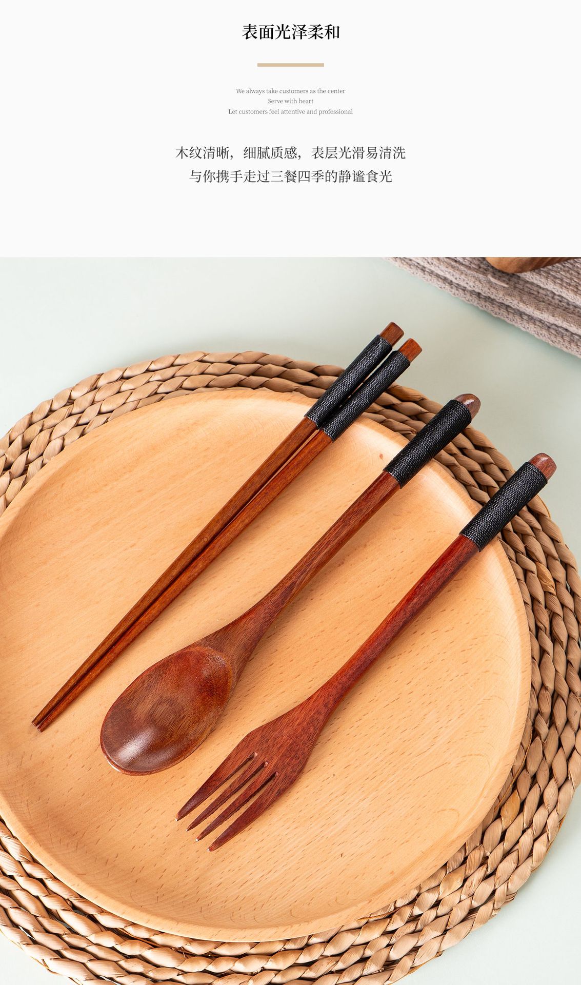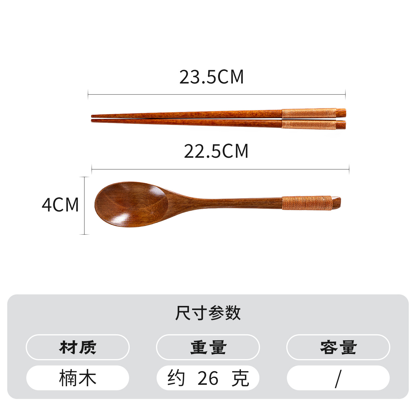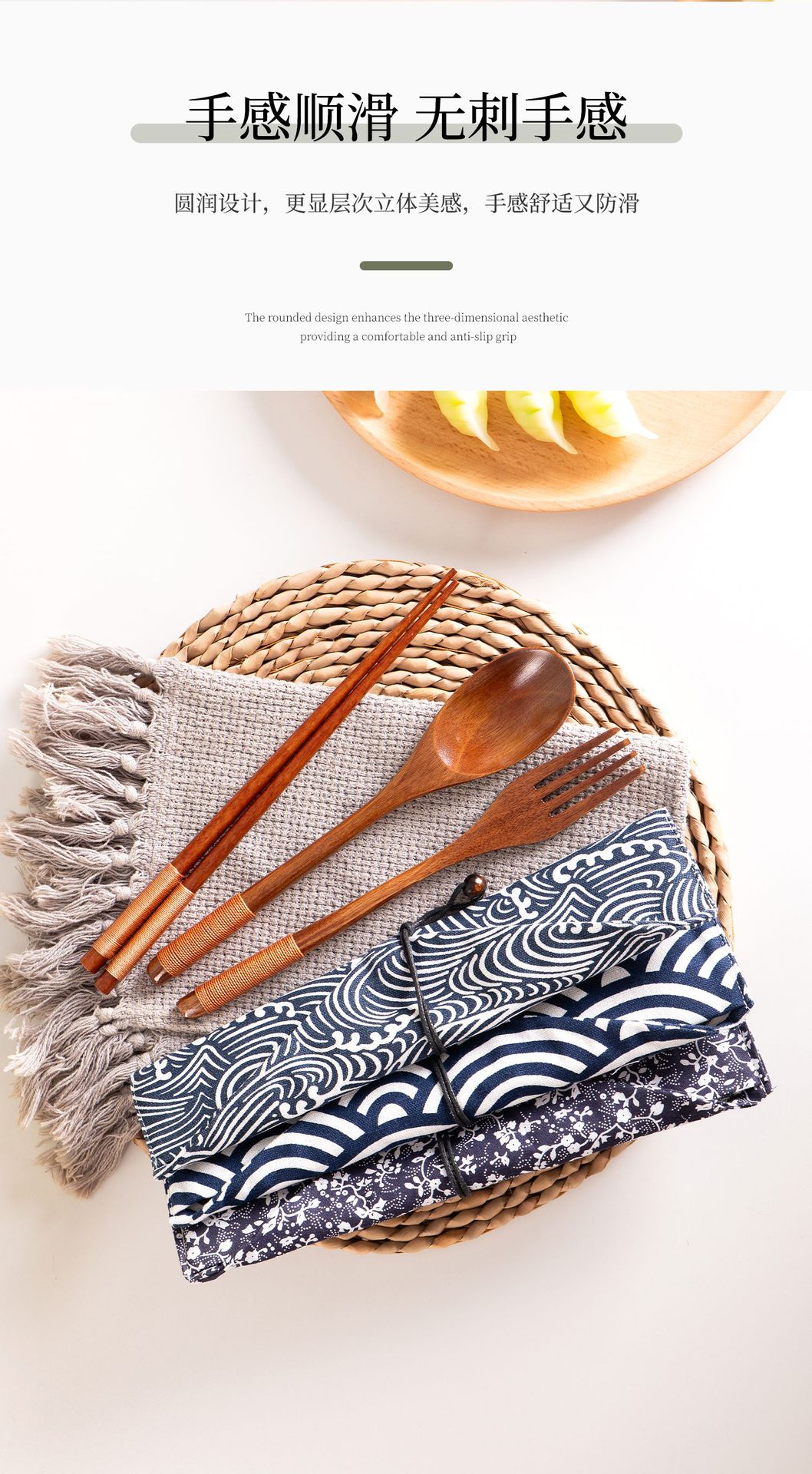 日式缠线楠木勺叉筷三件套跨境防滑实木叉子筷子布袋套装便捷餐具