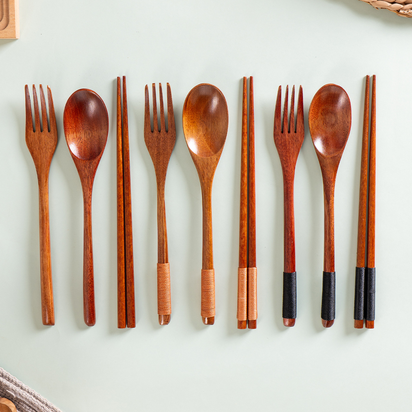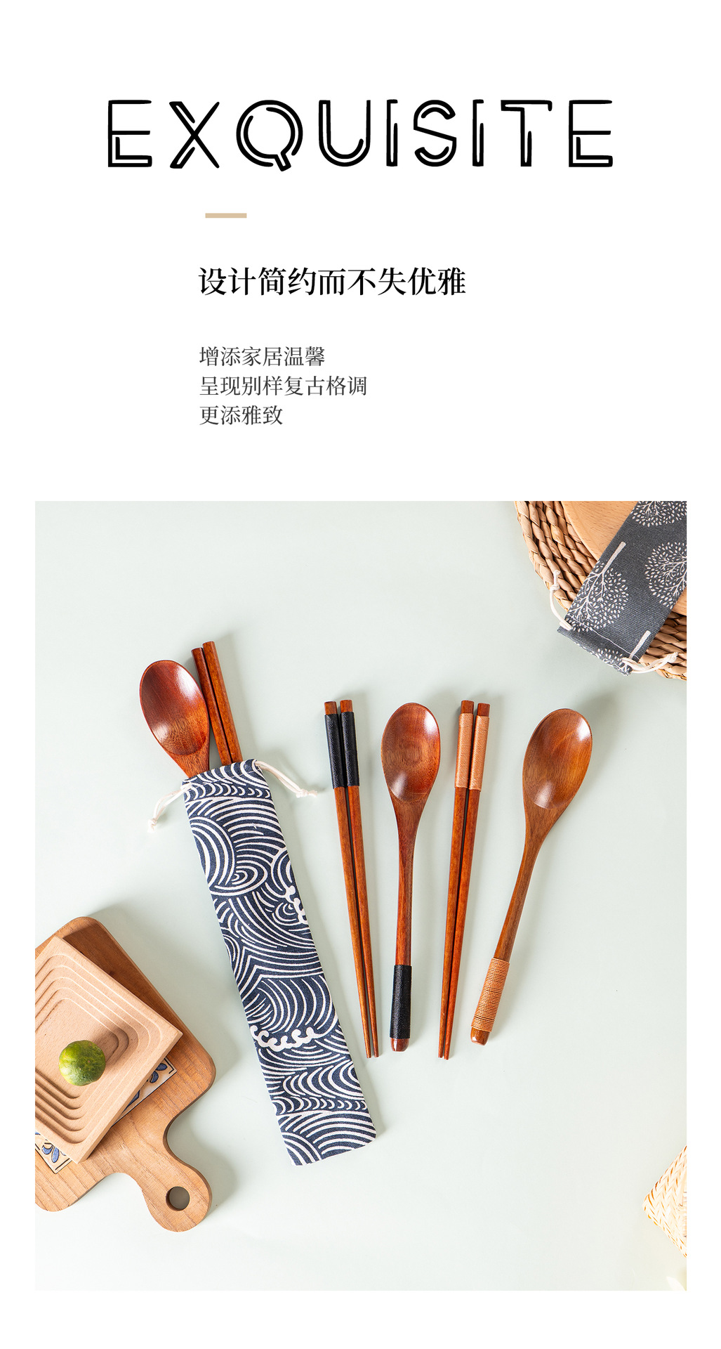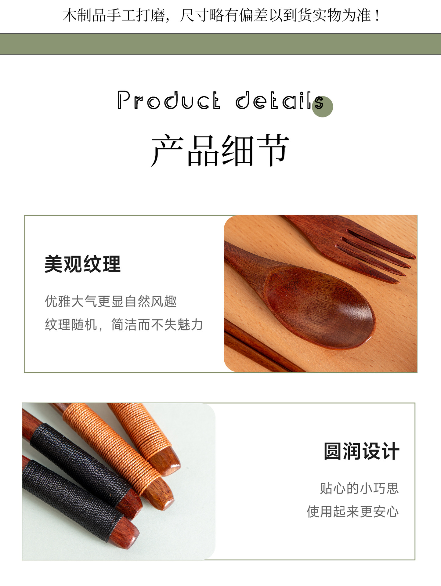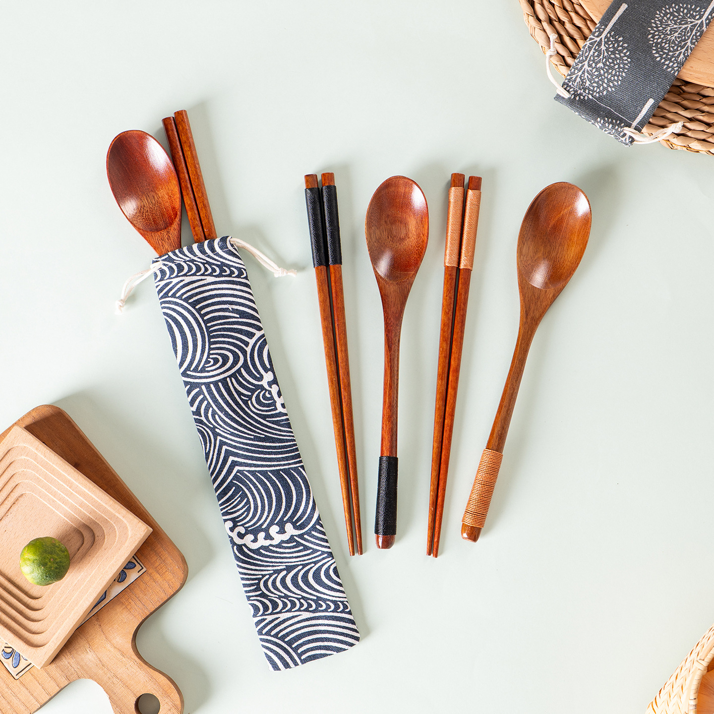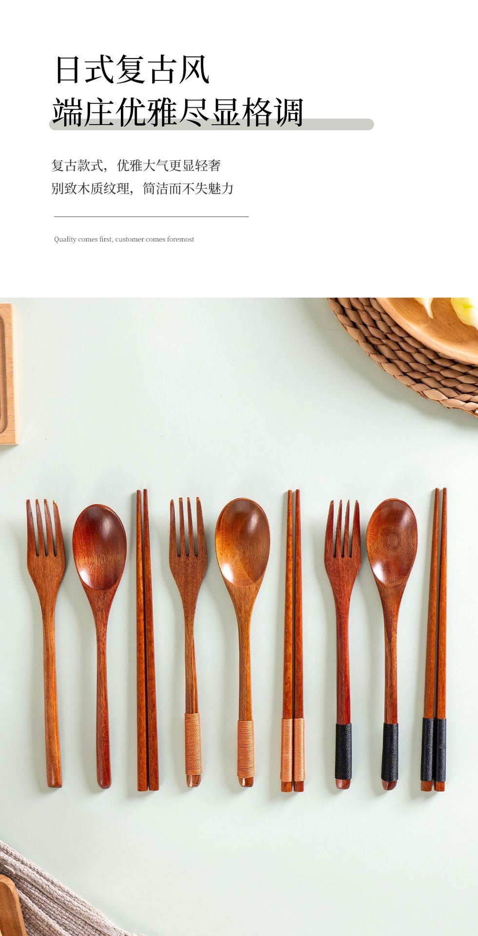 日式缠线楠木勺叉筷三件套跨境防滑实木叉子筷子布袋套装便捷餐具