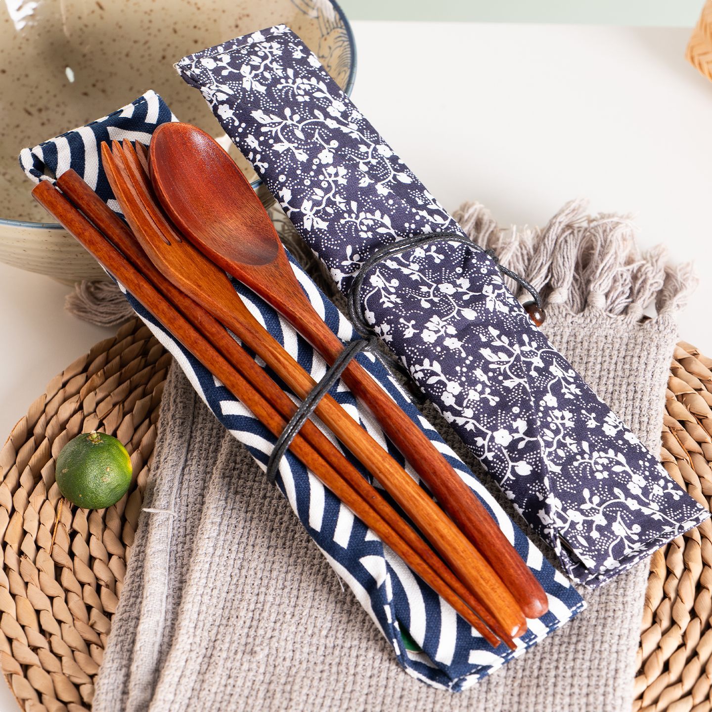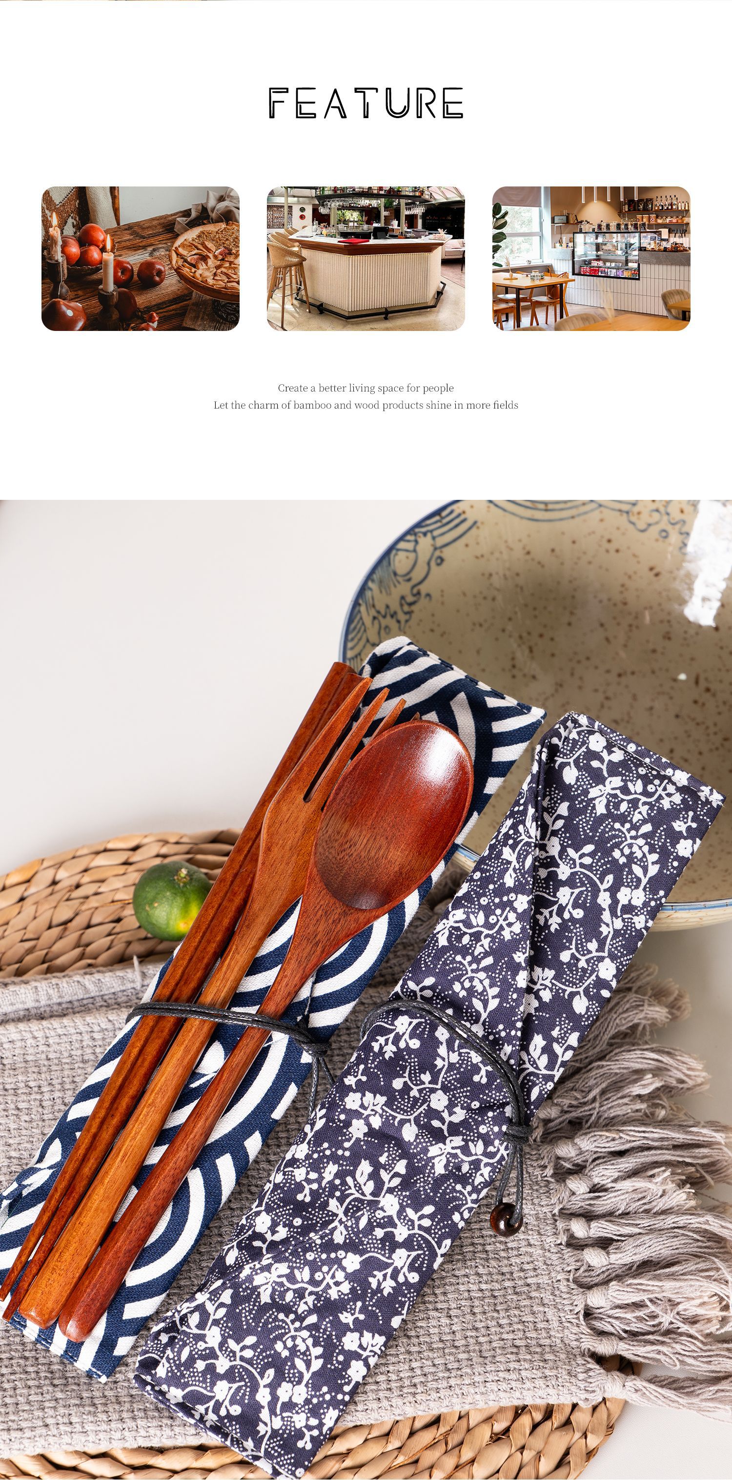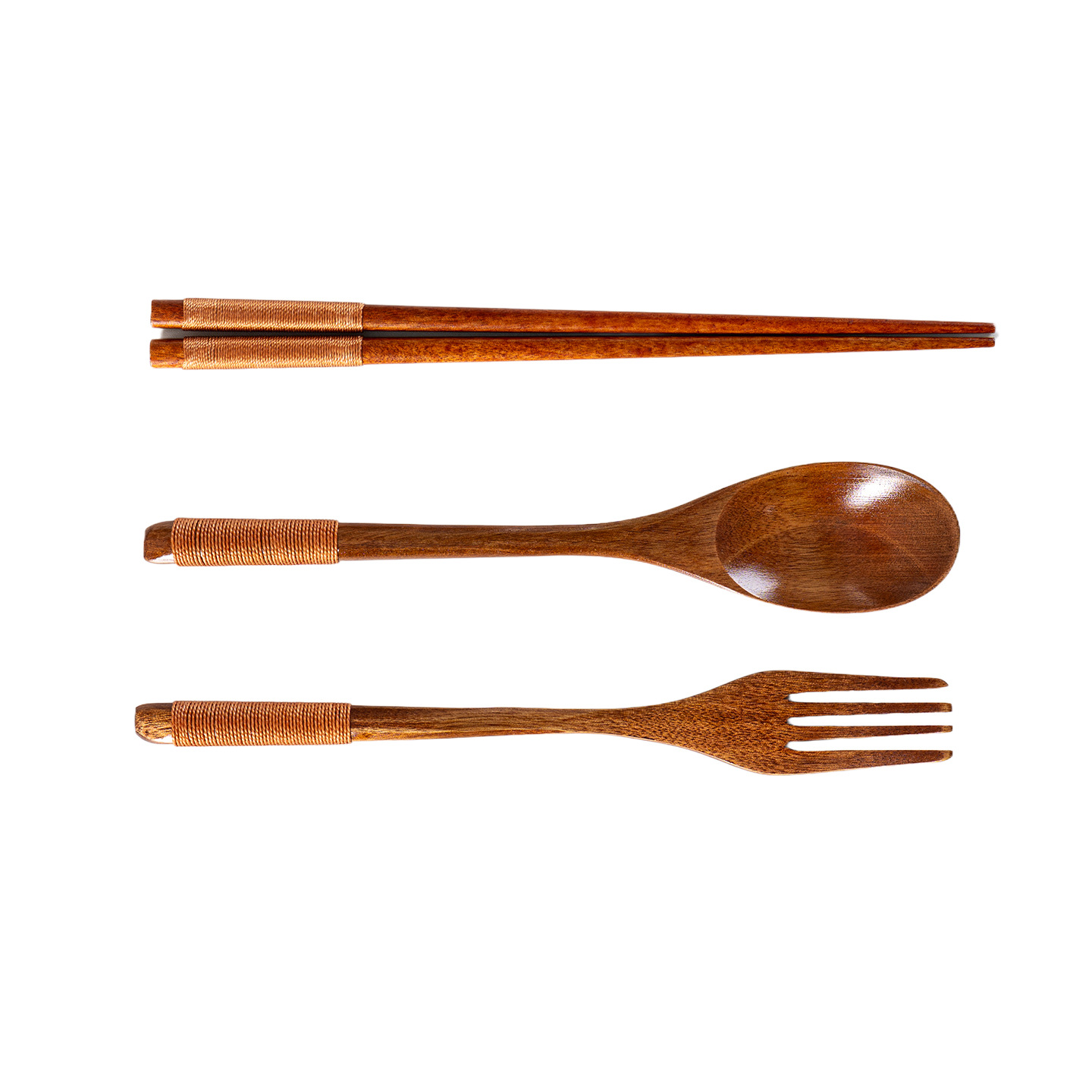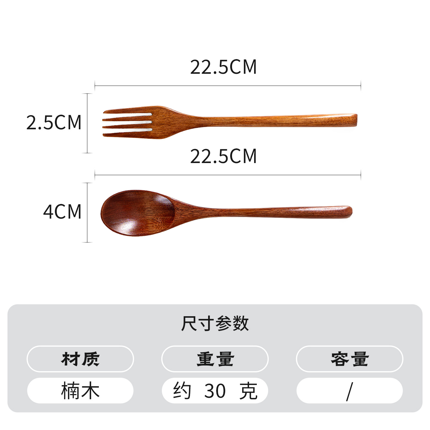日式缠线楠木勺叉筷三件套跨境防滑实木叉子筷子布袋套装便捷餐具