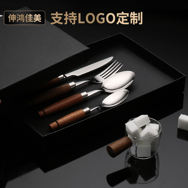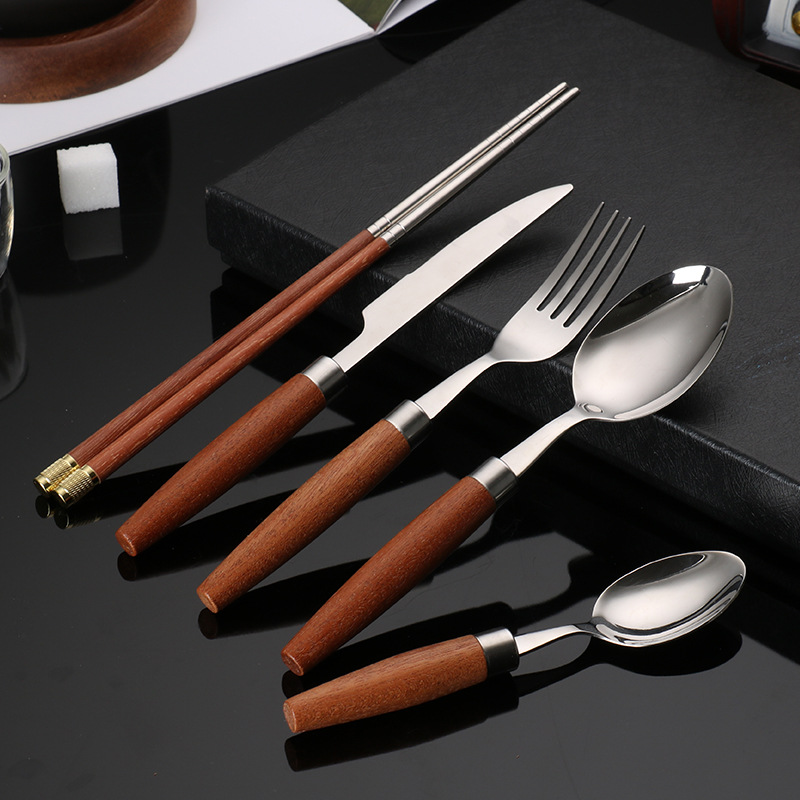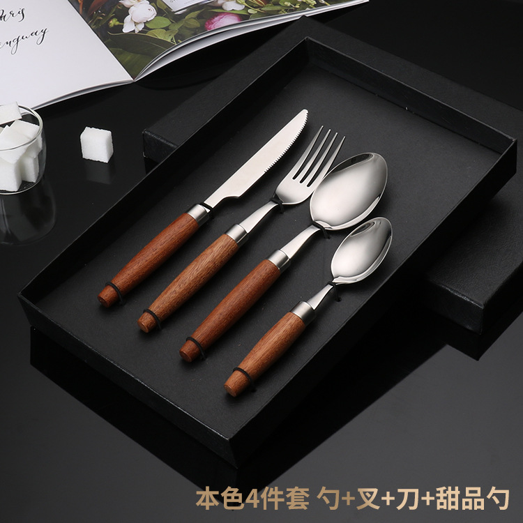 304不锈钢刀叉勺木柄餐具三件套西餐牛排刀筷子套装装红檀木日用