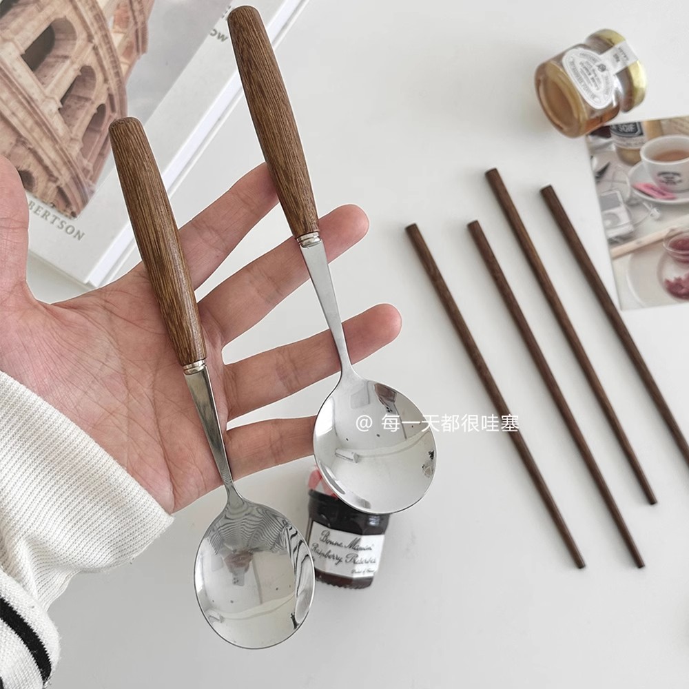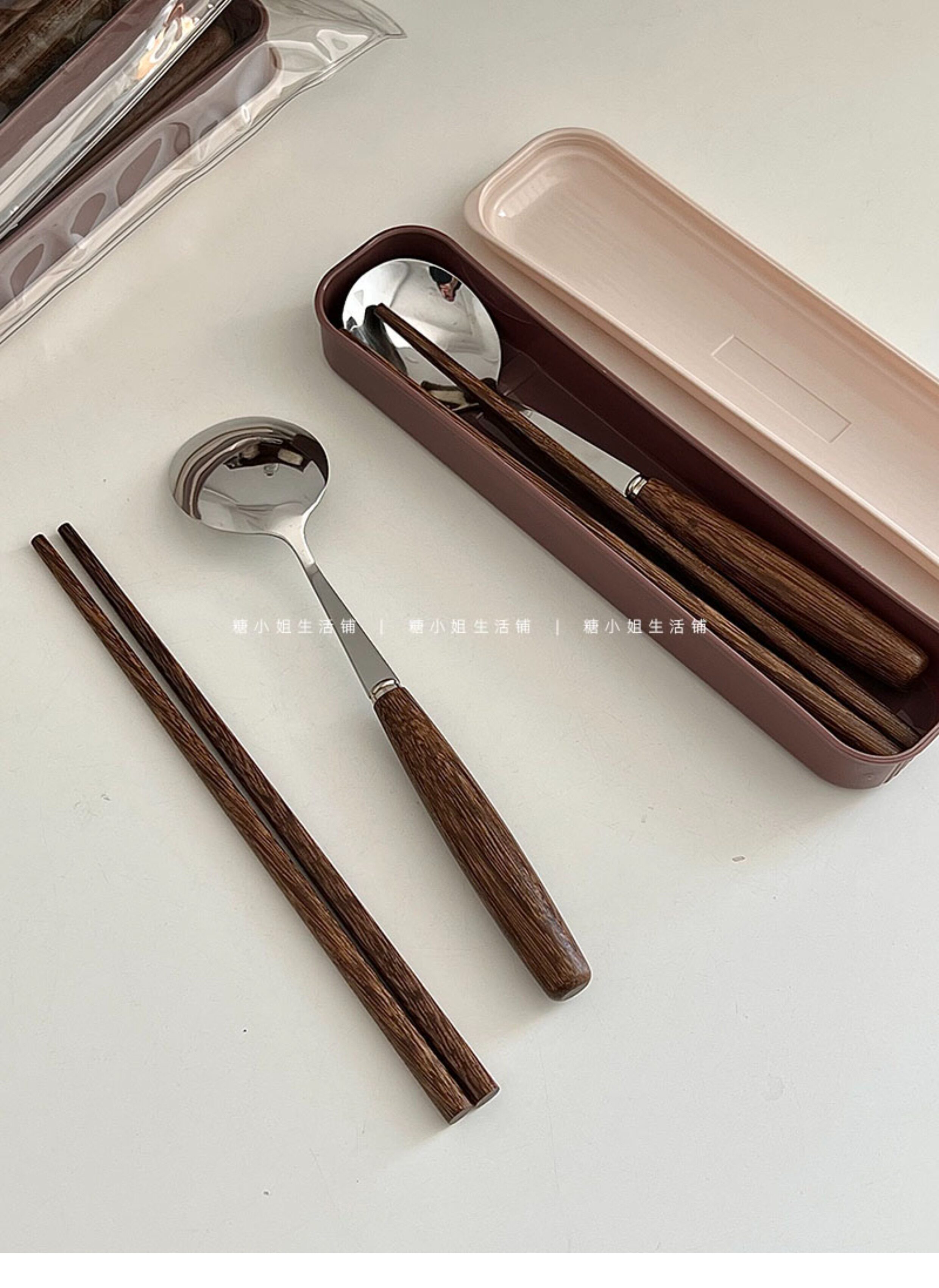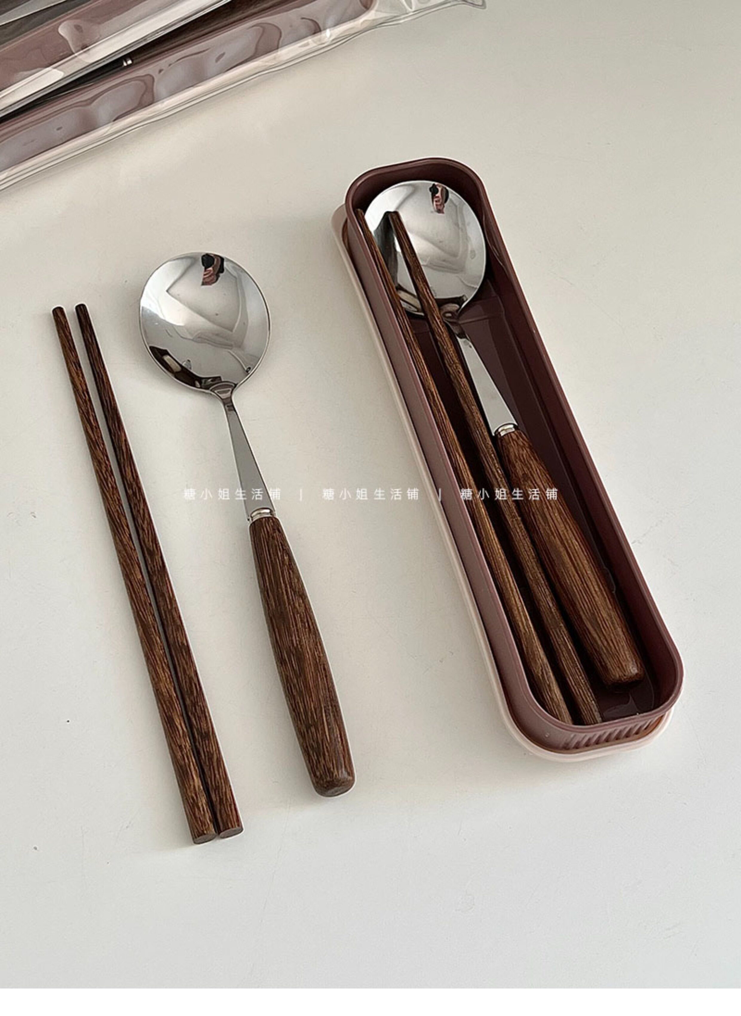 高级感复古仿鸡翅木勺子筷子不锈钢木柄上班学生便携套装餐具木勺