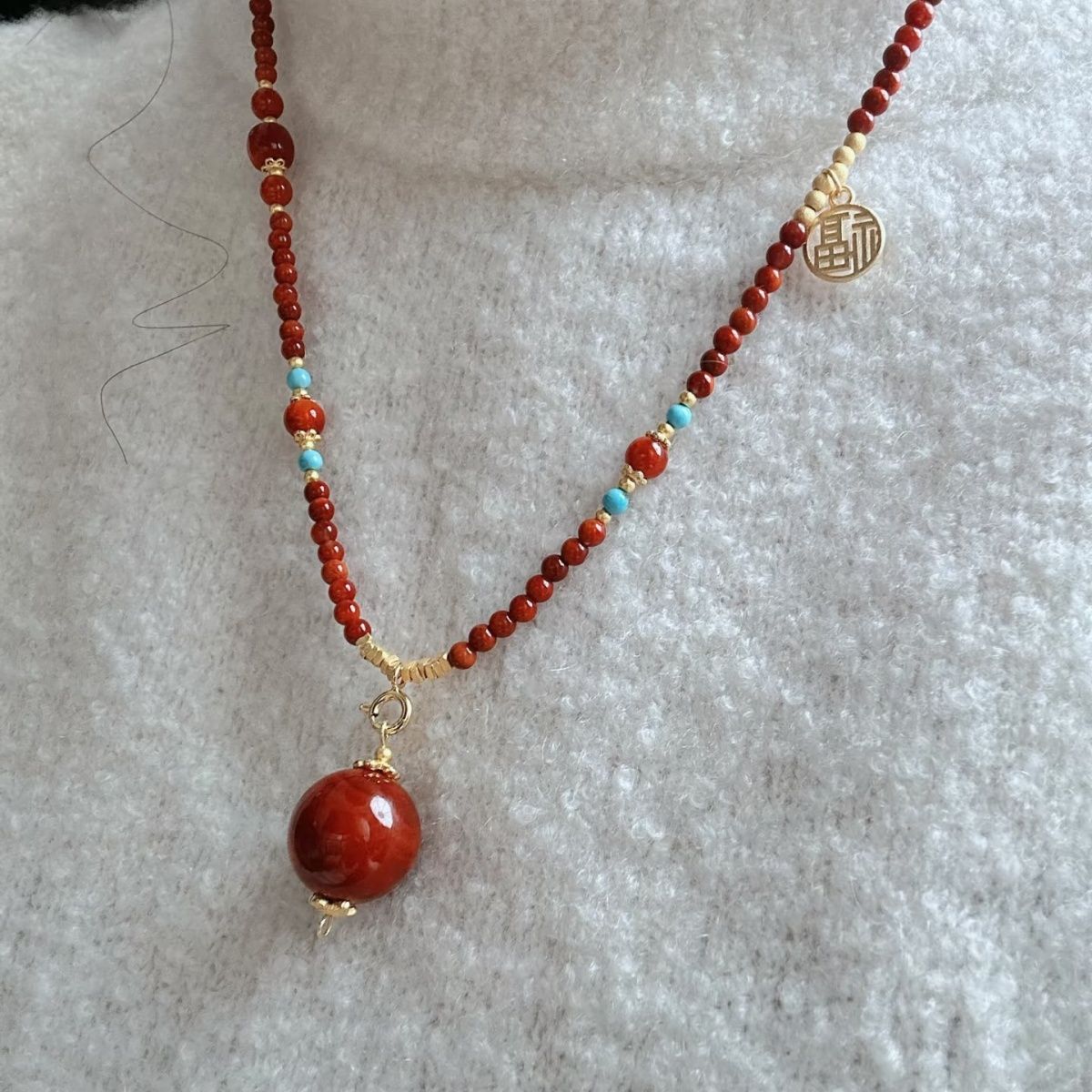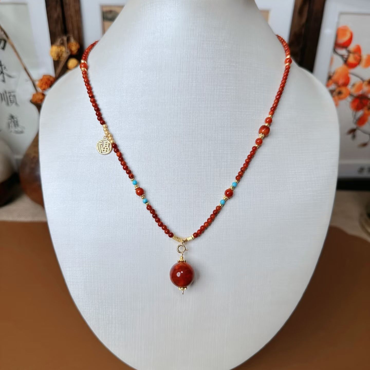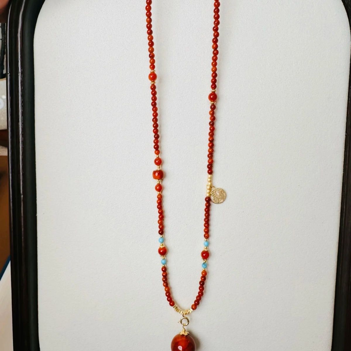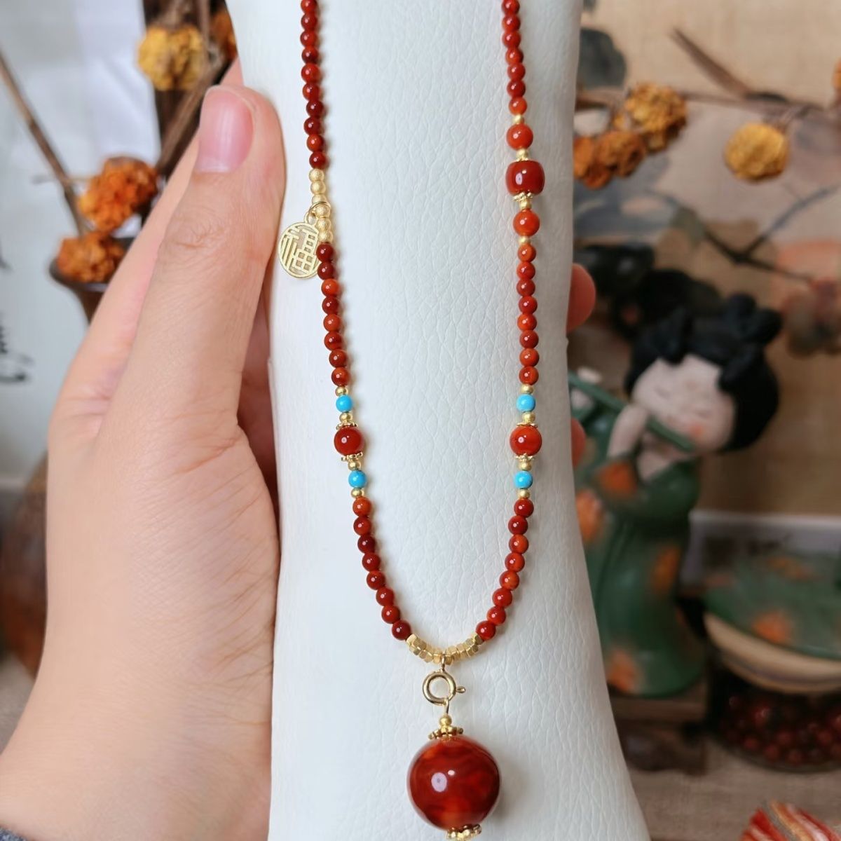 原创设计南红小米珠项链吊坠锁骨项链万能中式毛衣链红玛瑙百搭