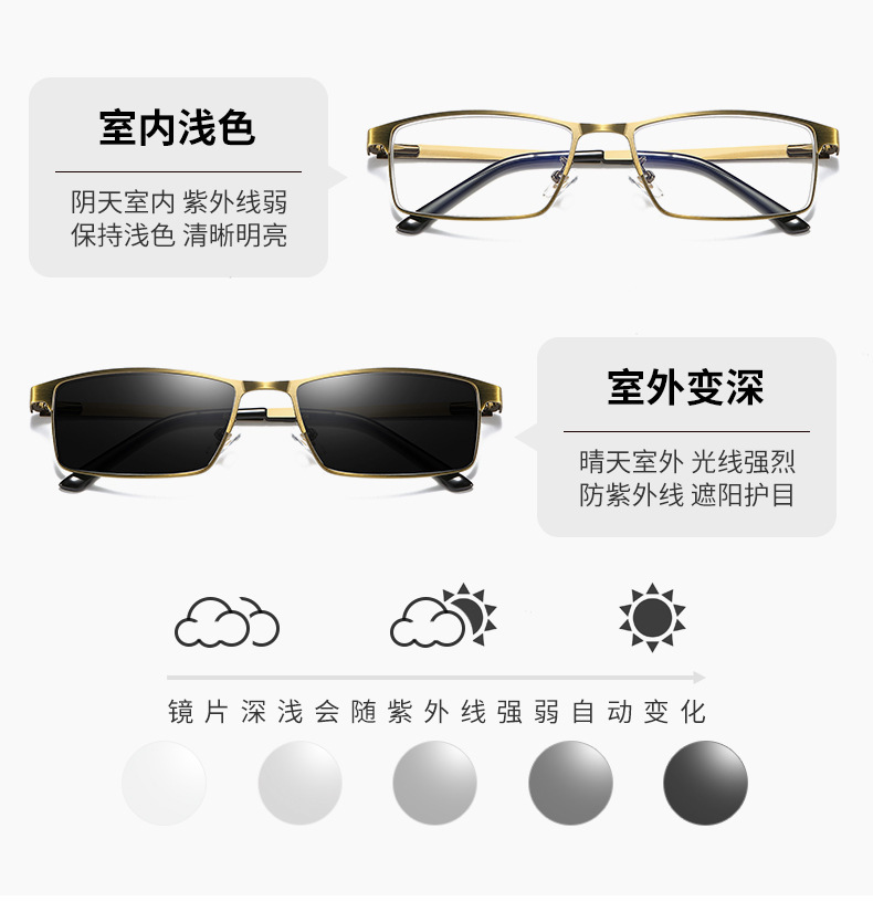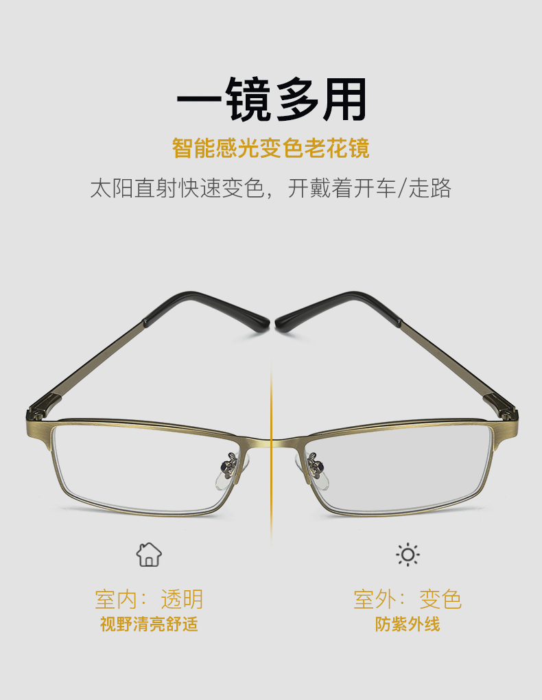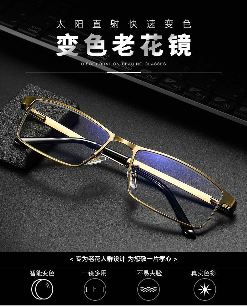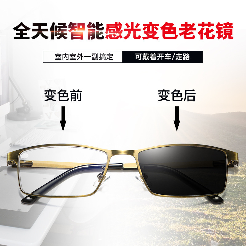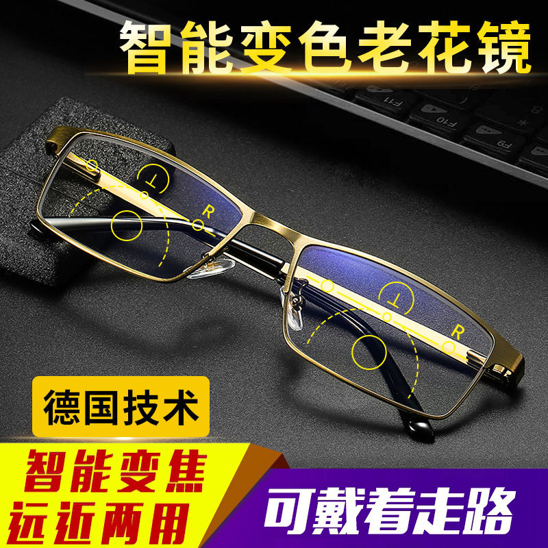 男女金属古铜护眼防蓝光老人眼镜智能变色远近两用多交点老花镜