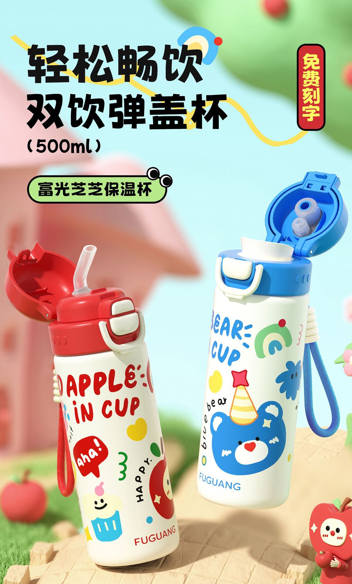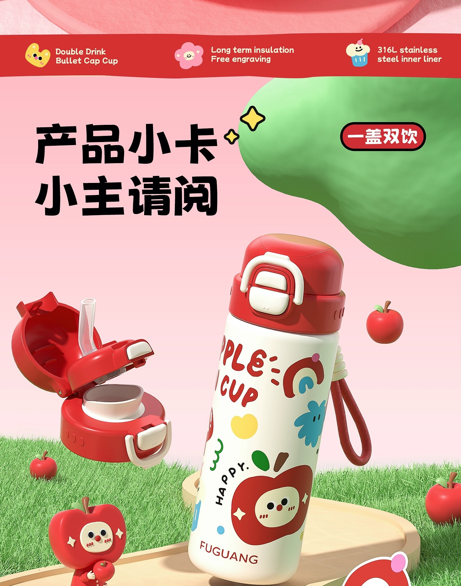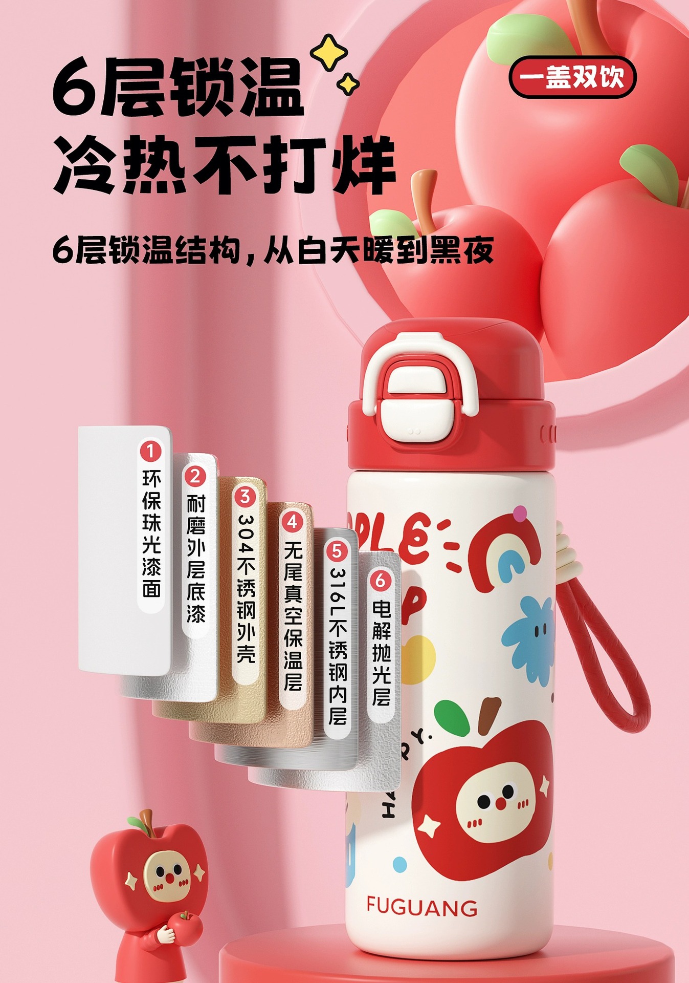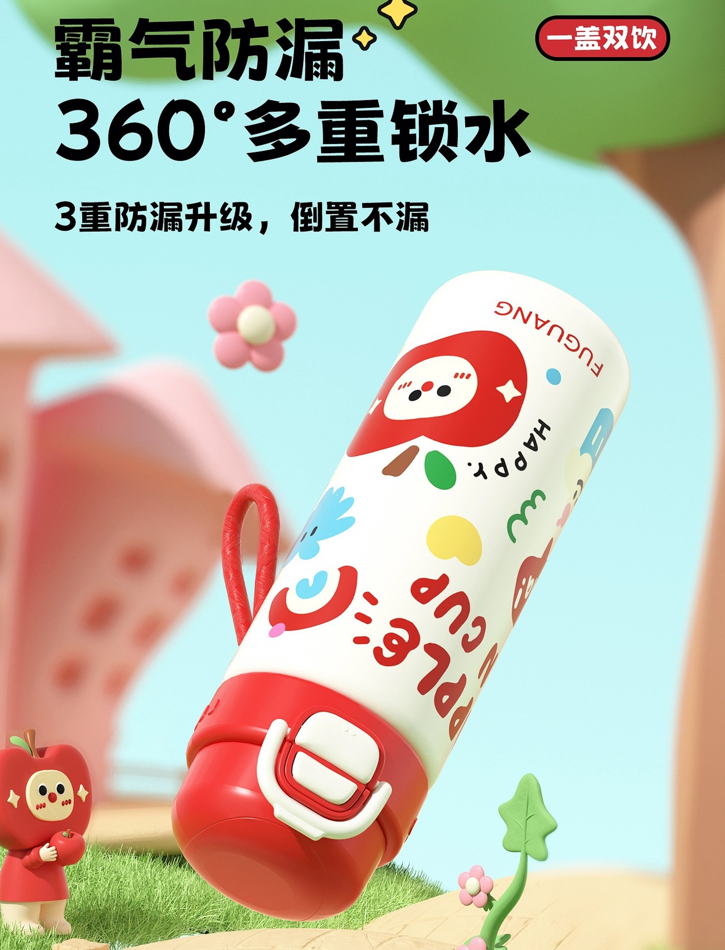 富光双饮保温杯316L不锈钢杯子男女学生专用户外便携提绳水杯吸管