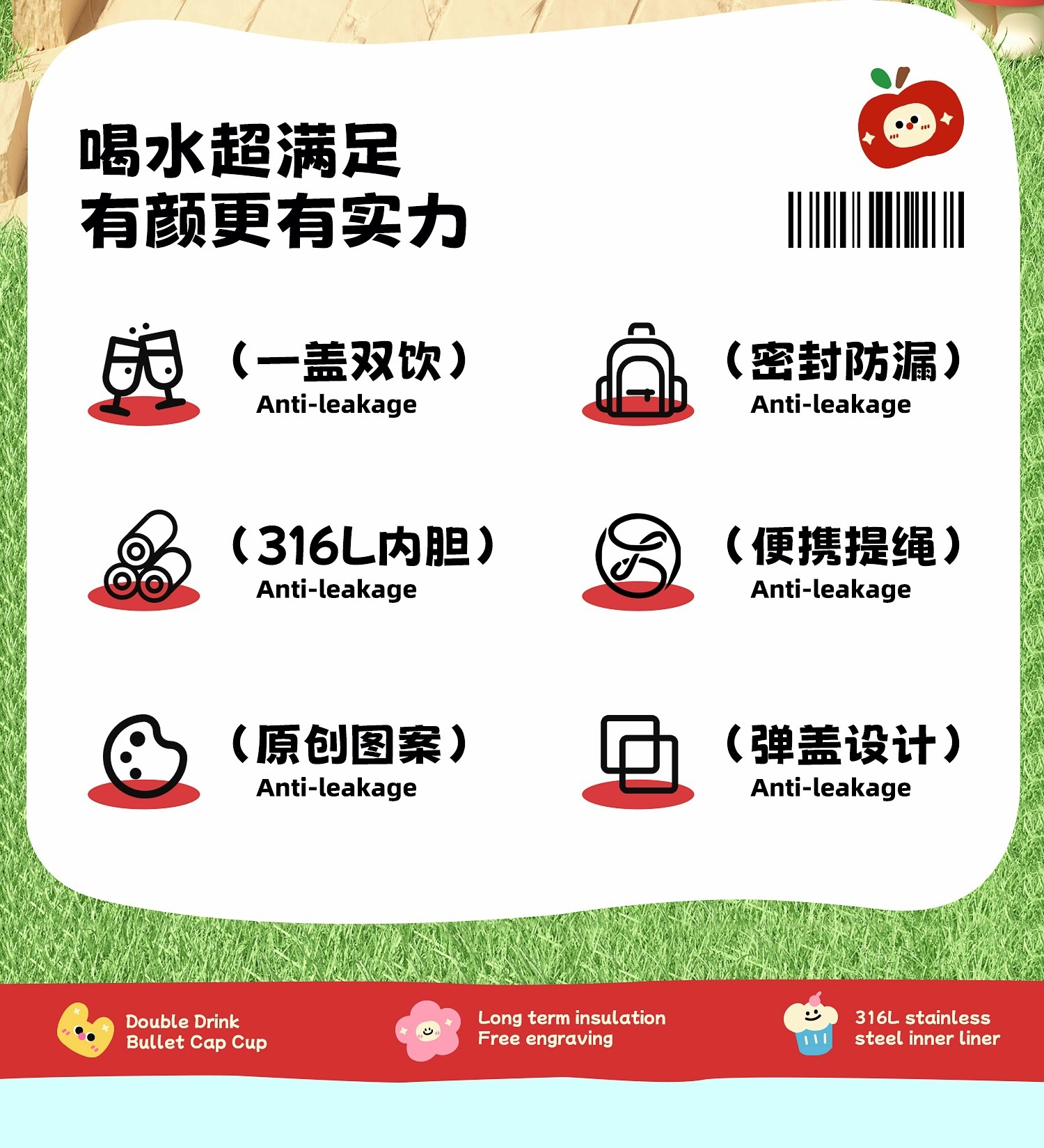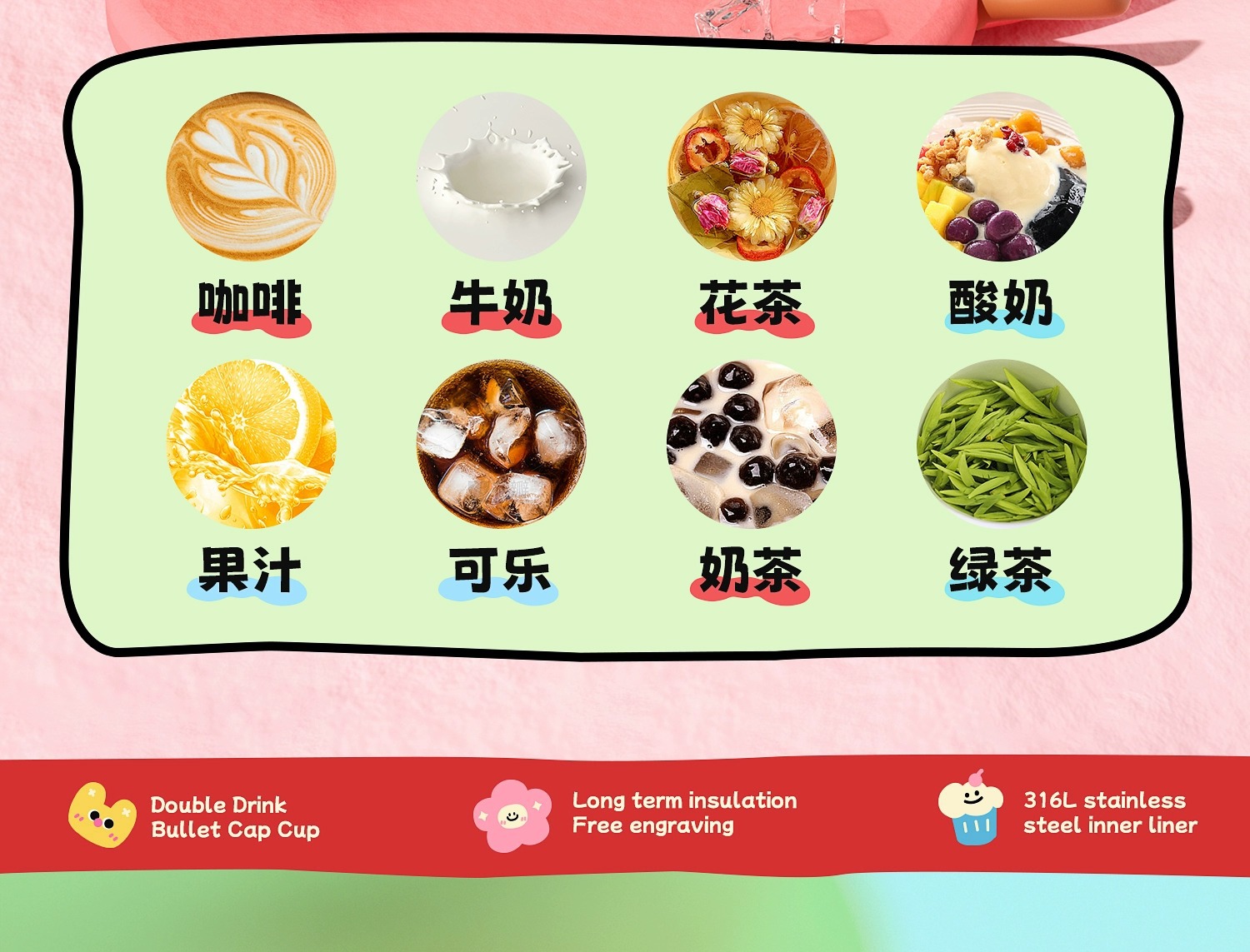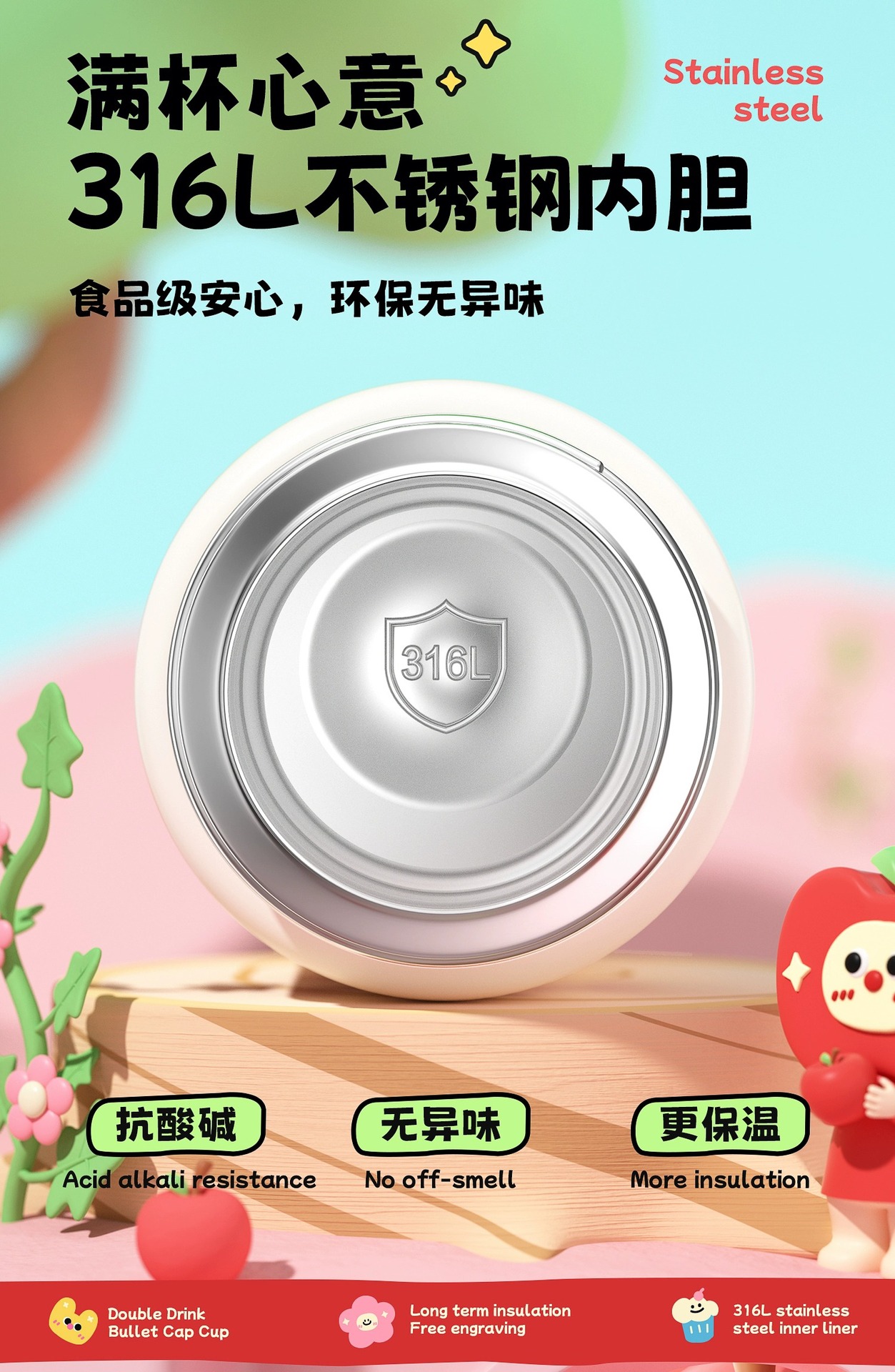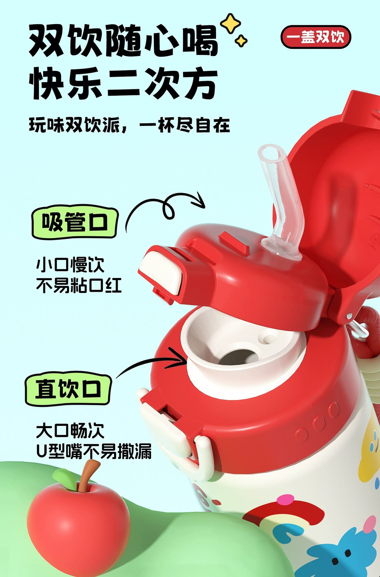 富光双饮保温杯316L不锈钢杯子男女学生专用户外便携提绳水杯吸管