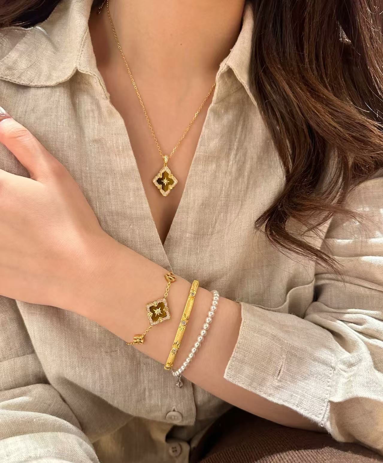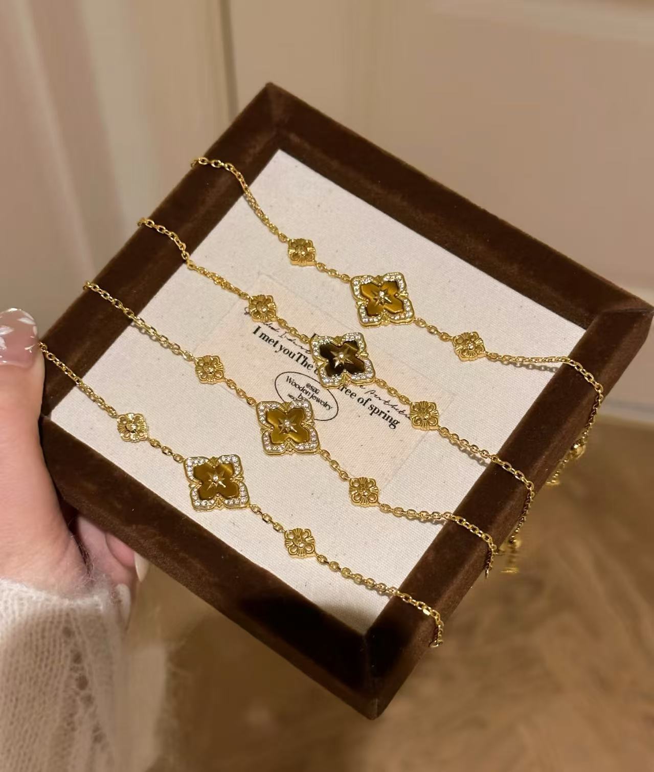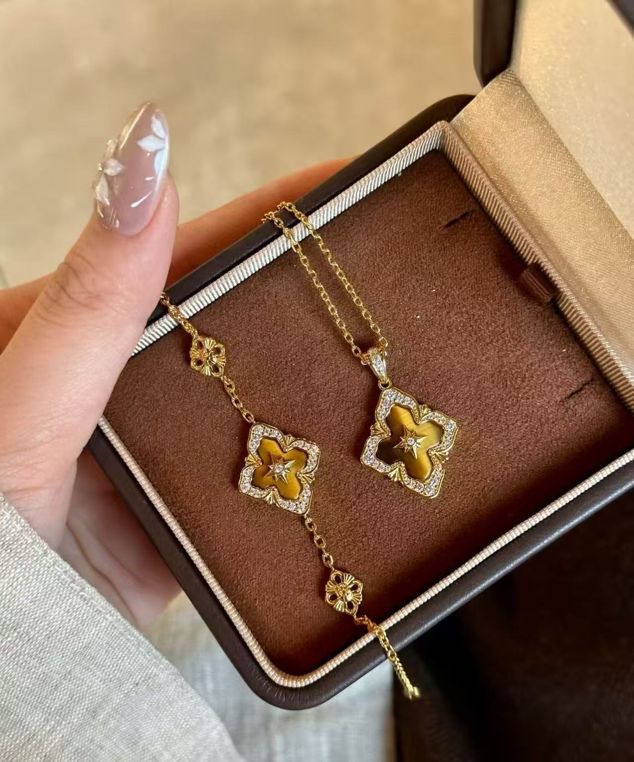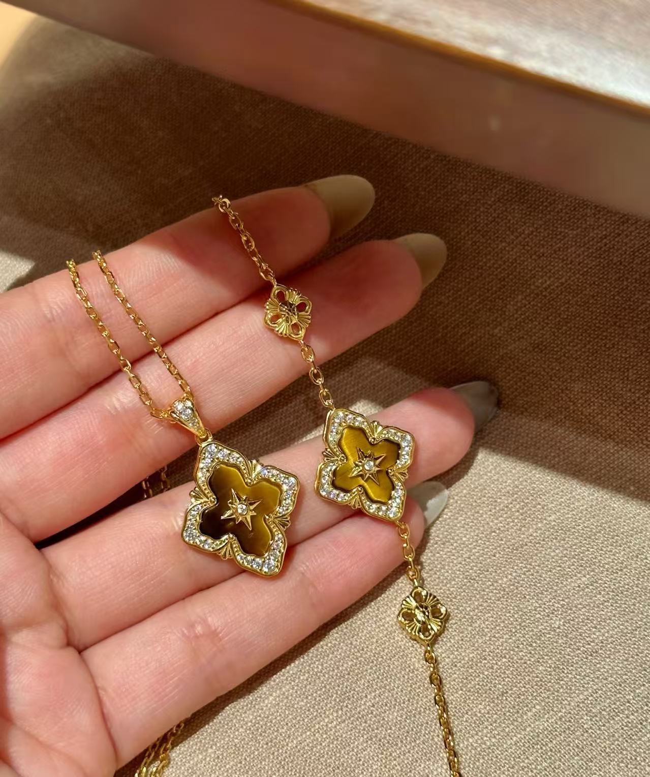 纯银S925布家风四叶草虎眼项链手链套装重工布契拉丝套装轻奢高级