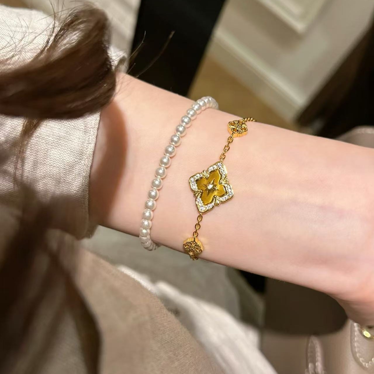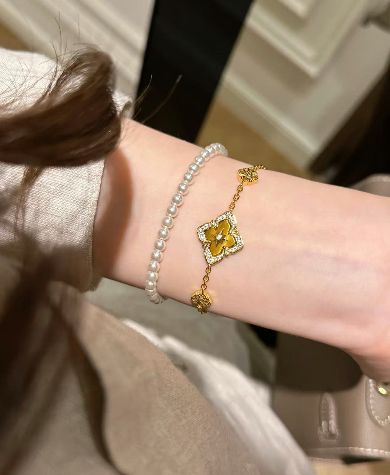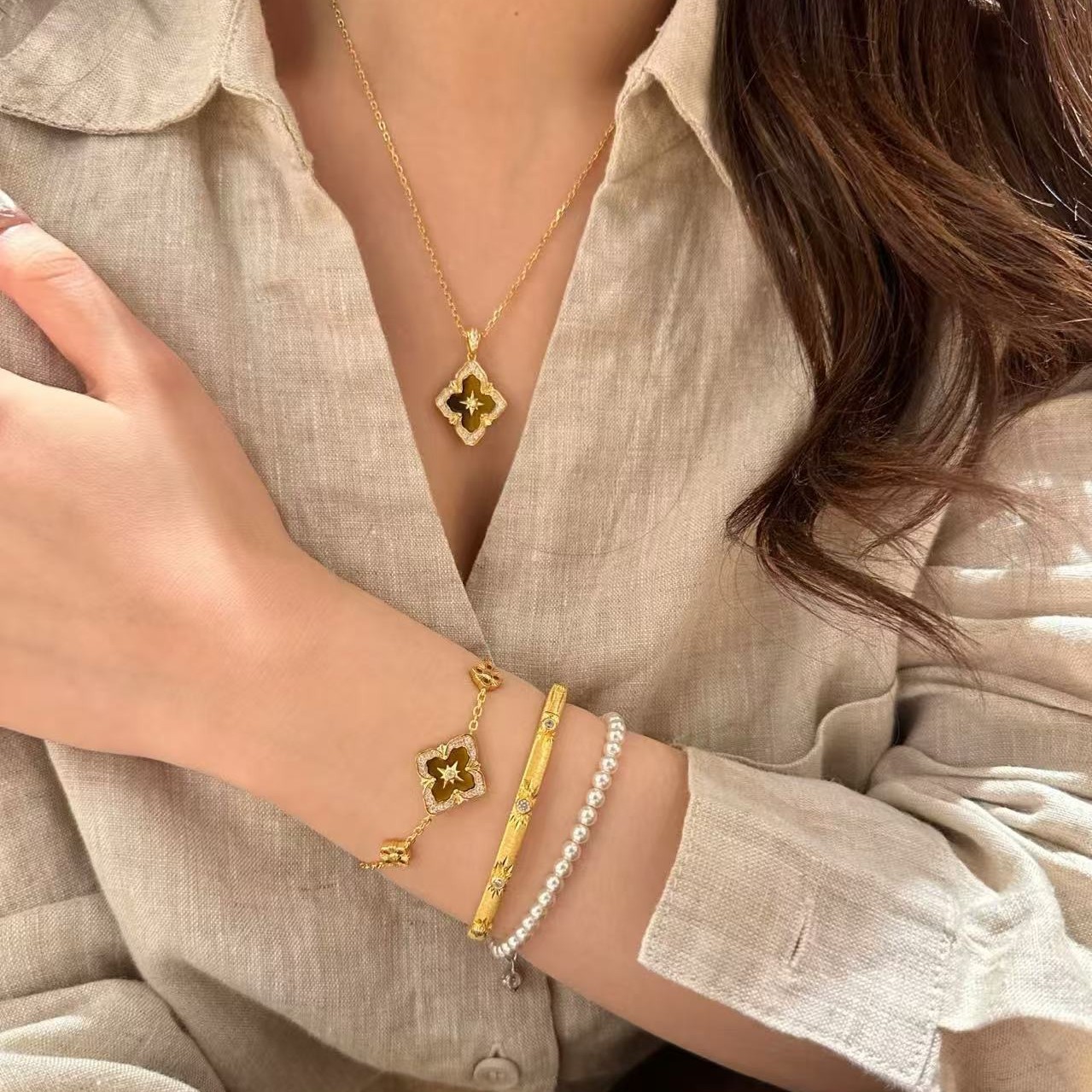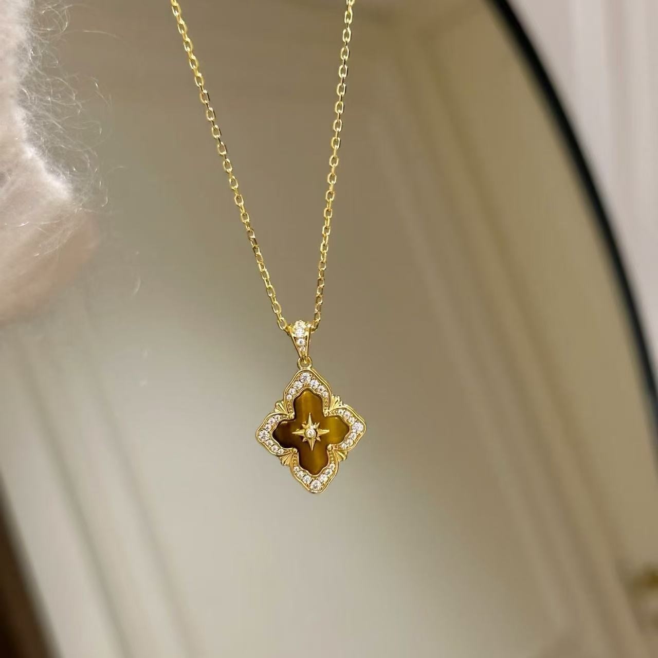 纯银S925布家风四叶草虎眼项链手链套装重工布契拉丝套装轻奢高级