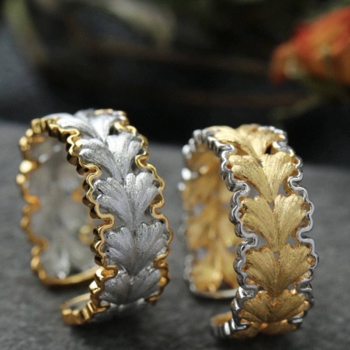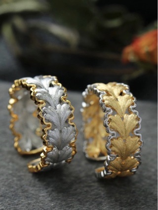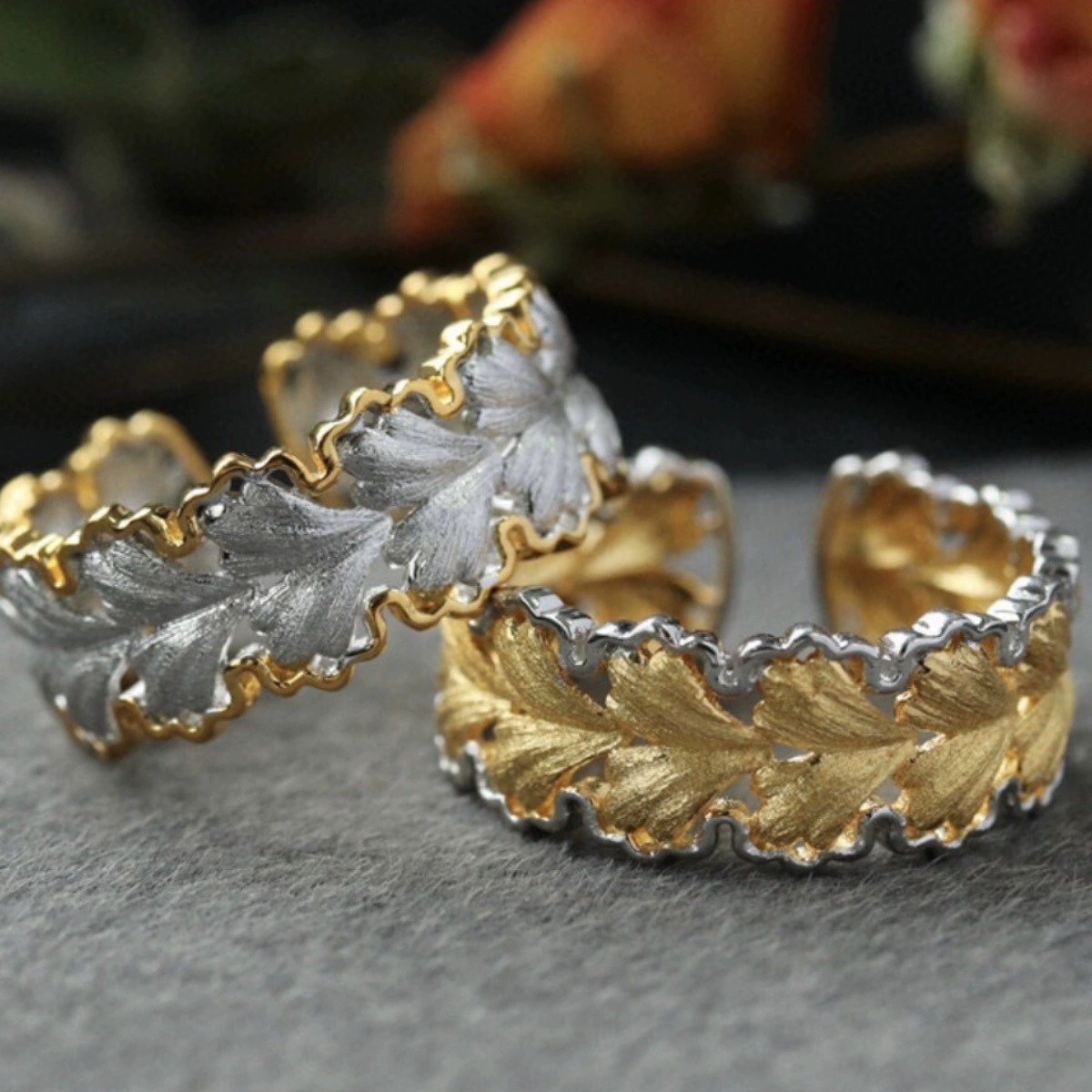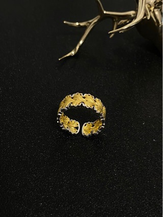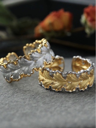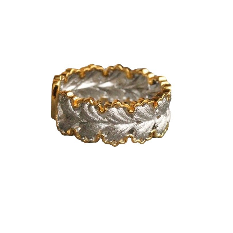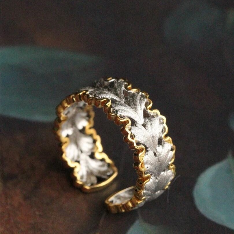 意大利中古拉丝轻奢高级珠宝925纯银拉丝分色电镀银杏叶戒指新款