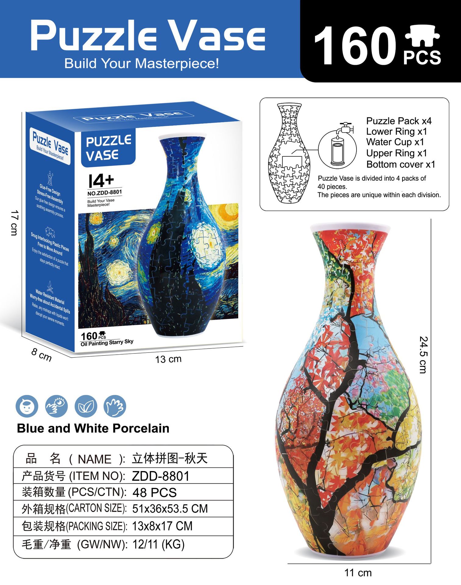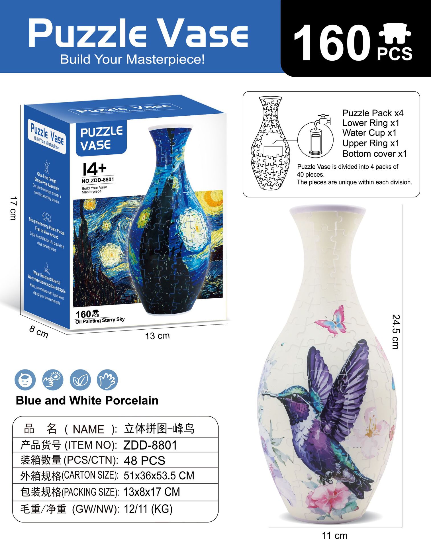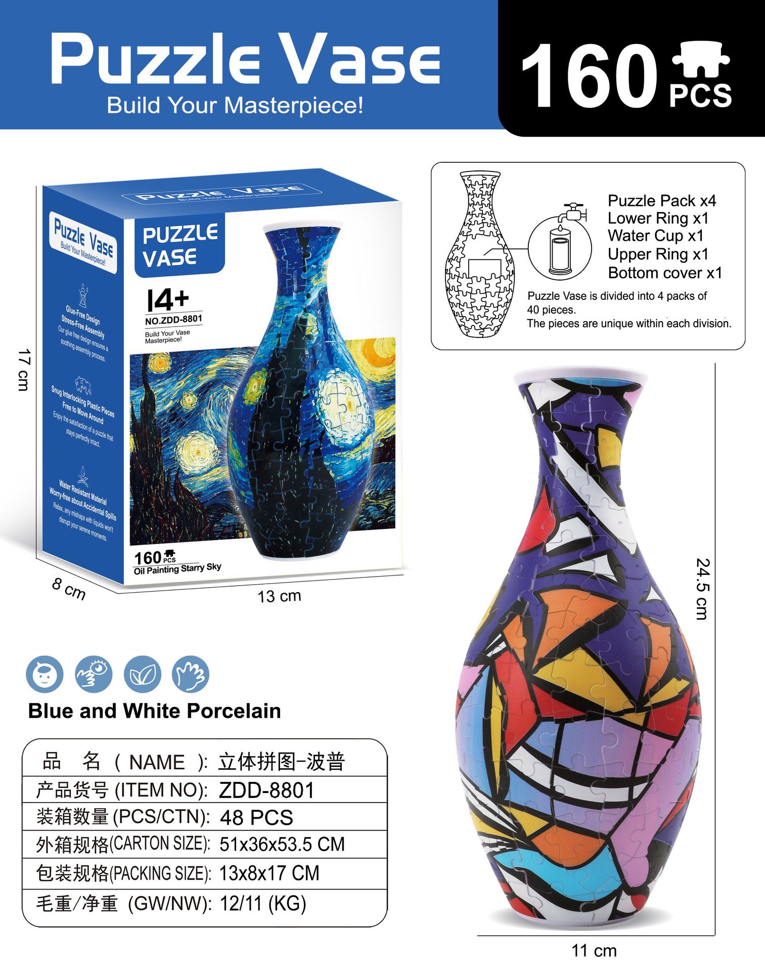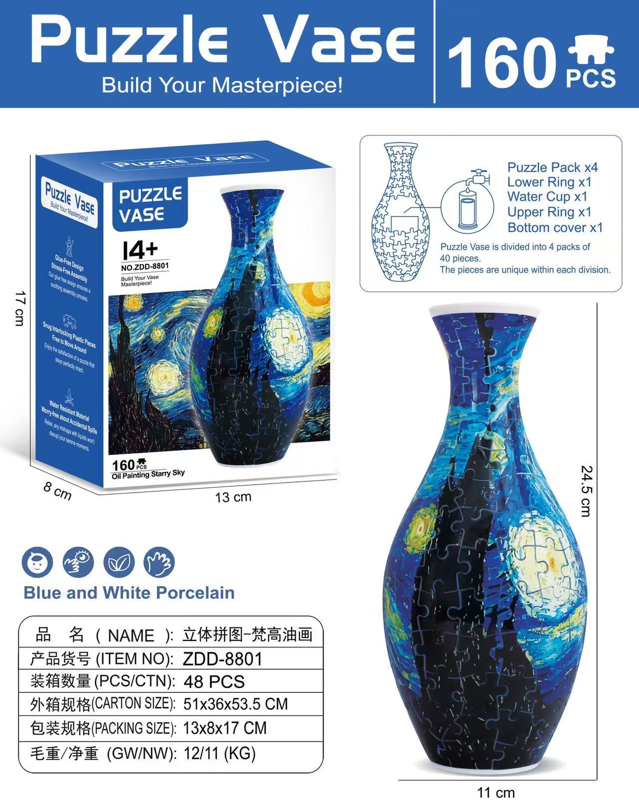 跨境3D拼图花瓶DIY 摆件玩具青花瓷拼图插板插花装饰儿童礼物玩具
