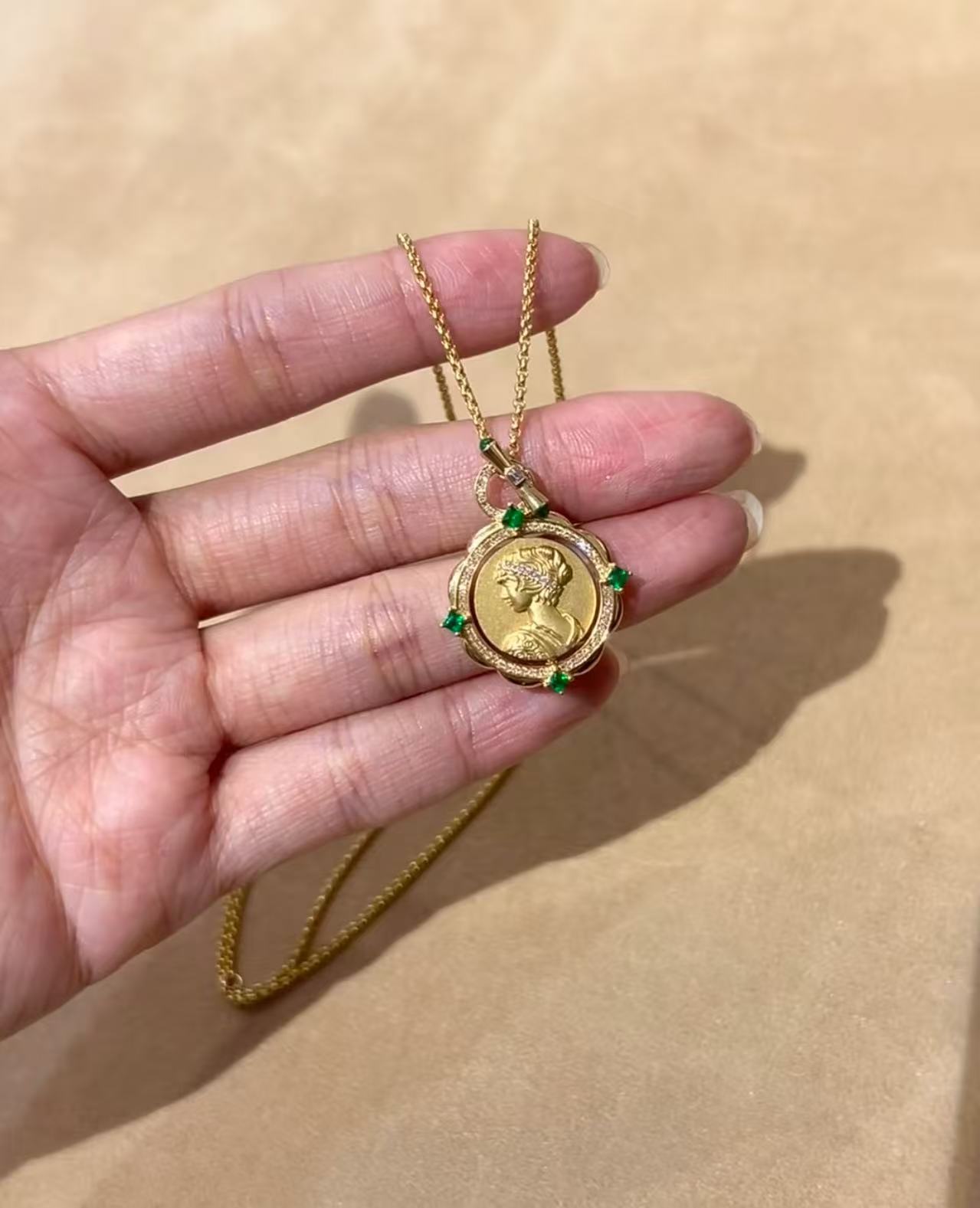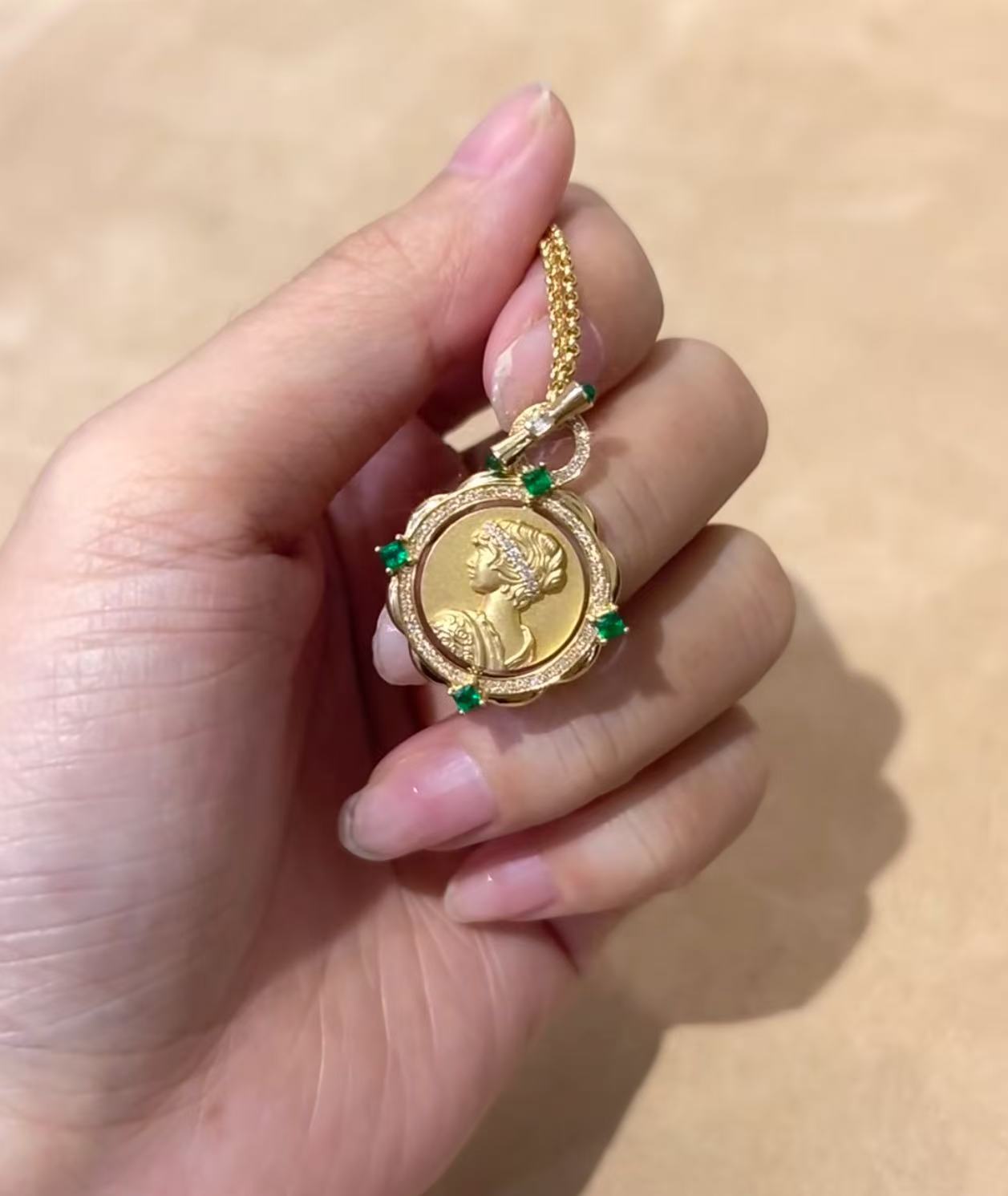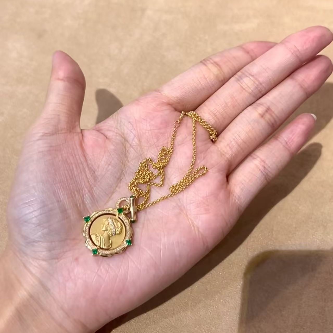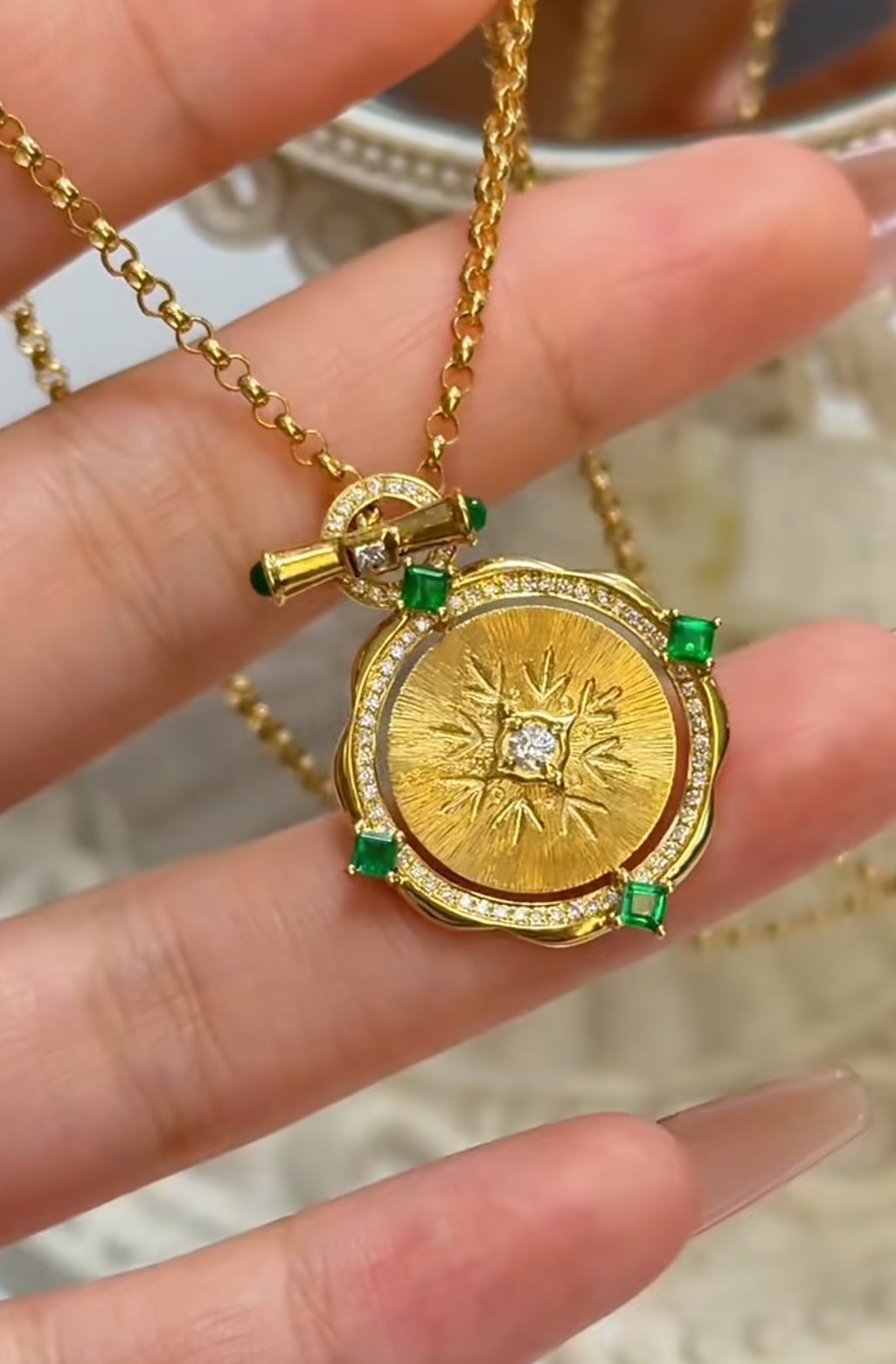 纯银S925拉丝工艺祖母绿女王双面可转动项链精致独特气质锁骨链