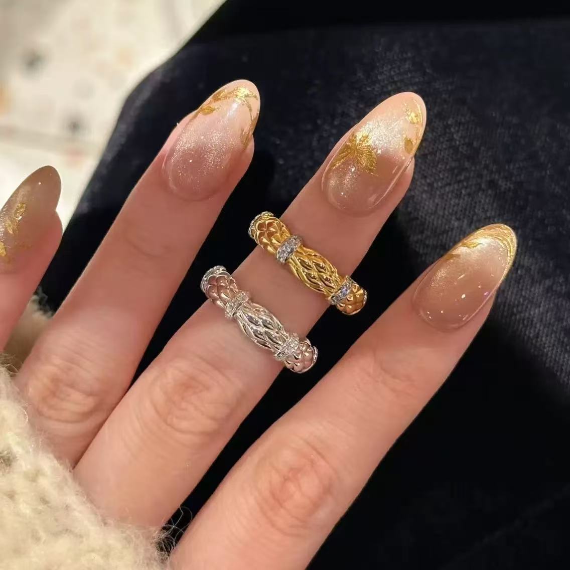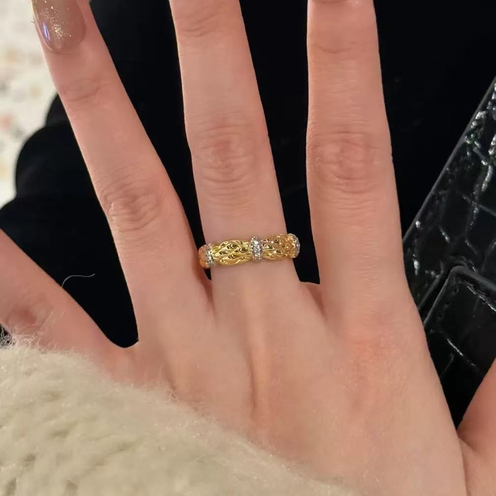 s925纯银法式轻奢高碳钻小香菱格戒指格纹镶钻复古老钱风