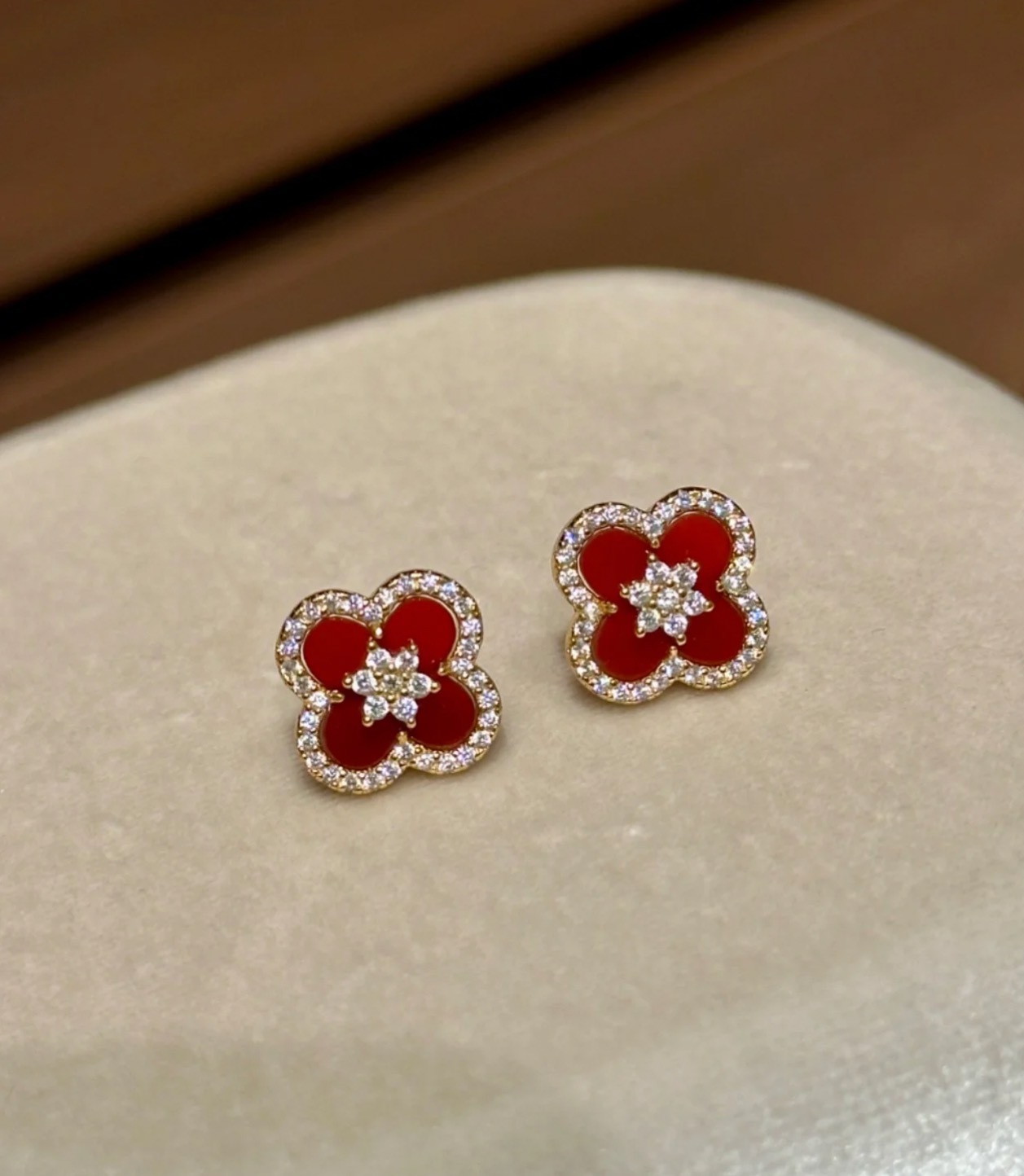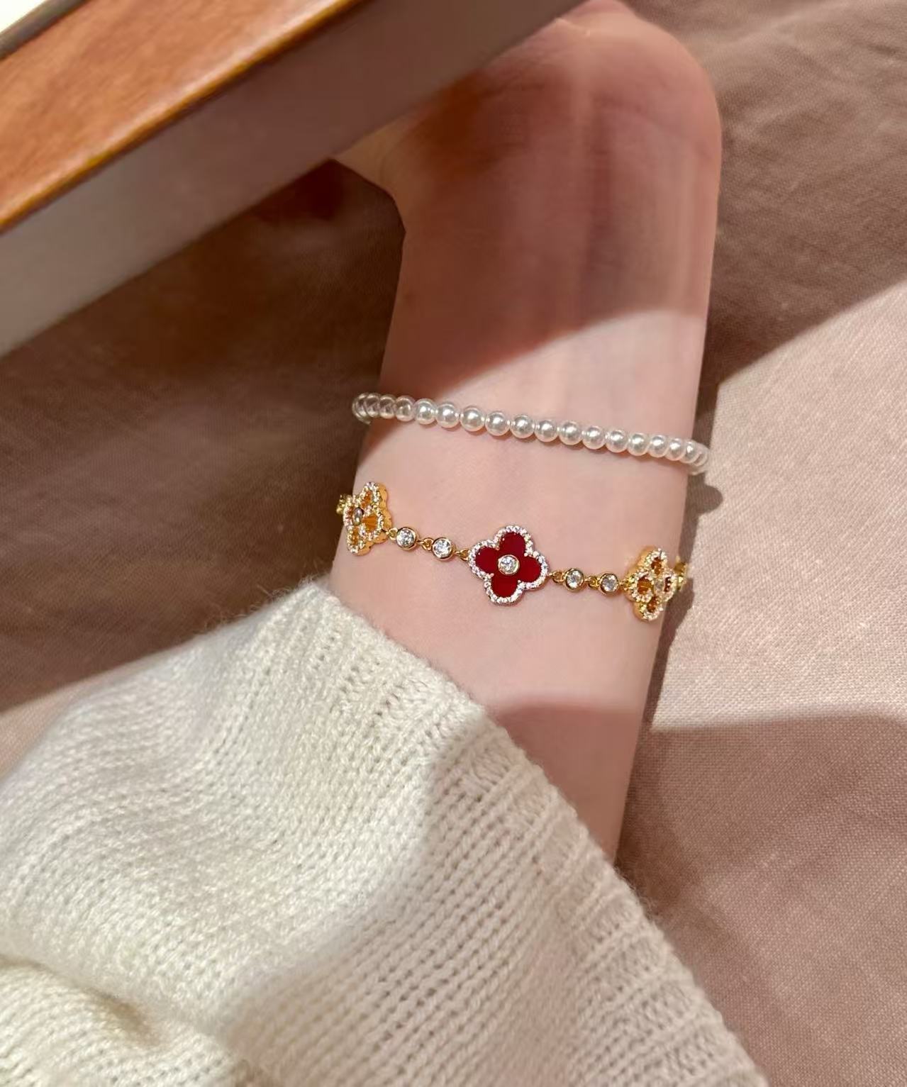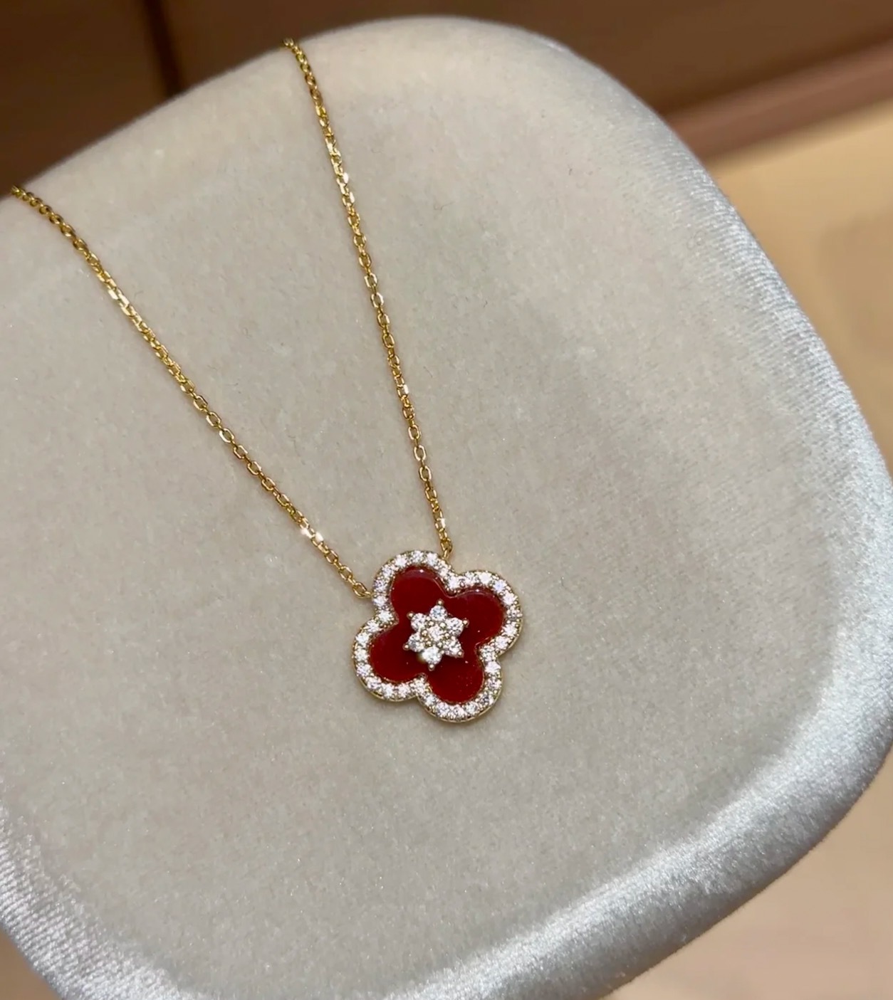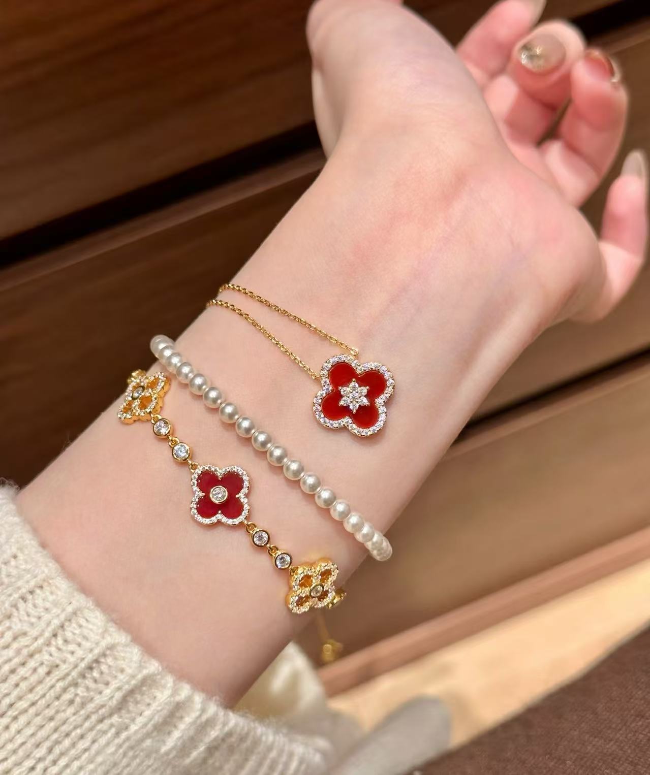 纯银S925四叶草红玉髓项链耳钉手链套装时尚百搭个性轻奢高级首饰