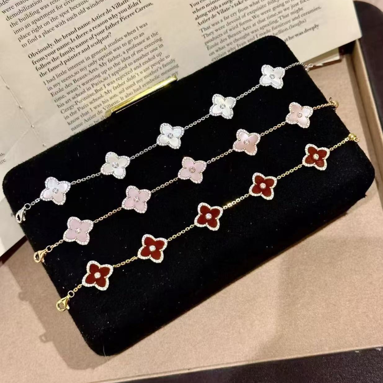 新款纯银s925四叶草天然粉贝白贝红玉髓手链尚百搭串珠