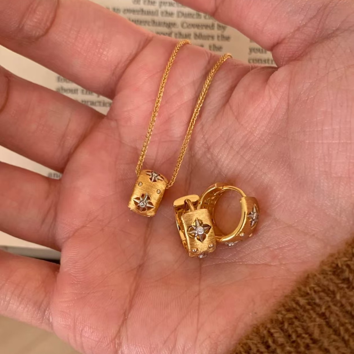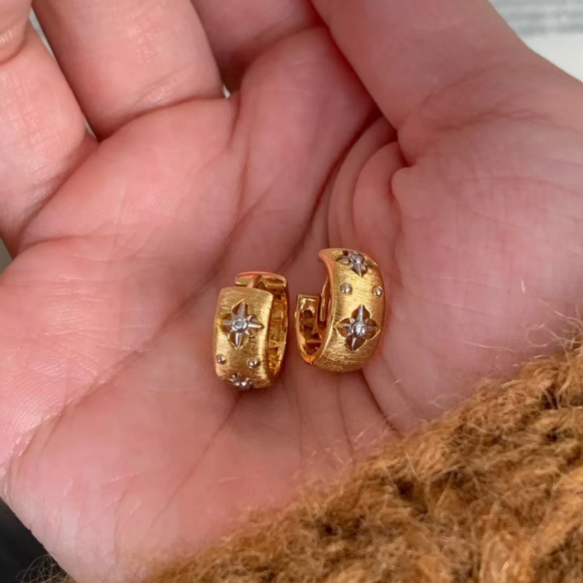 纯银s925中古金色八芒星布家风拉丝耳环复古设计感镂空四叶花耳扣