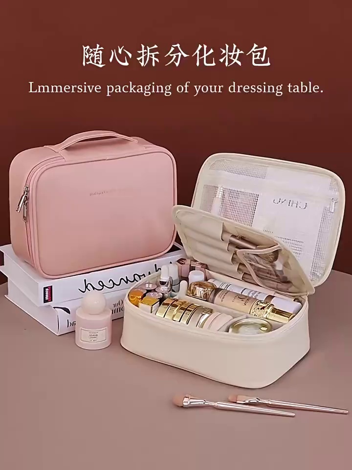 跨境新款自由分区大容量高级感手提化妆包旅行化妆刷收纳包洗漱袋