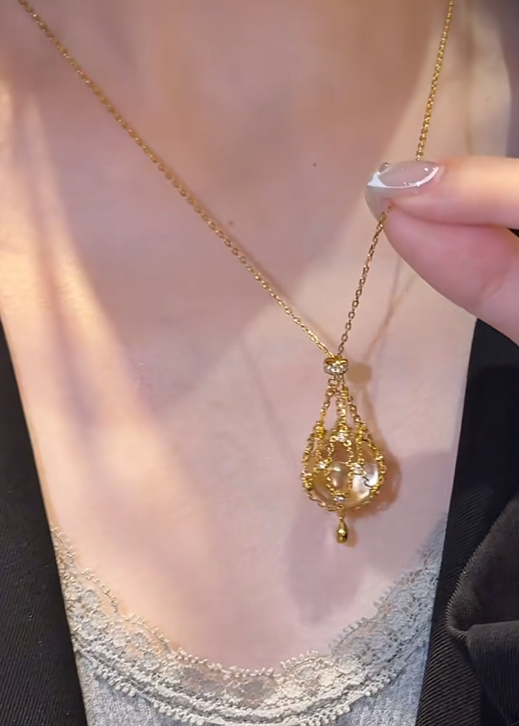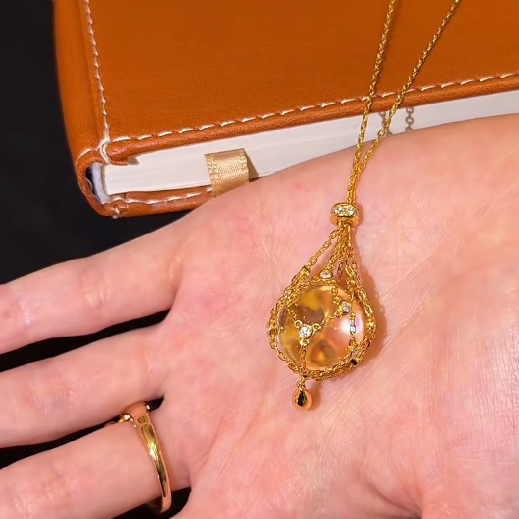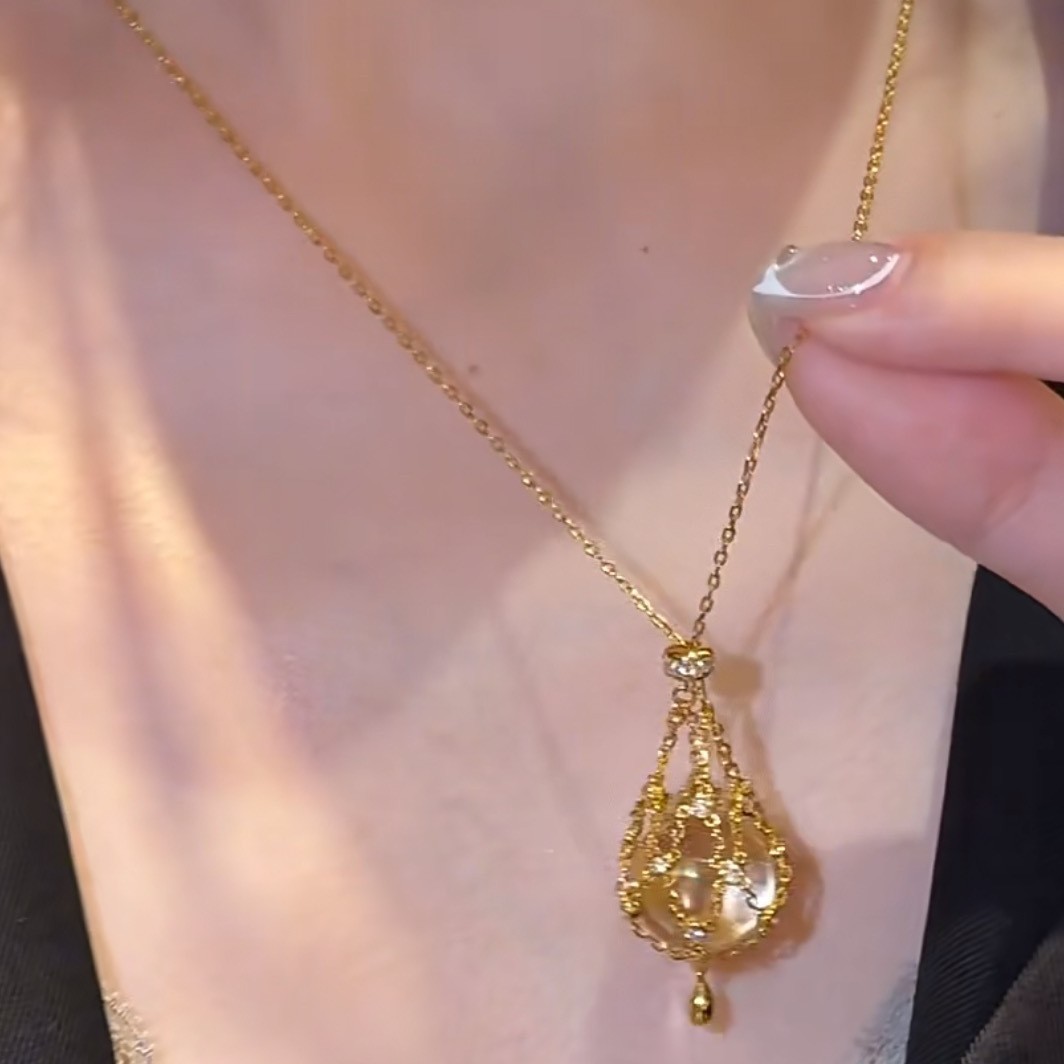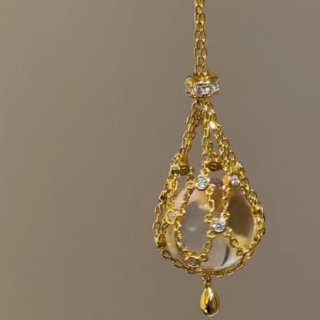纯银S925天然双A白水晶网兜项链复古时尚轻奢贵妇风毛衣链可调链