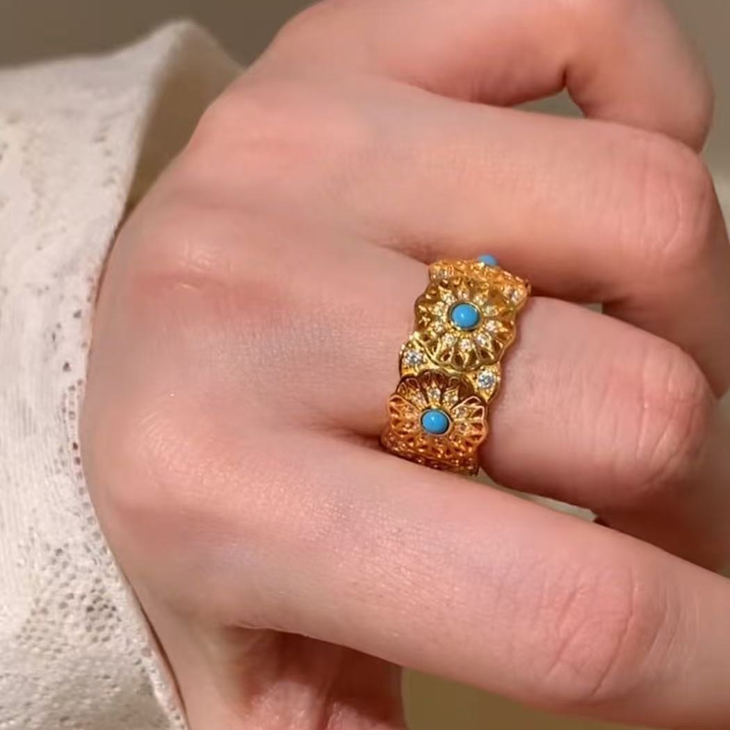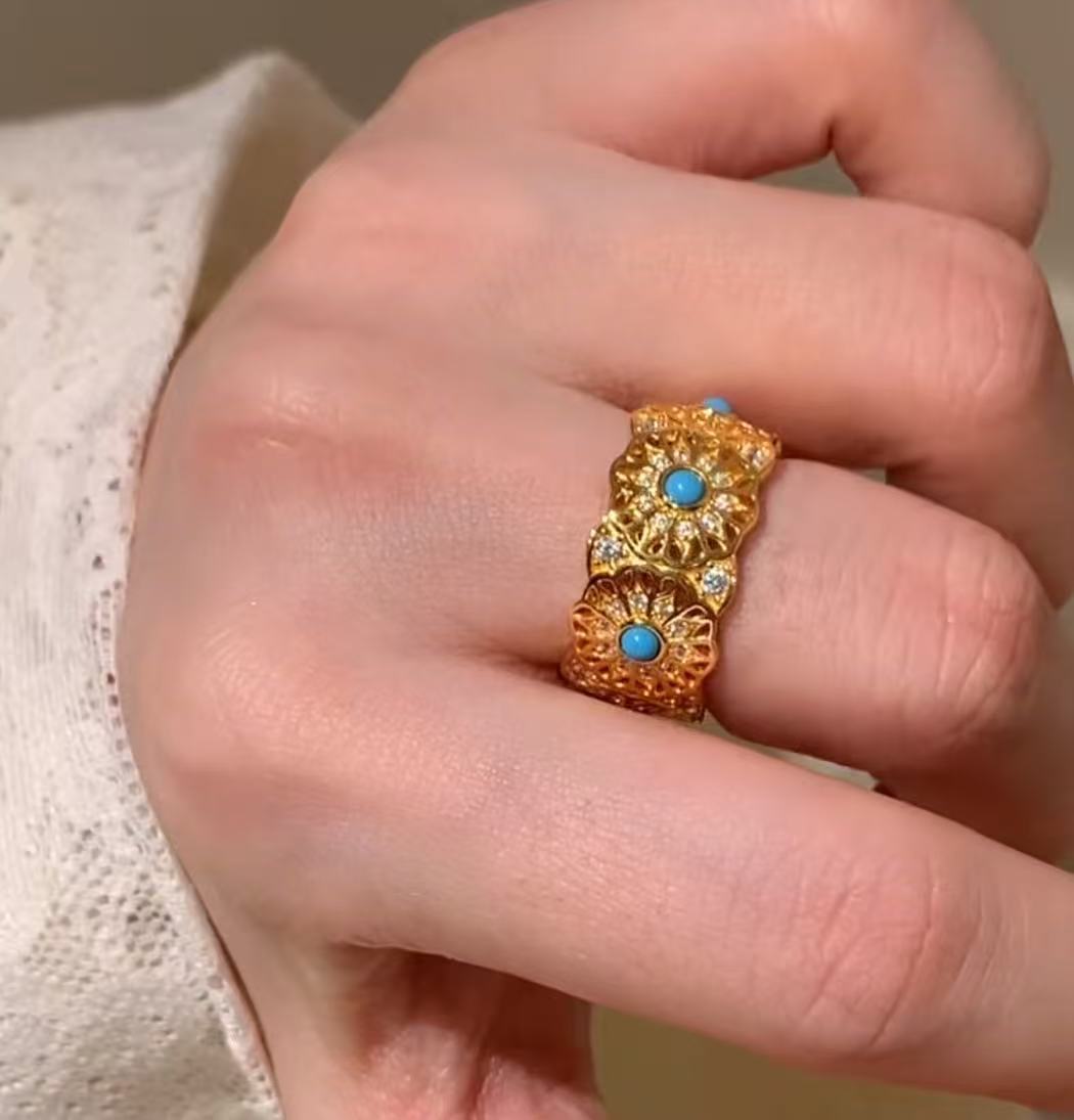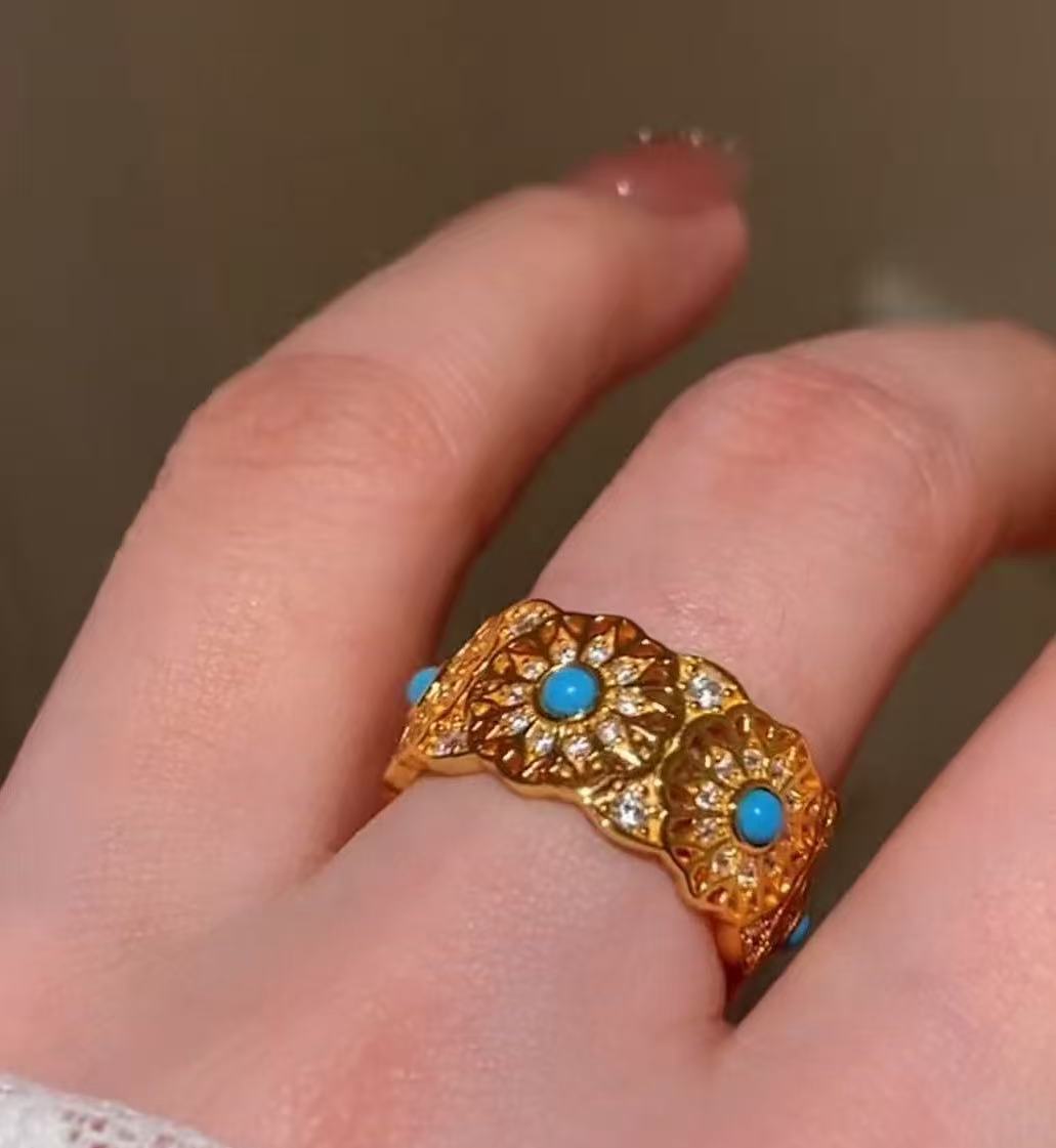 纯银S925中古vintage玫瑰花窗蓝松石戒指时尚轻奢复古高级指环