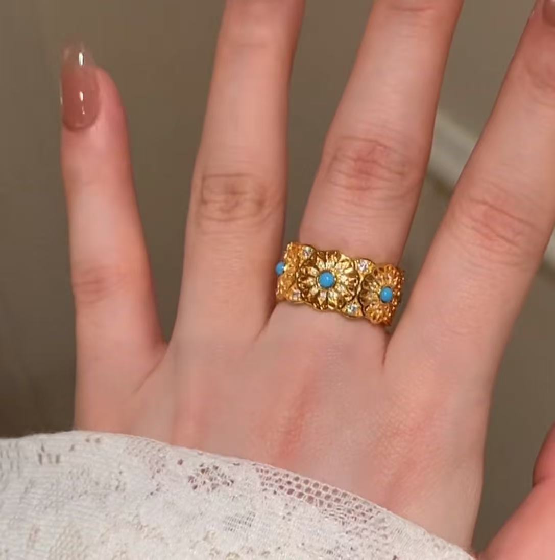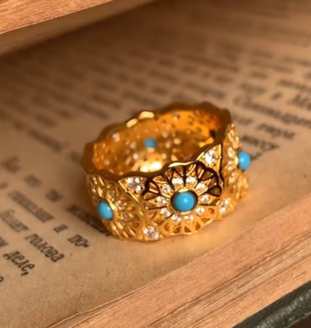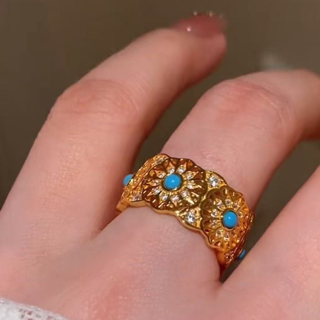 纯银S925中古vintage玫瑰花窗蓝松石戒指时尚轻奢复古高级指环