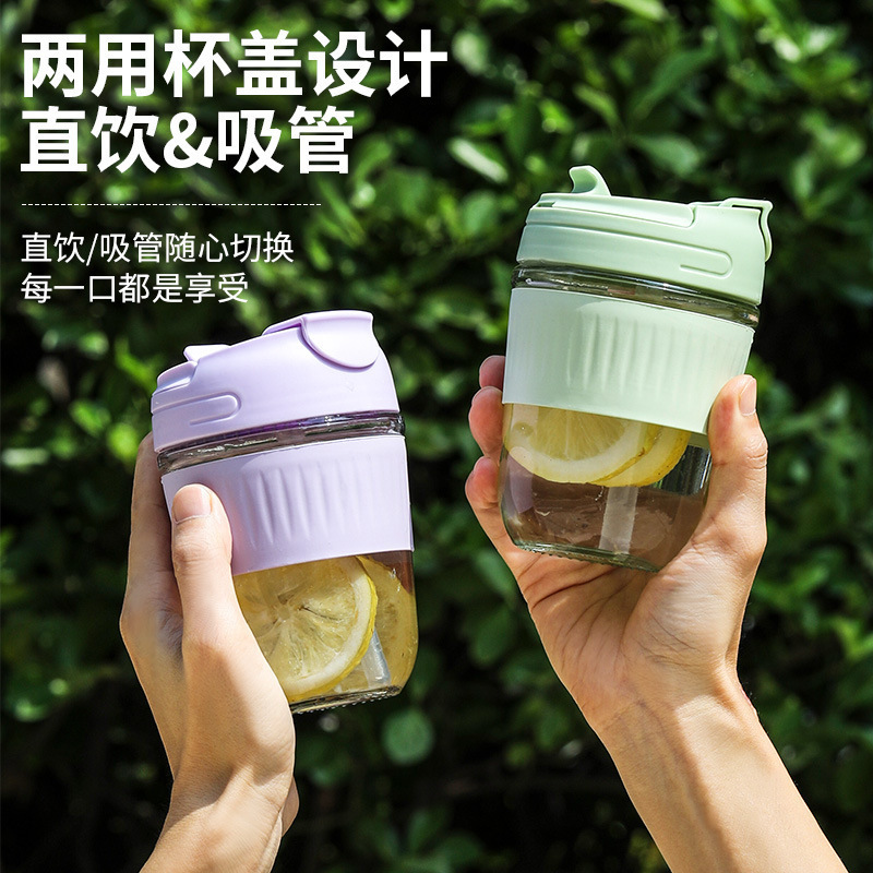 批发双饮玻璃杯高颜值开业地推礼品杯带盖吸管杯办公室咖啡杯水杯