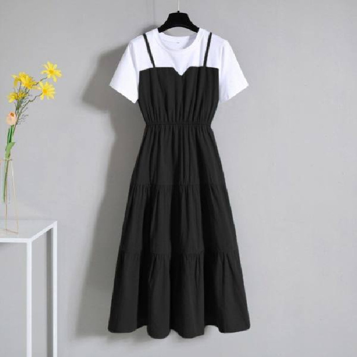 2025夏季大码女装时尚吊带假两件长裙胖妹妹收腰法式短袖连衣裙女