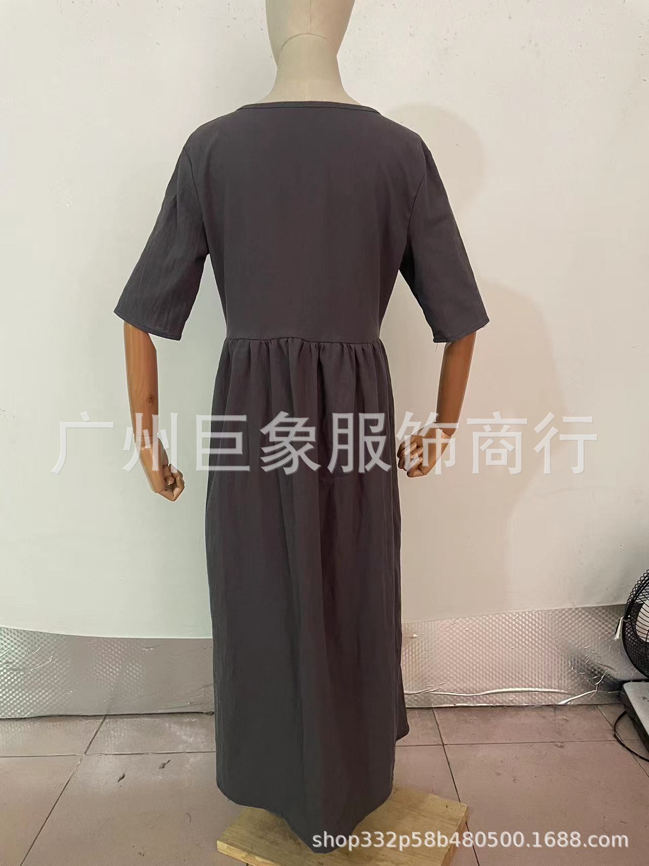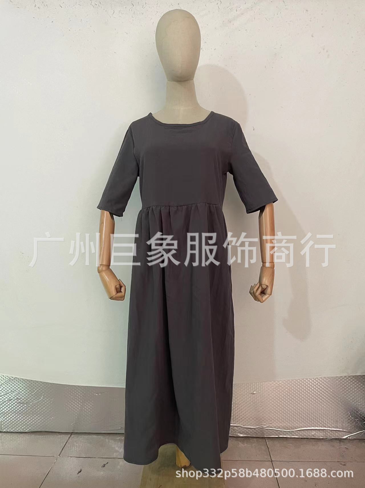 跨境外贸2025春夏新款圆领5分袖大码休闲宽松长款纯色棉麻连衣裙