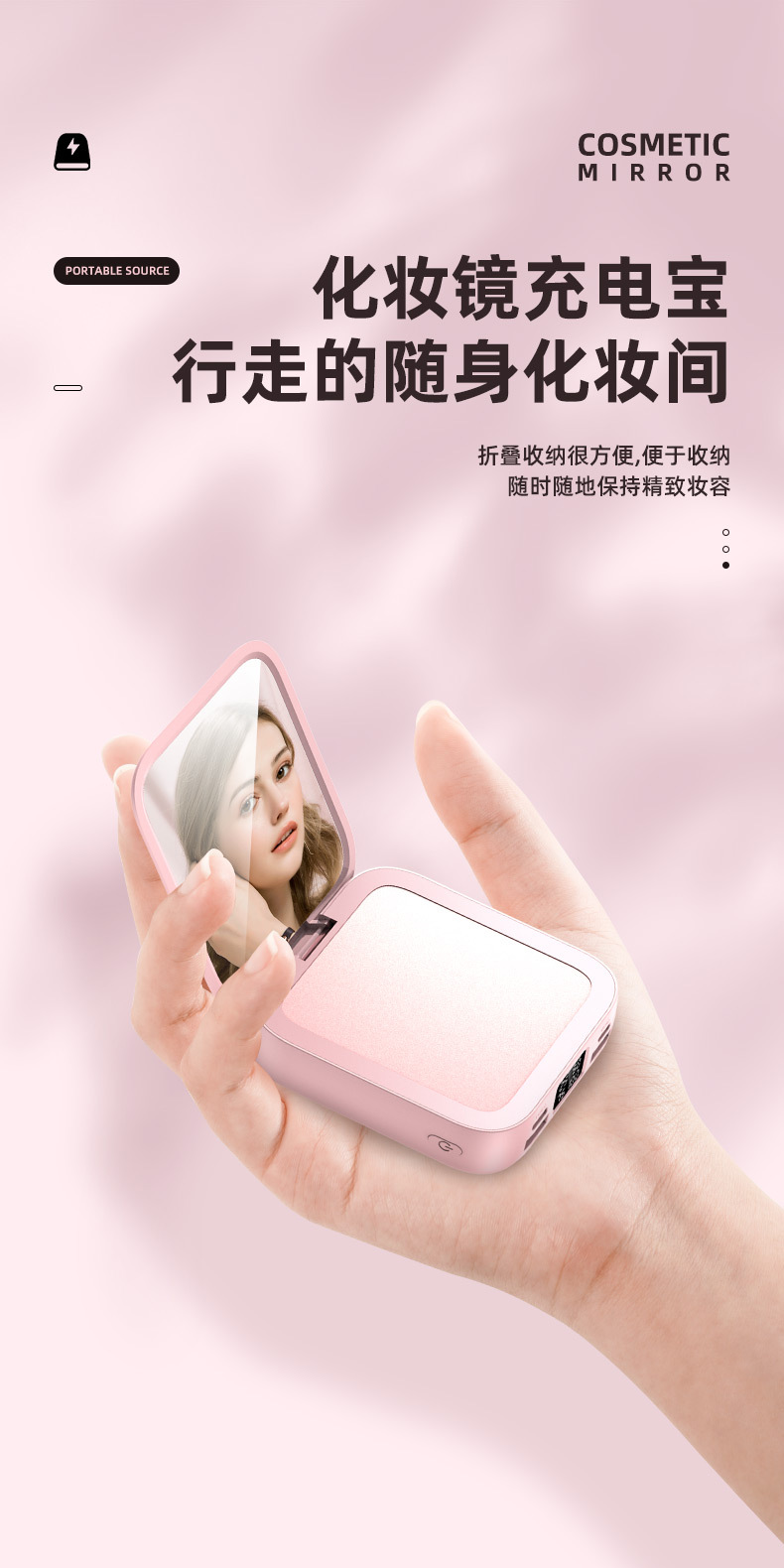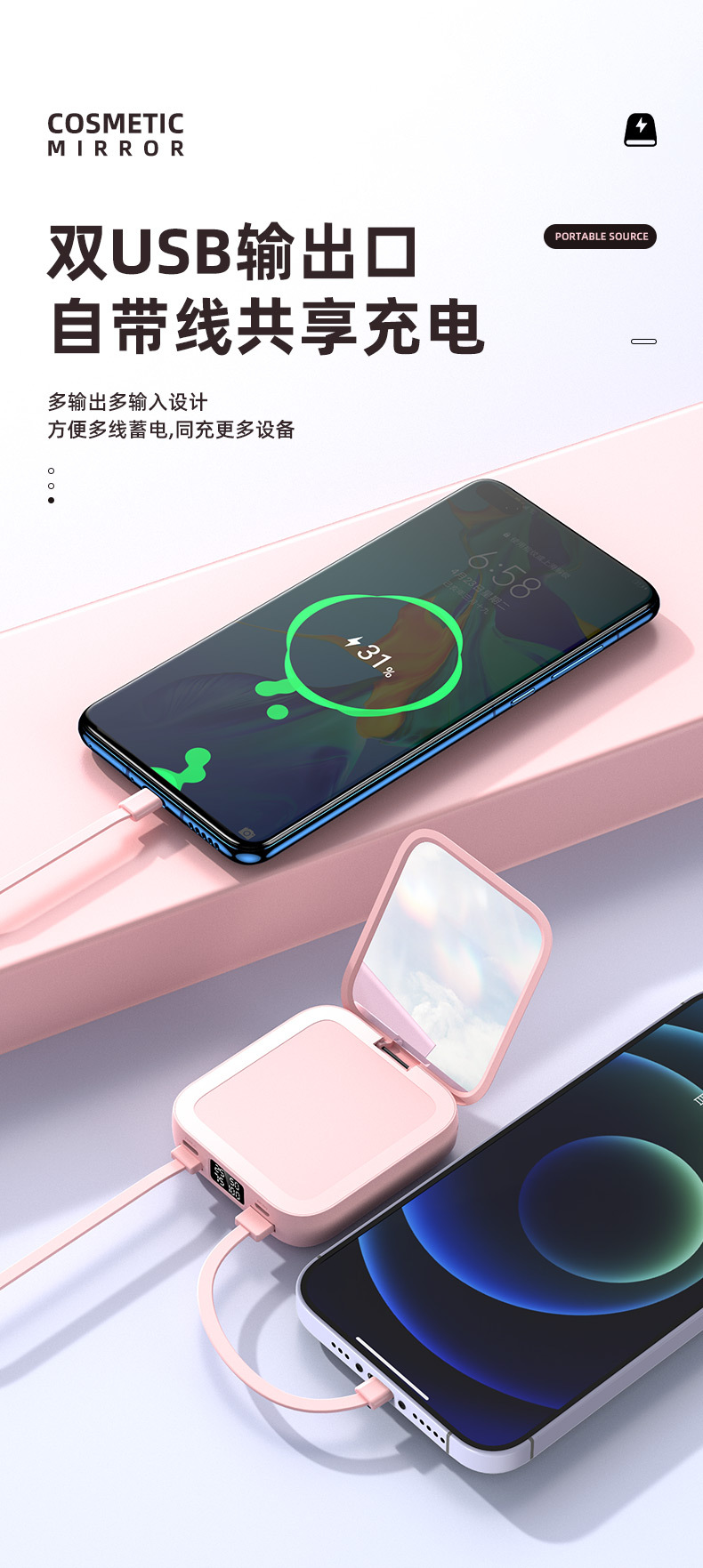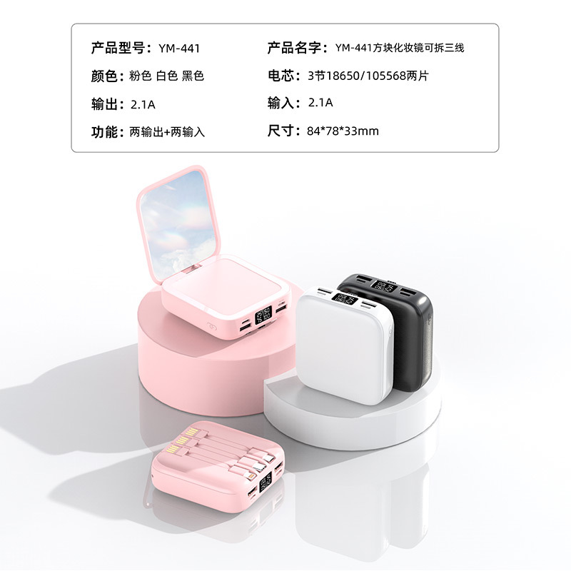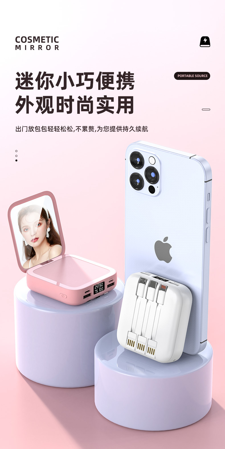 新款迷你化妆镜充电宝批发礼品20000毫安小巧便携自带线移动电源