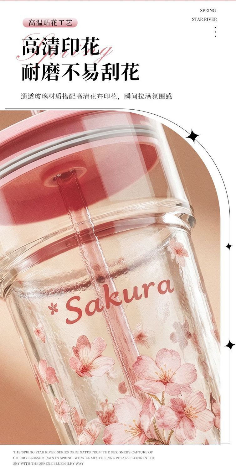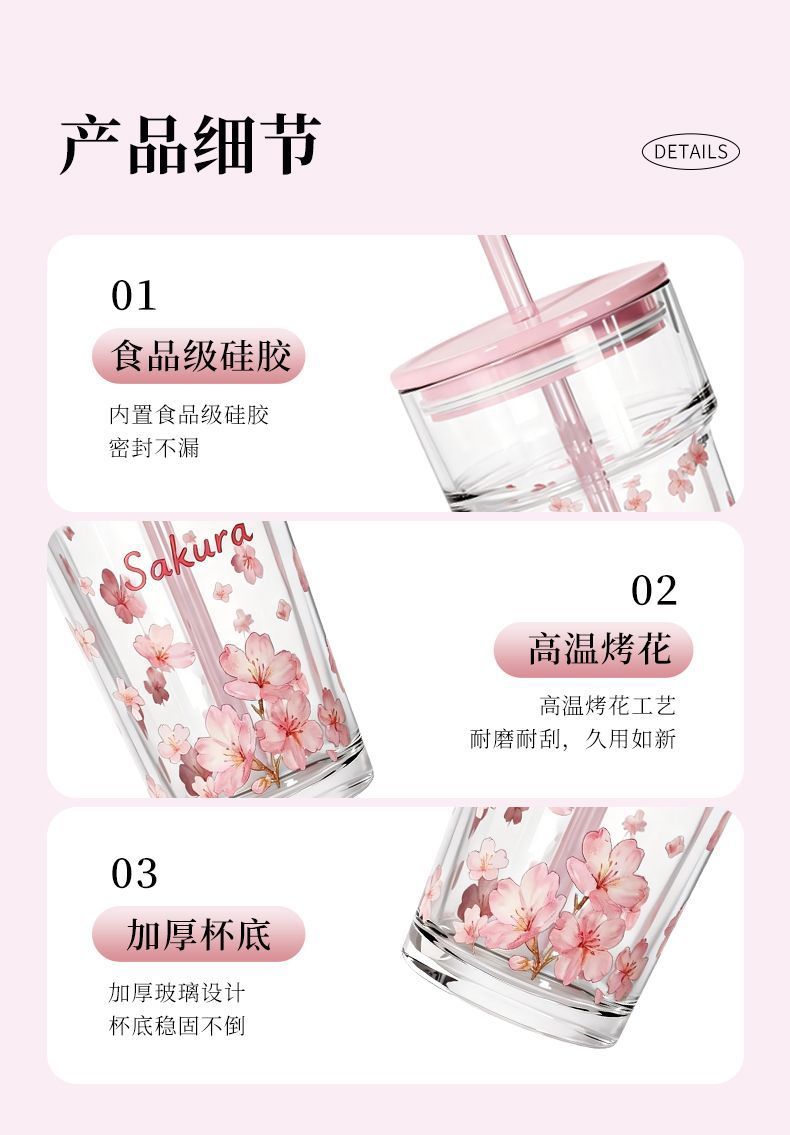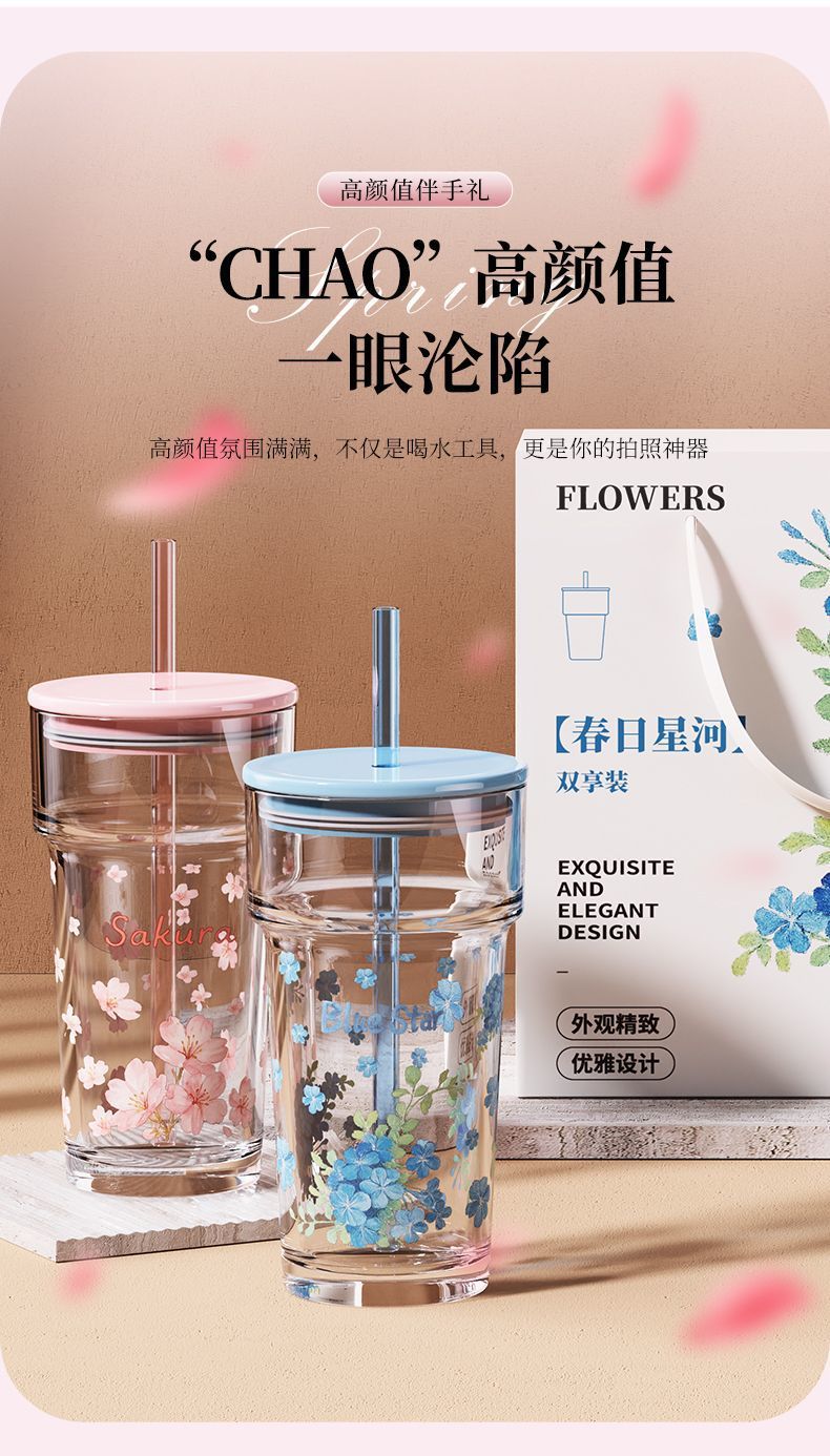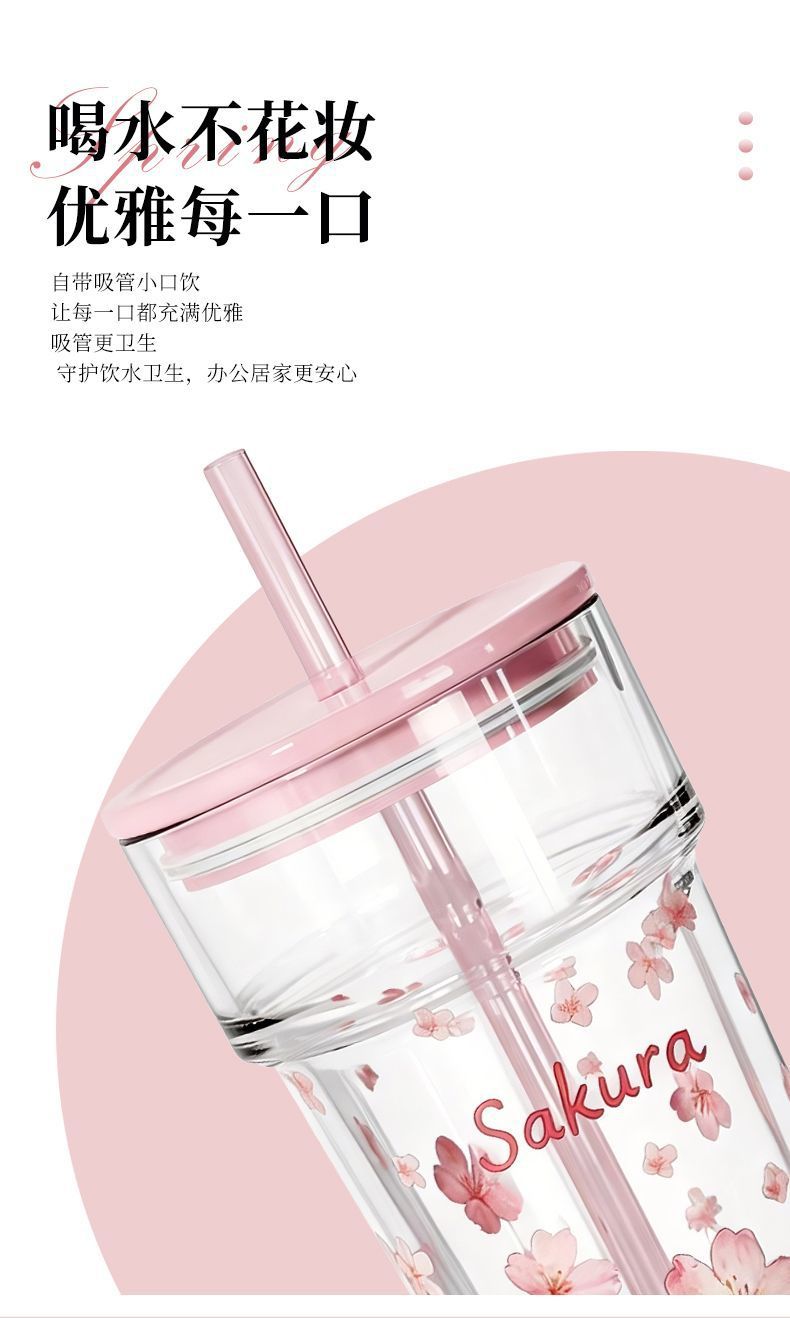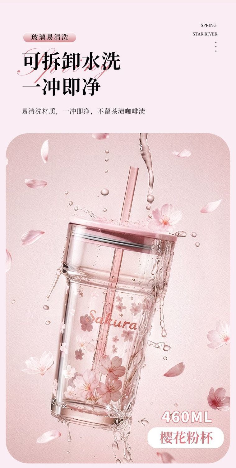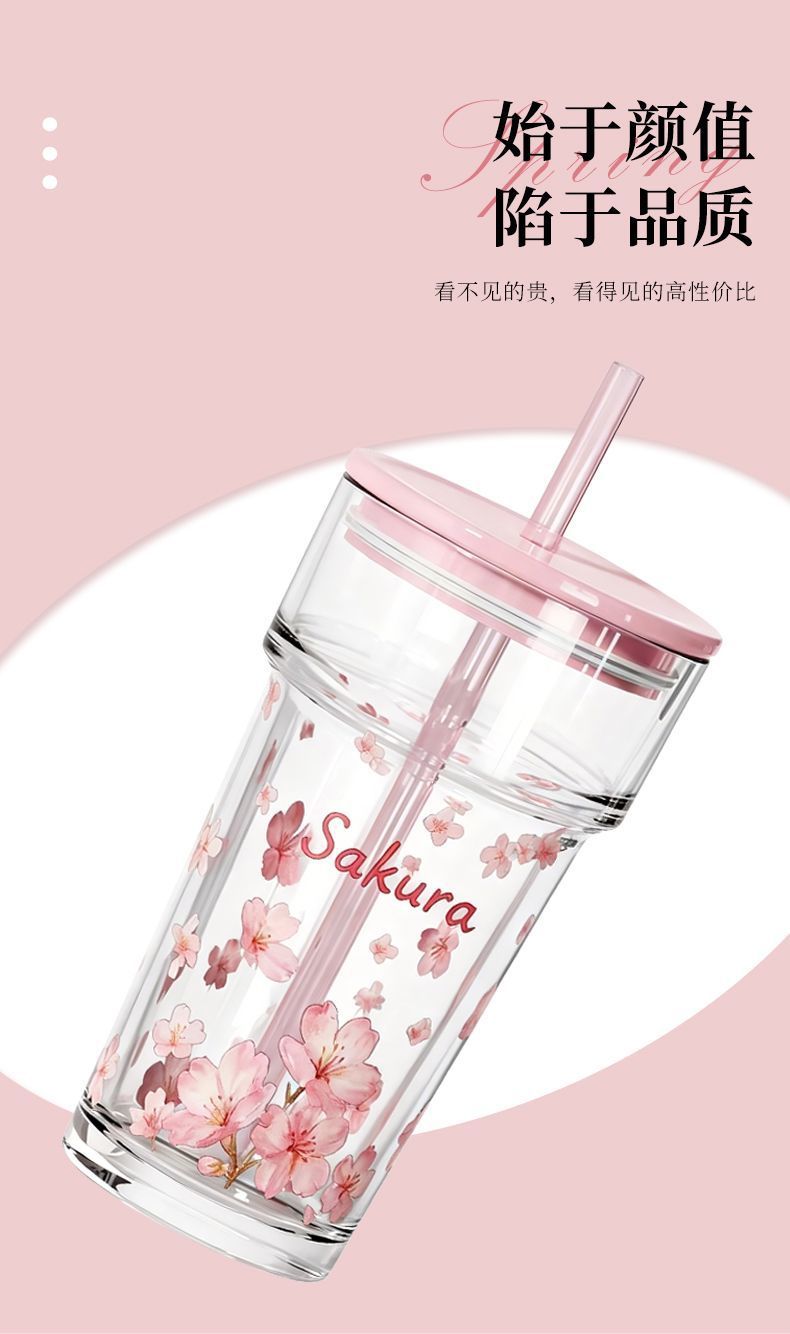 高颜值ins风玻璃杯樱花女生带盖吸管杯耐热耐高温5新水杯子