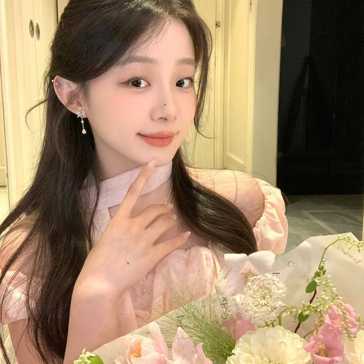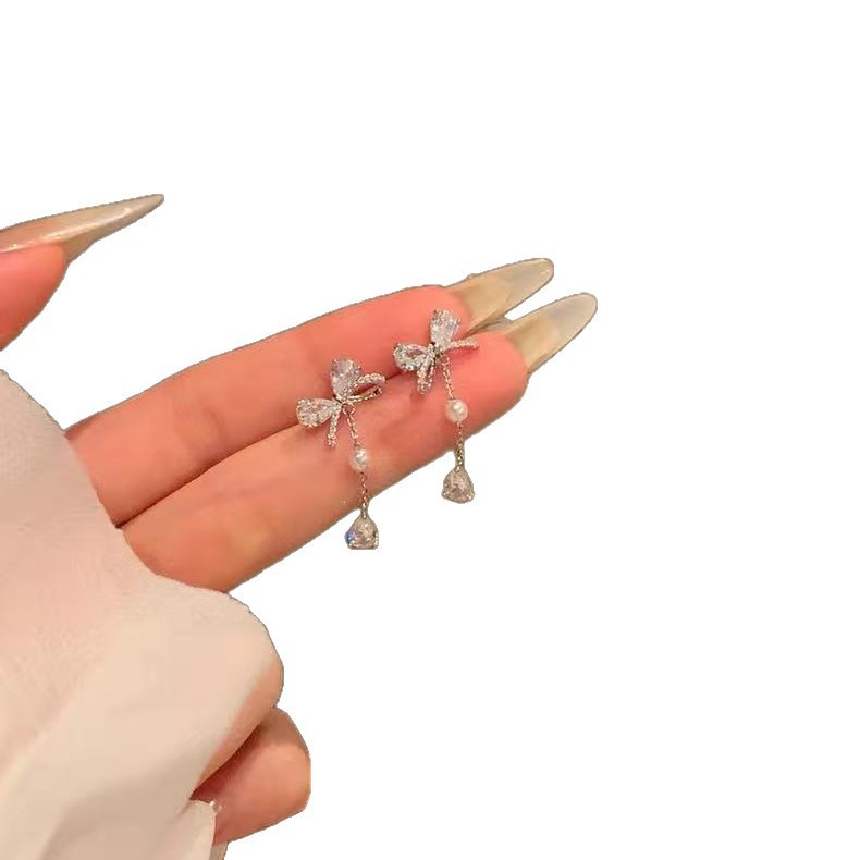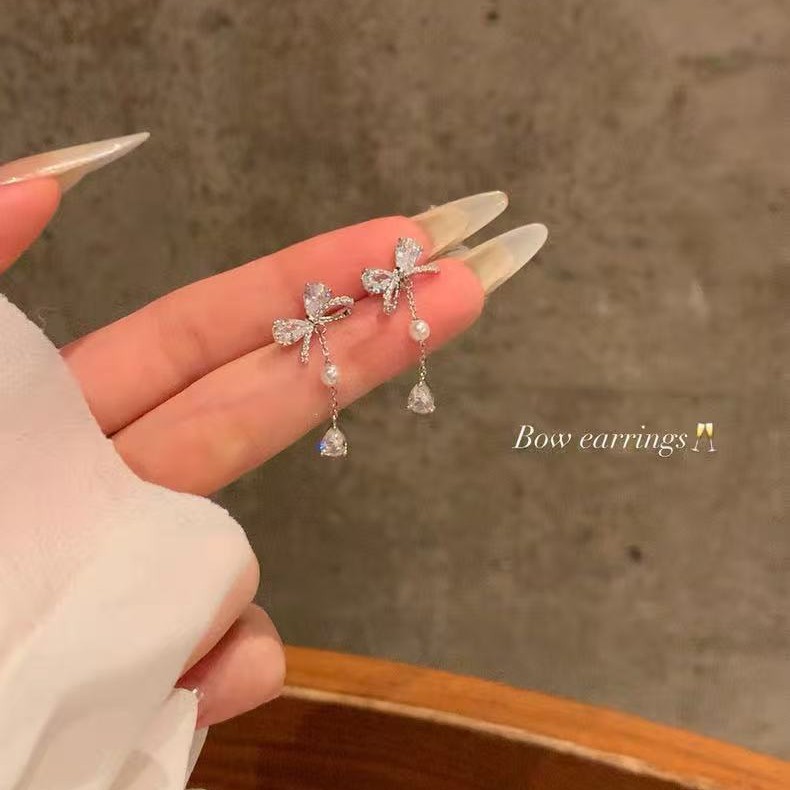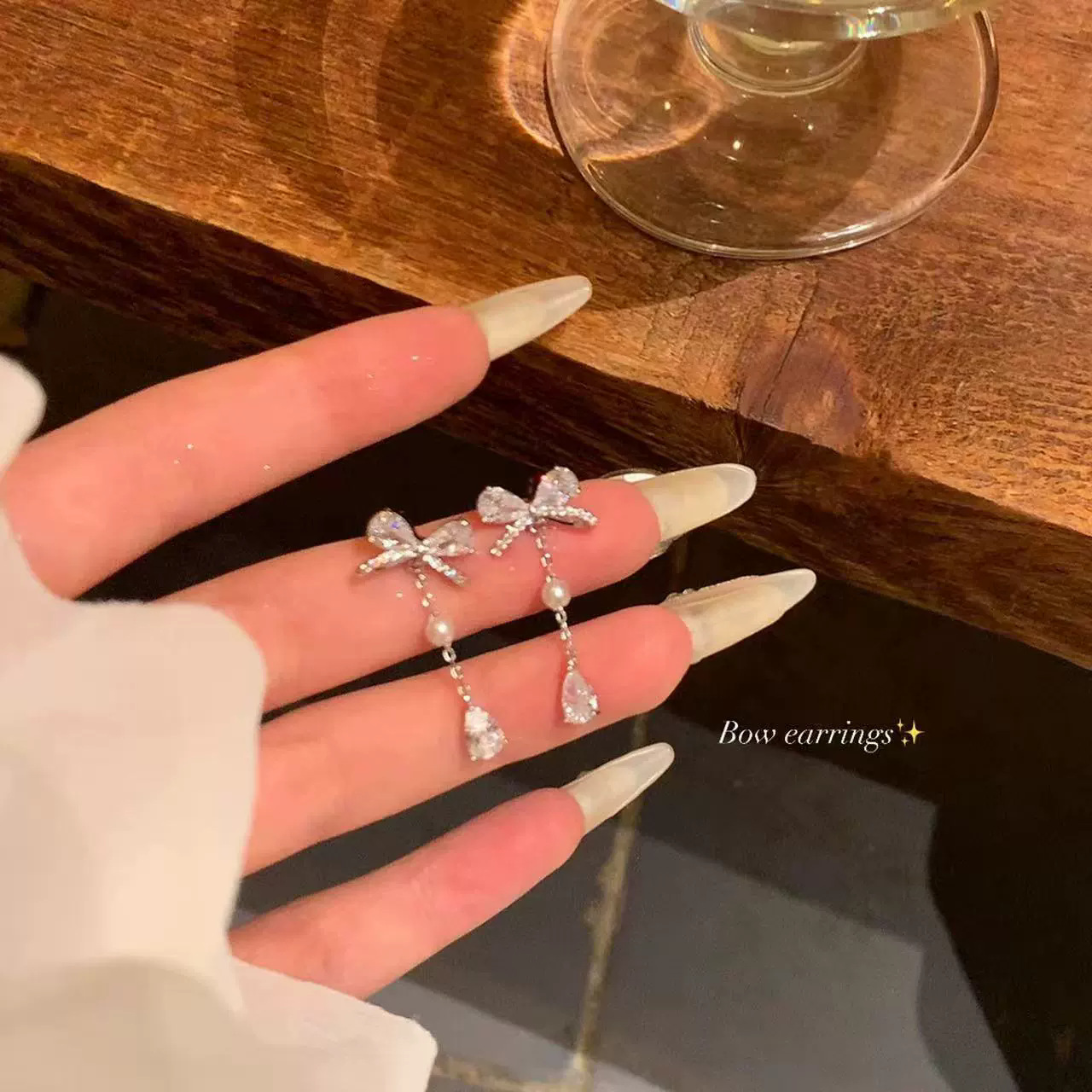 韩系闪锆蝴蝶结水滴吊坠耳环女轻奢气质高级感耳钉独特精致耳饰品