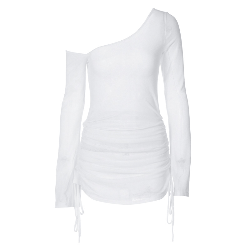 欧美风女装2023秋季新品纯欲辣妹风斜肩长袖性感透视抽褶连衣裙