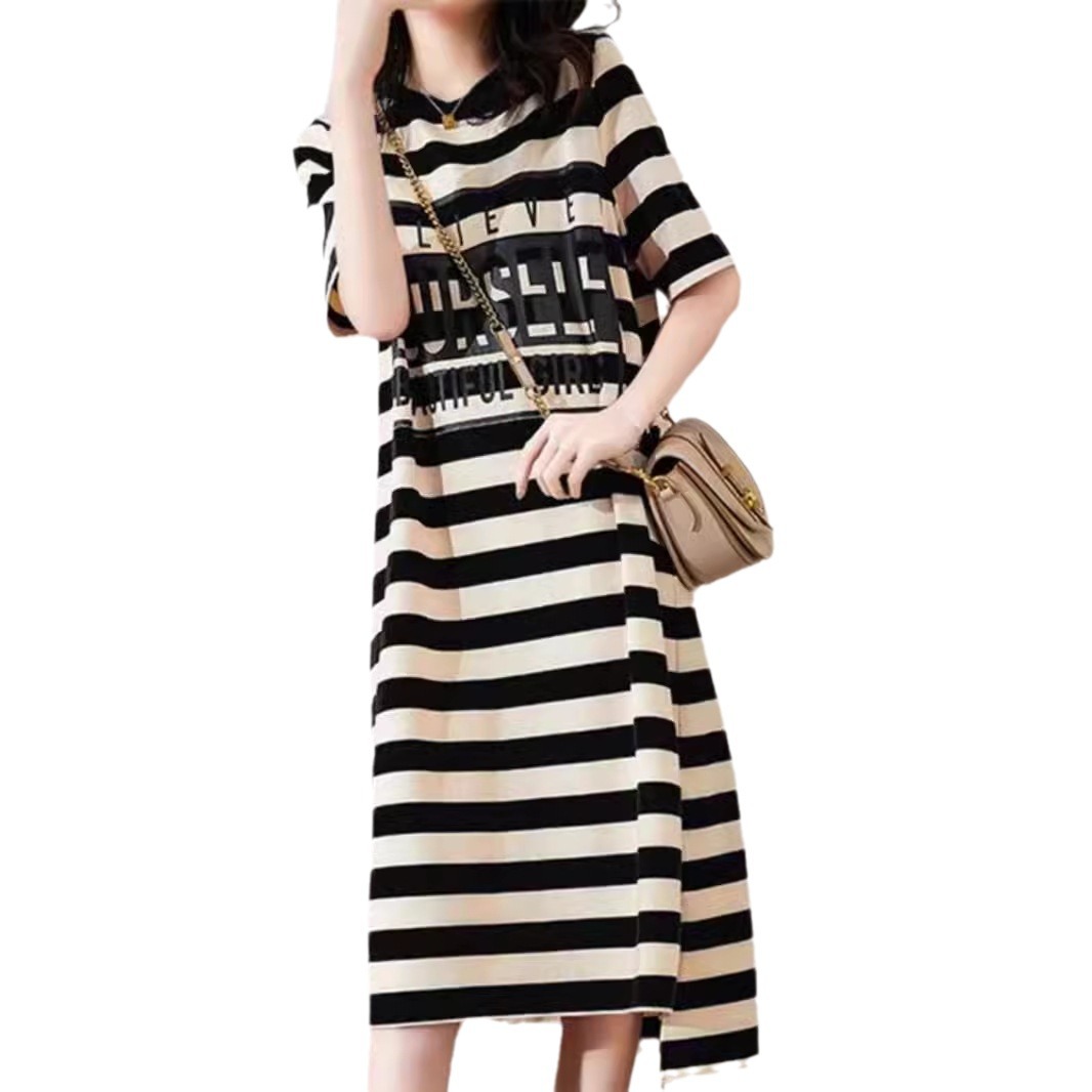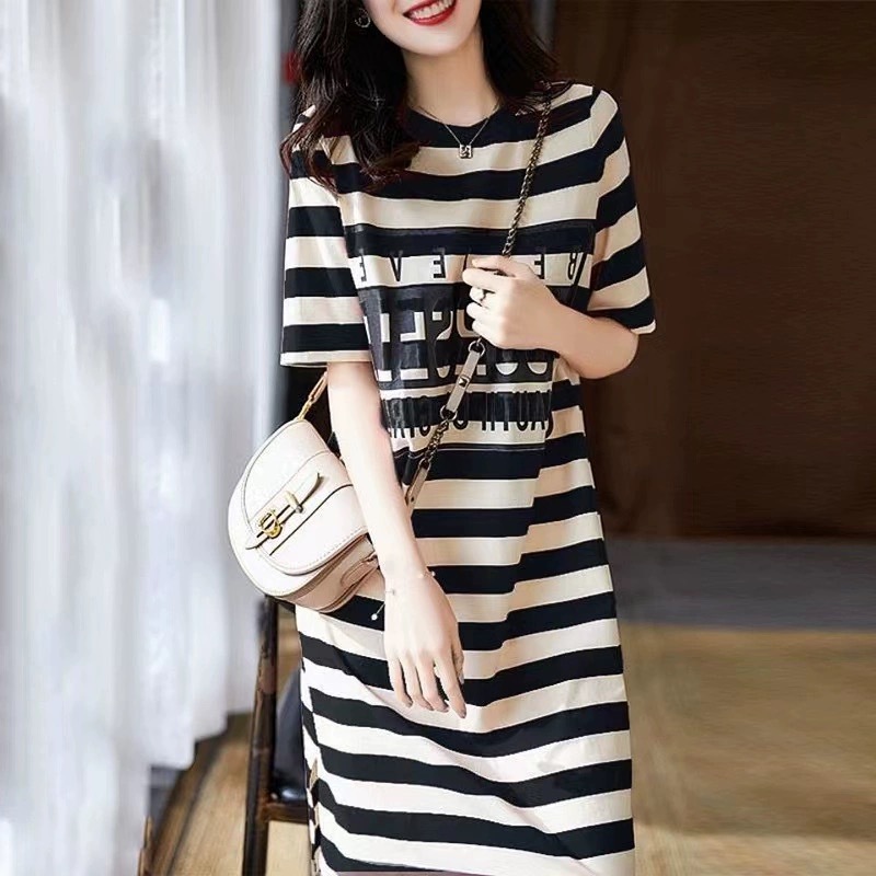 韩版简约圆领条纹宽松短袖正肩T恤女夏慵懒休闲百搭连衣裙中长款
