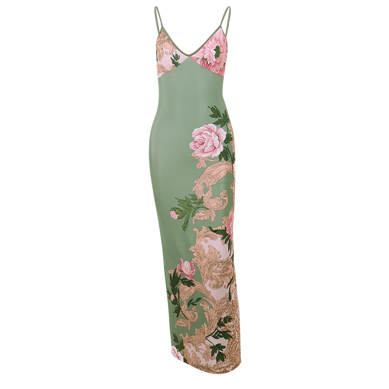 JY23159亚马逊新款V领吊带裙花朵印花性感修身露背气质辣妹连衣裙