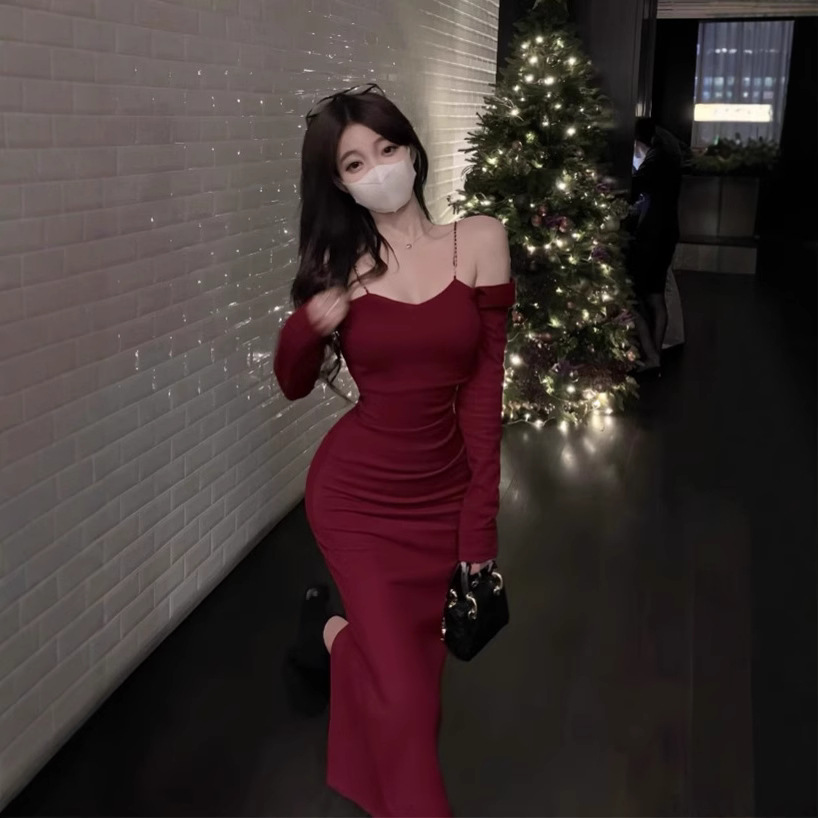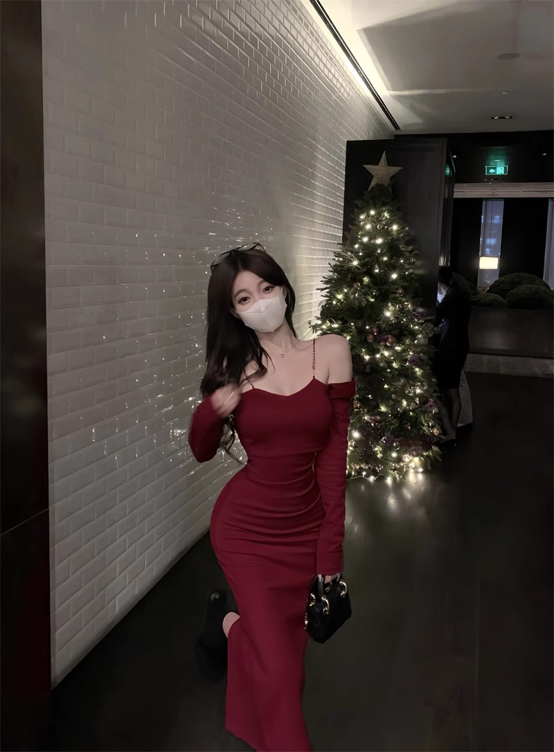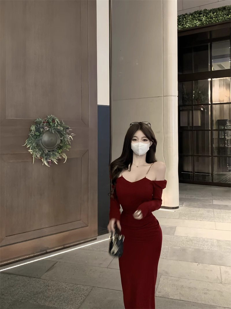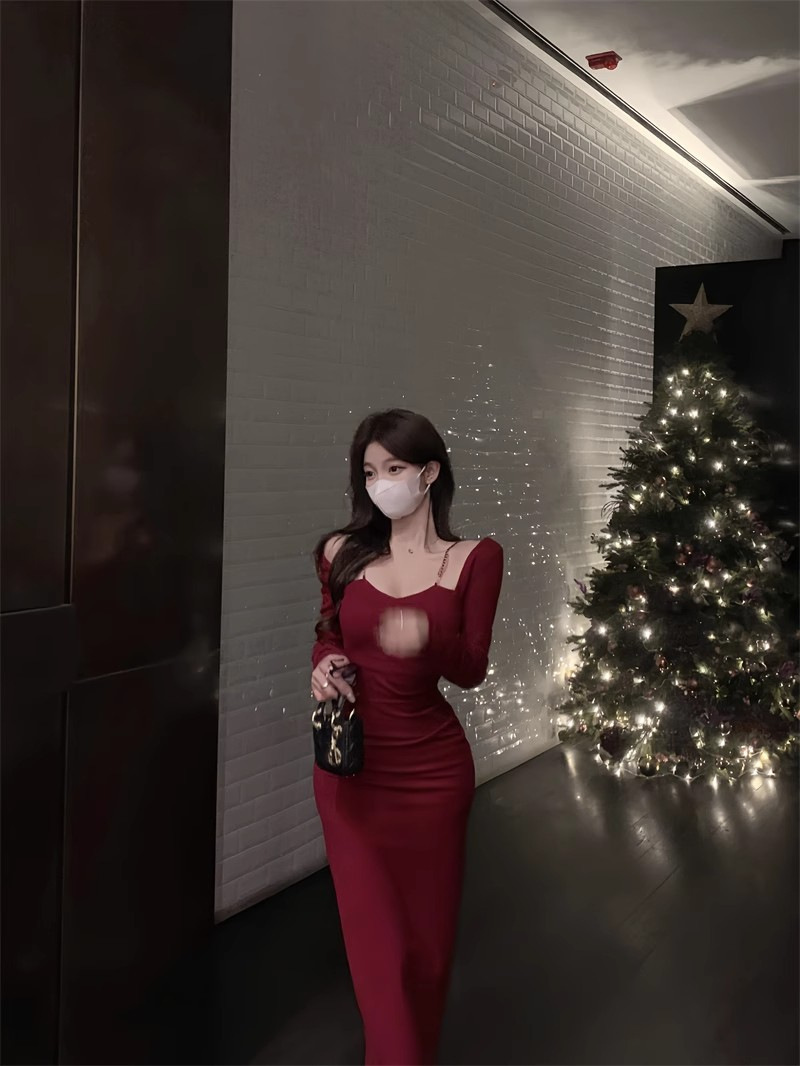2025会战袍酒红色包臀长裙女内搭打底裙显瘦紧身链条方领连衣裙