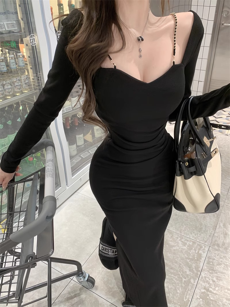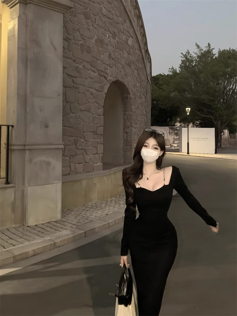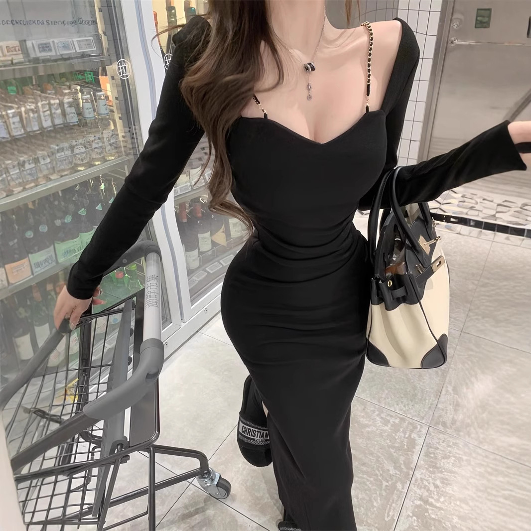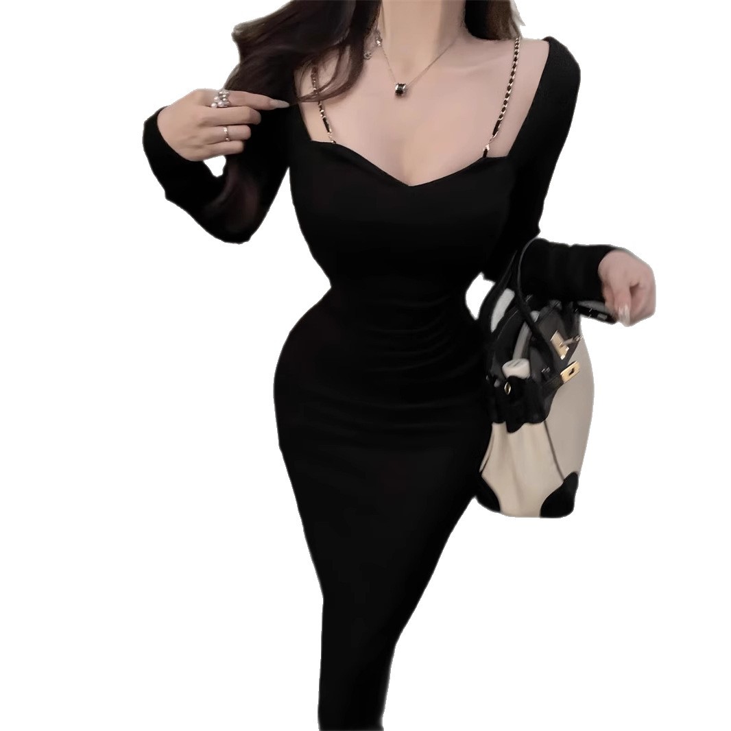 2025会战袍酒红色包臀长裙女内搭打底裙显瘦紧身链条方领连衣裙