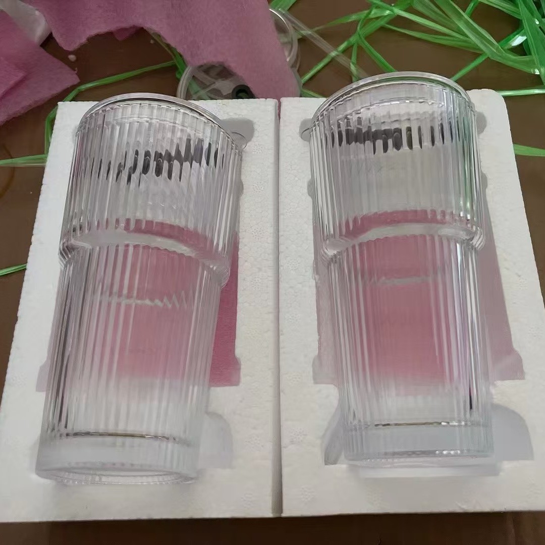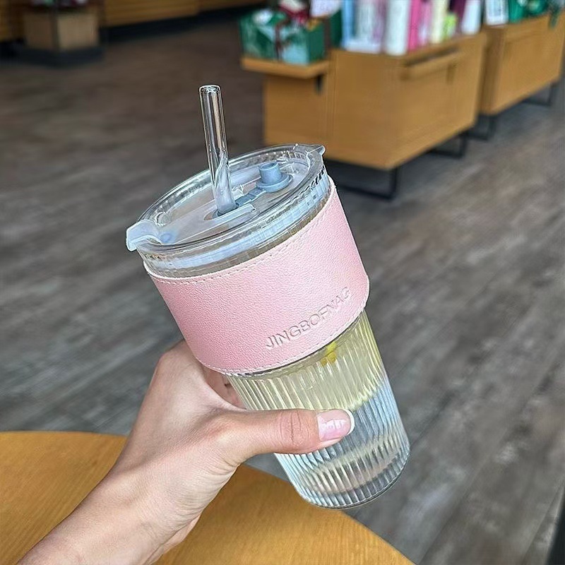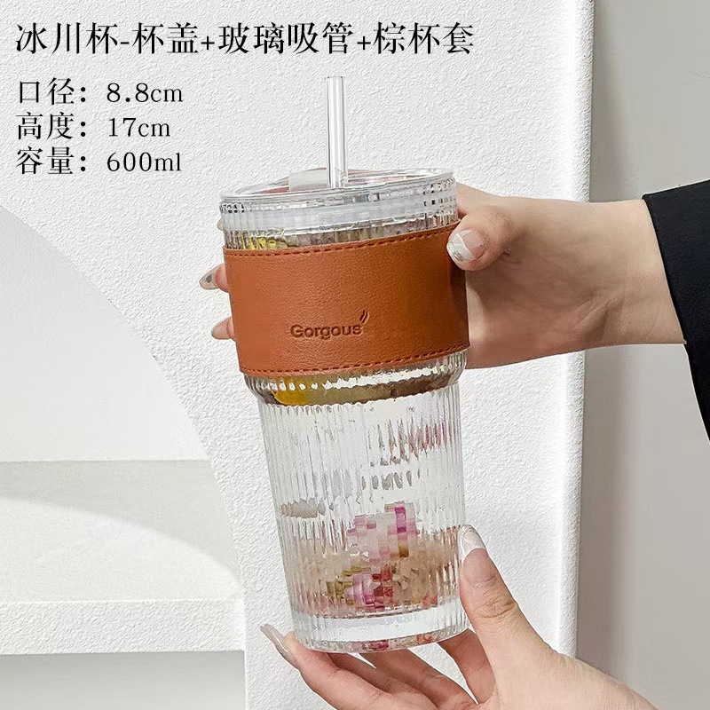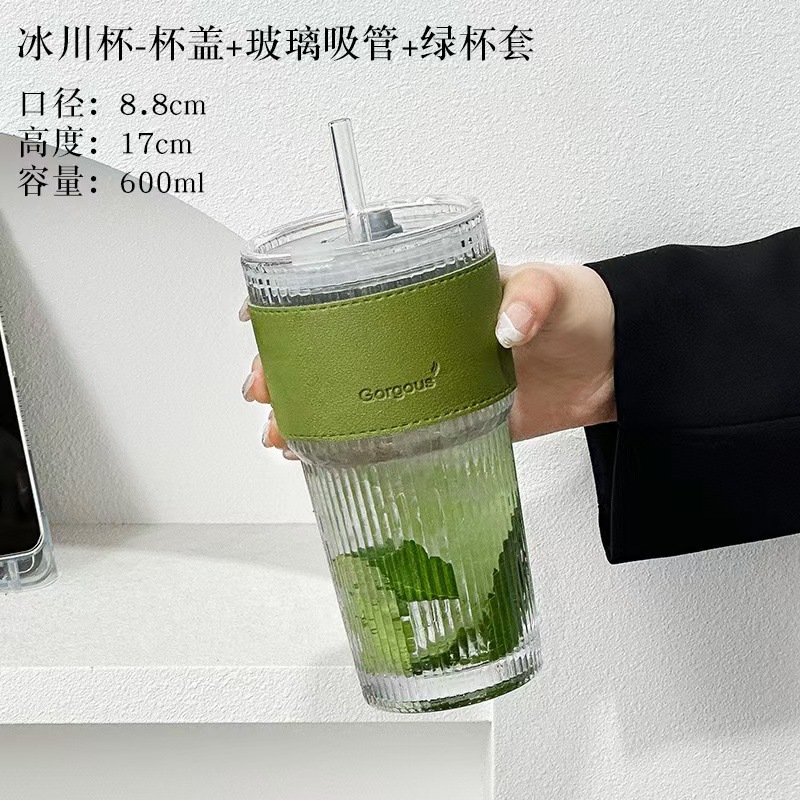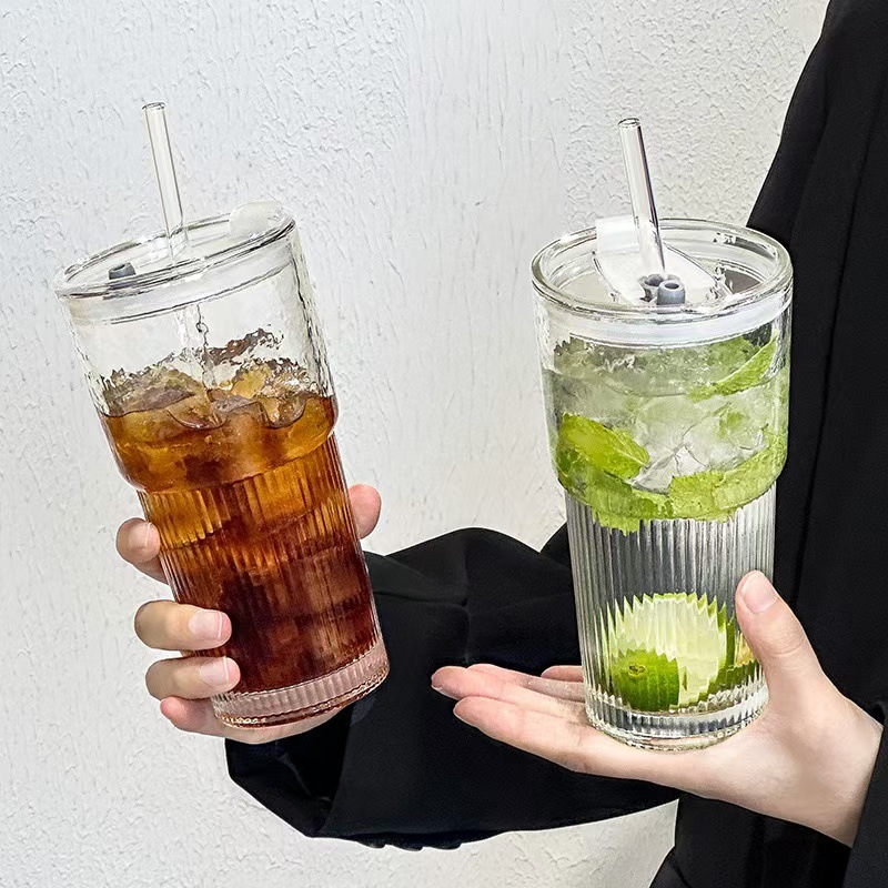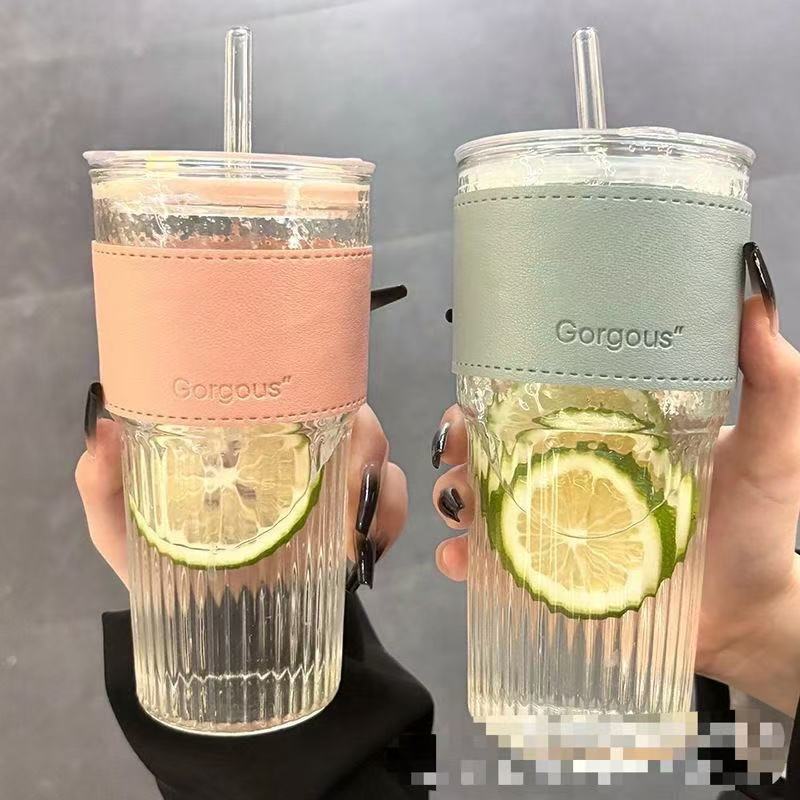 大容量带盖玻璃吸管杯家用办公室高颜值男女冷饮果汁高竹节咖啡杯