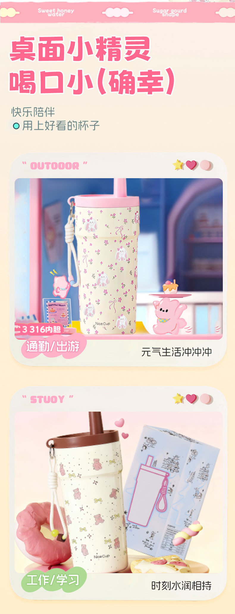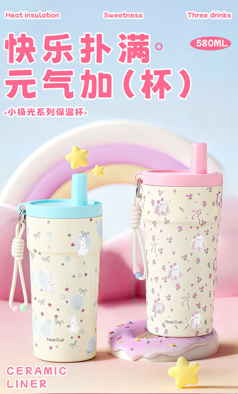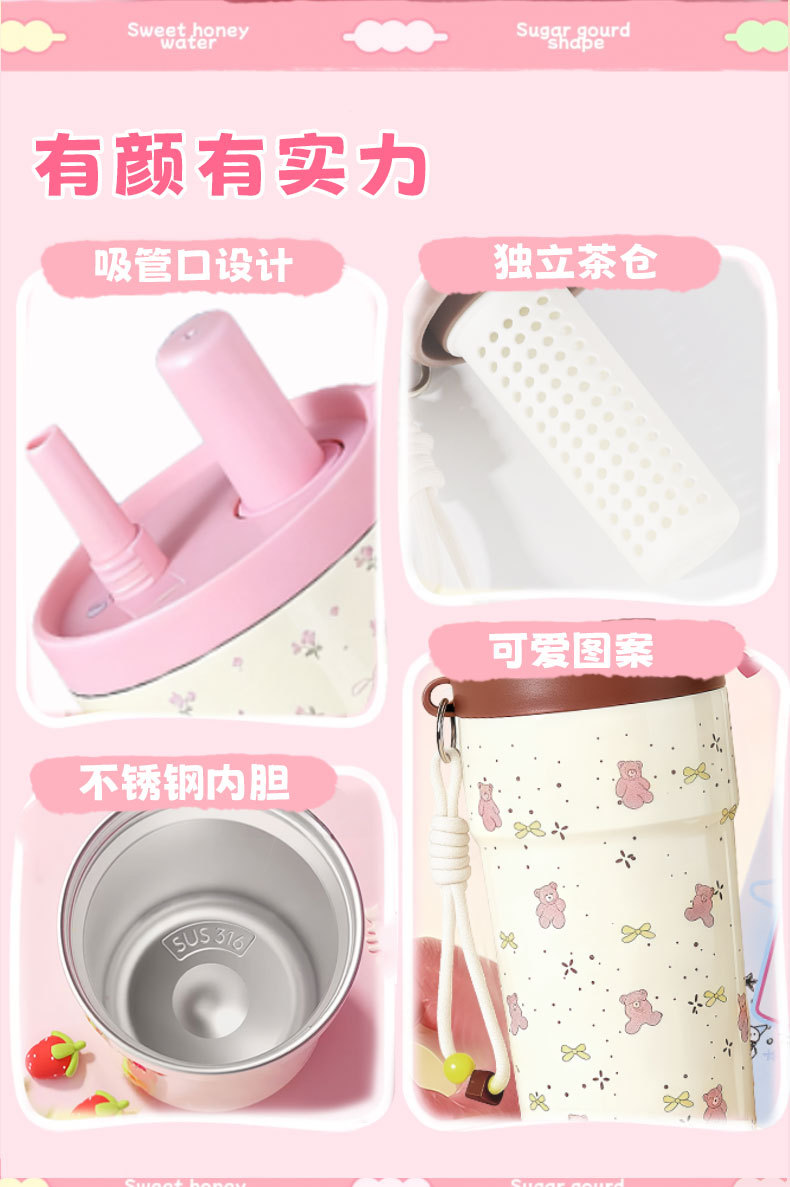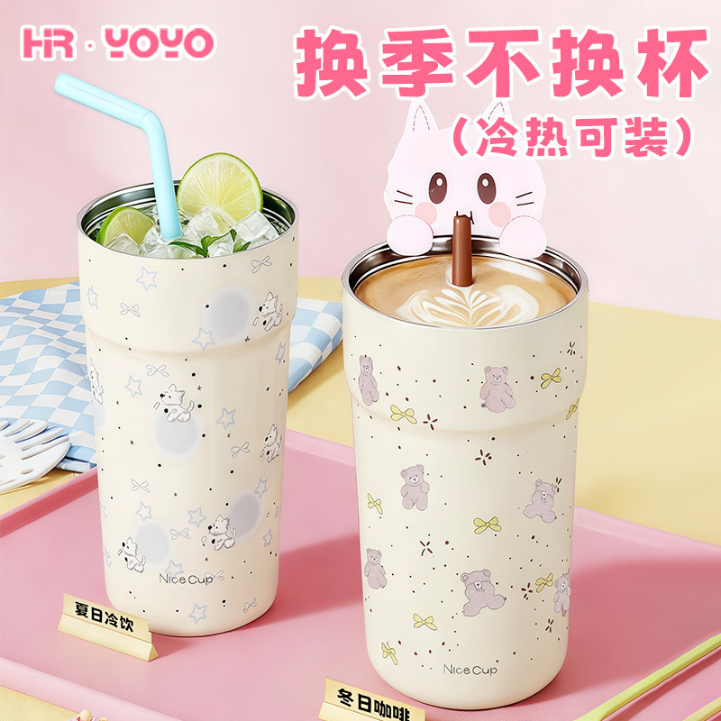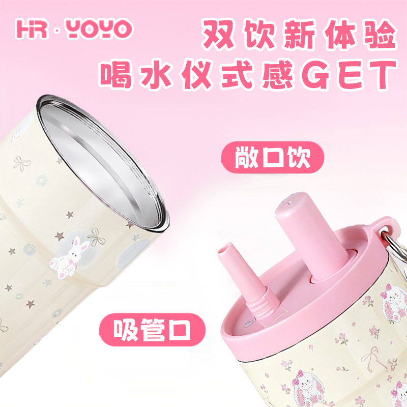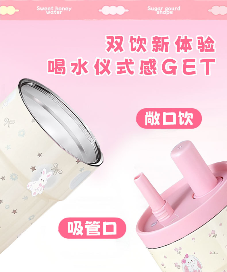 新款卡通保温杯女生学生手提保冷杯可爱办公小巧便携双饮吸管杯
