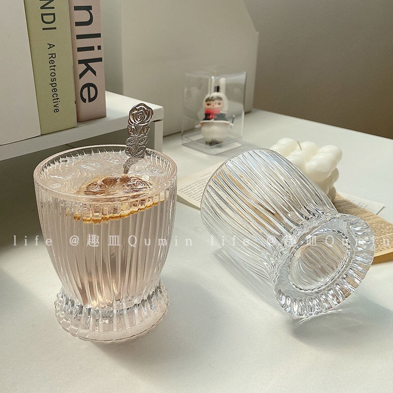 竖纹浮雕纹理感玻璃杯~水杯果汁饮料杯冰咖啡杯啤酒杯礼品杯子